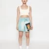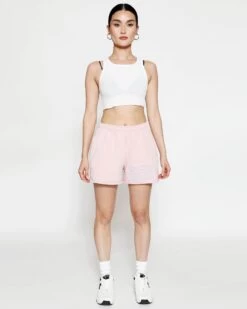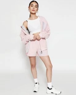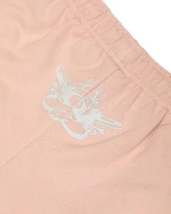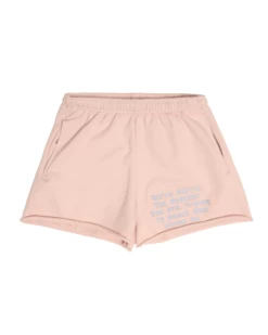 French terry fabric in dusty pink. Mid-rise shorts with interior adjustable drawstring, side pockets, and a raw edge hem. Features puff print and embroidered details.