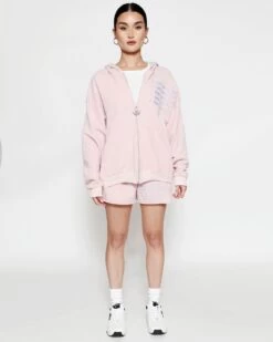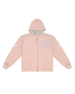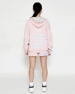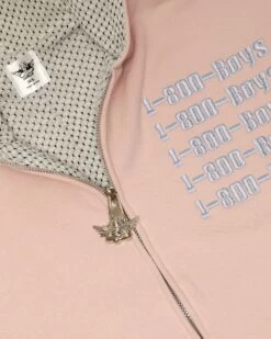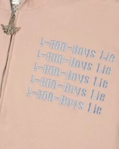 French terry fabric in dusty pink. Oversized zip up hoodie with inside lining, front pockets, and ribbed cuffs. Features extra large Boys Lie logo zipper pull, puff print and embroidered details.
