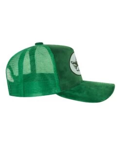 Green trucker hat with light blue patch and velour fabric. Adjustable snapback.Â
