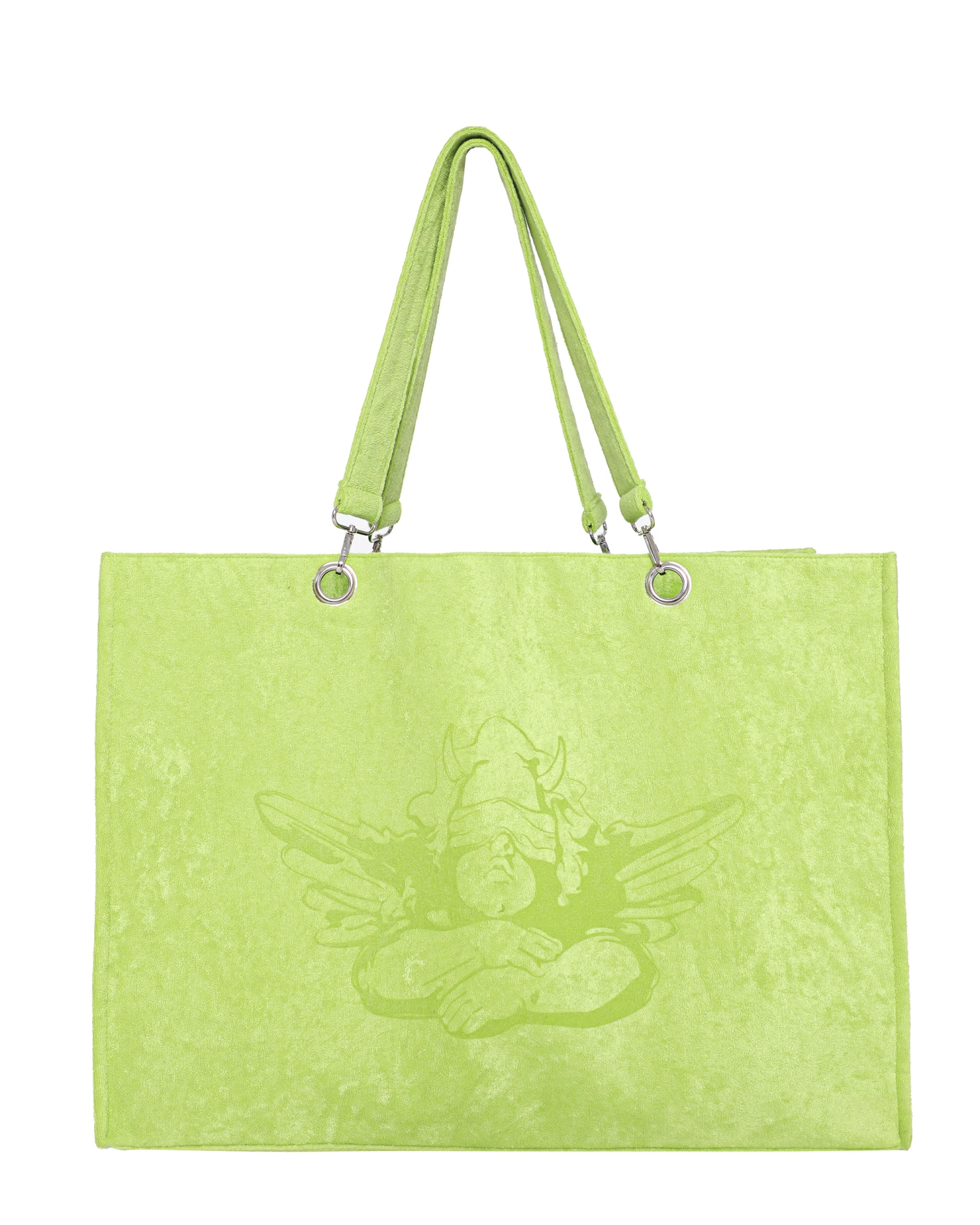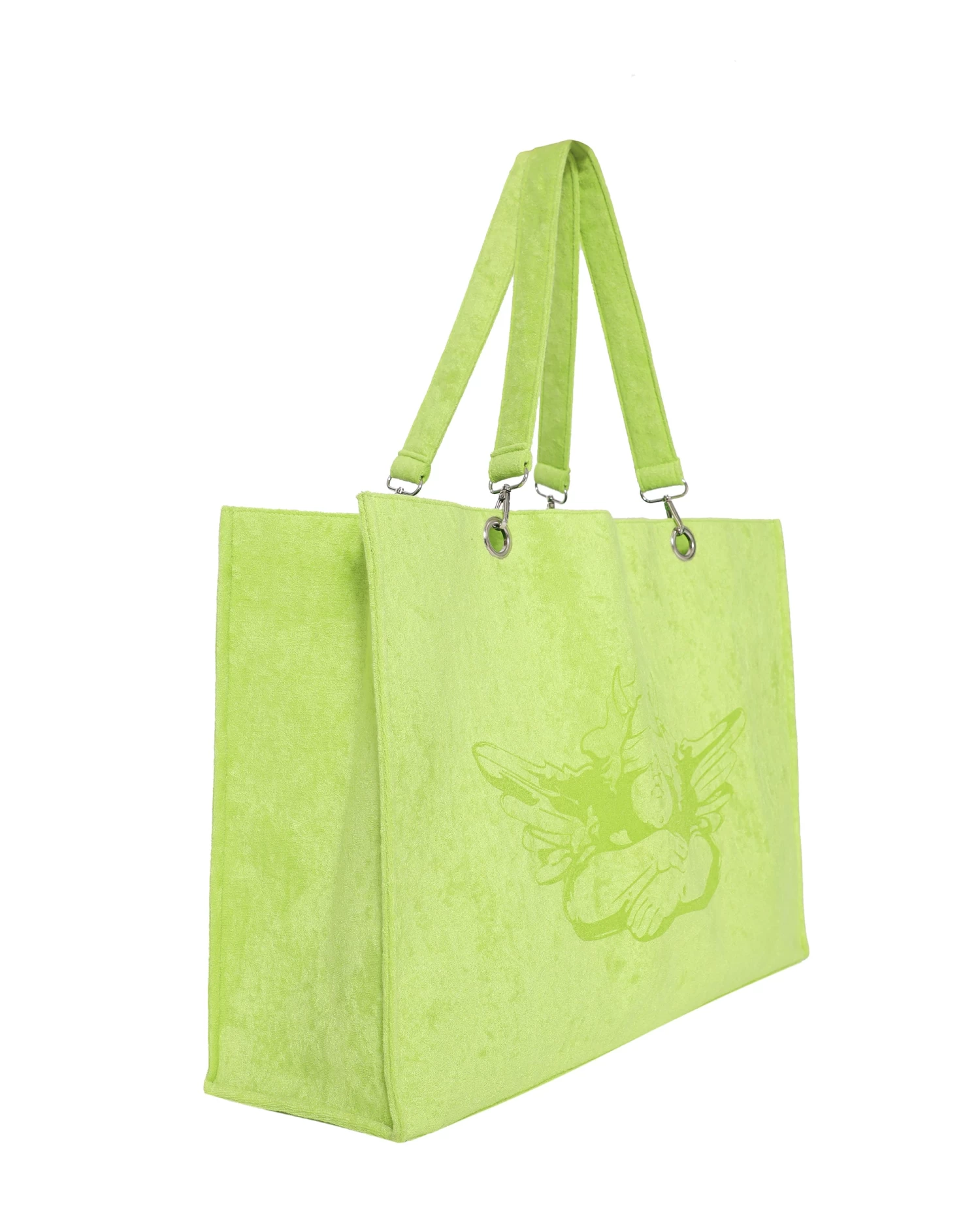 Oversized bright green terry cloth structured tote. Small interior pocket, silver hardware, and magnetic closure.Â
