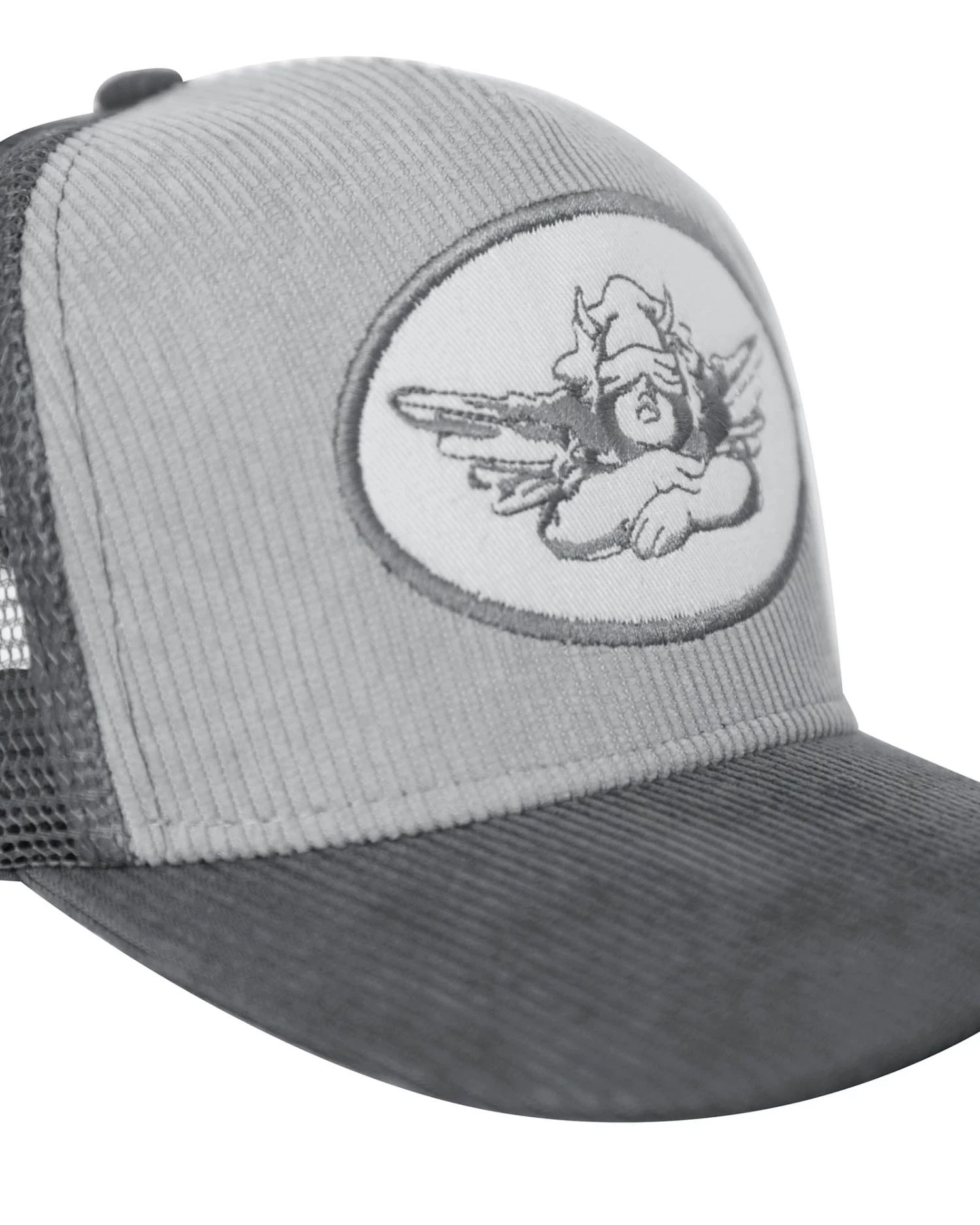 Grey corduroy trucker hat with monochromatic patch. Adjustable snapback.Â