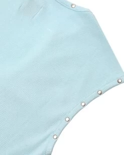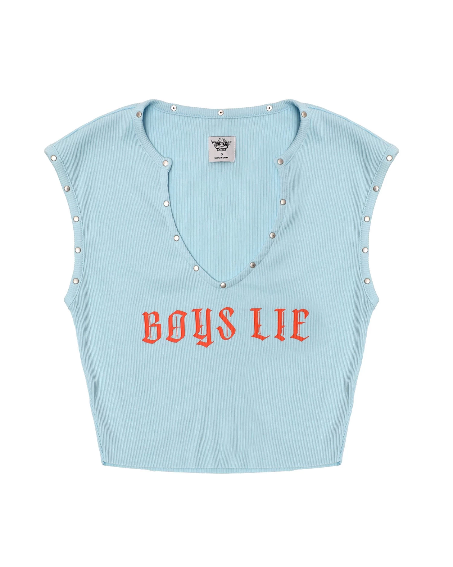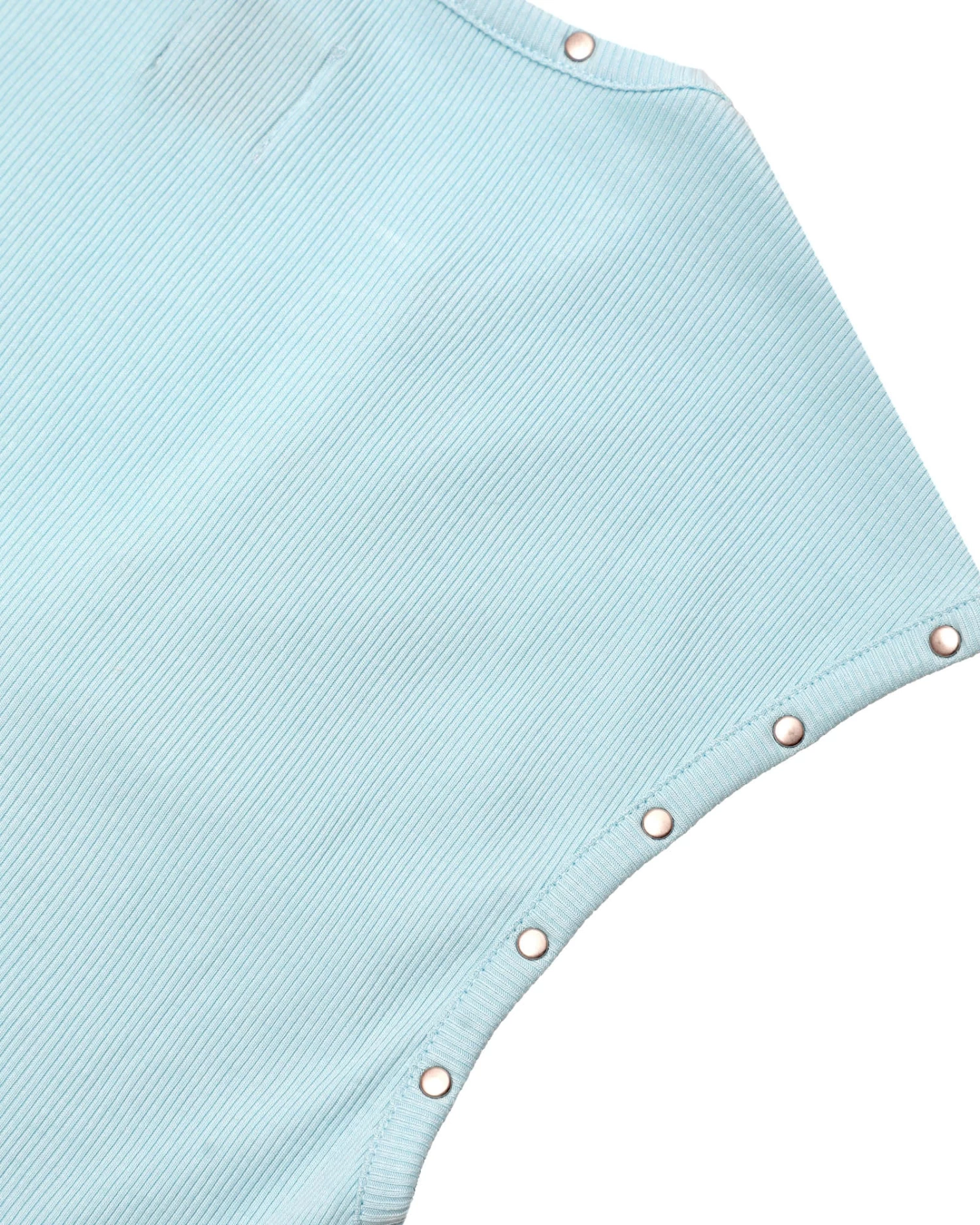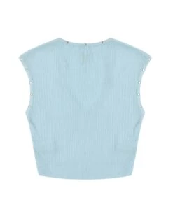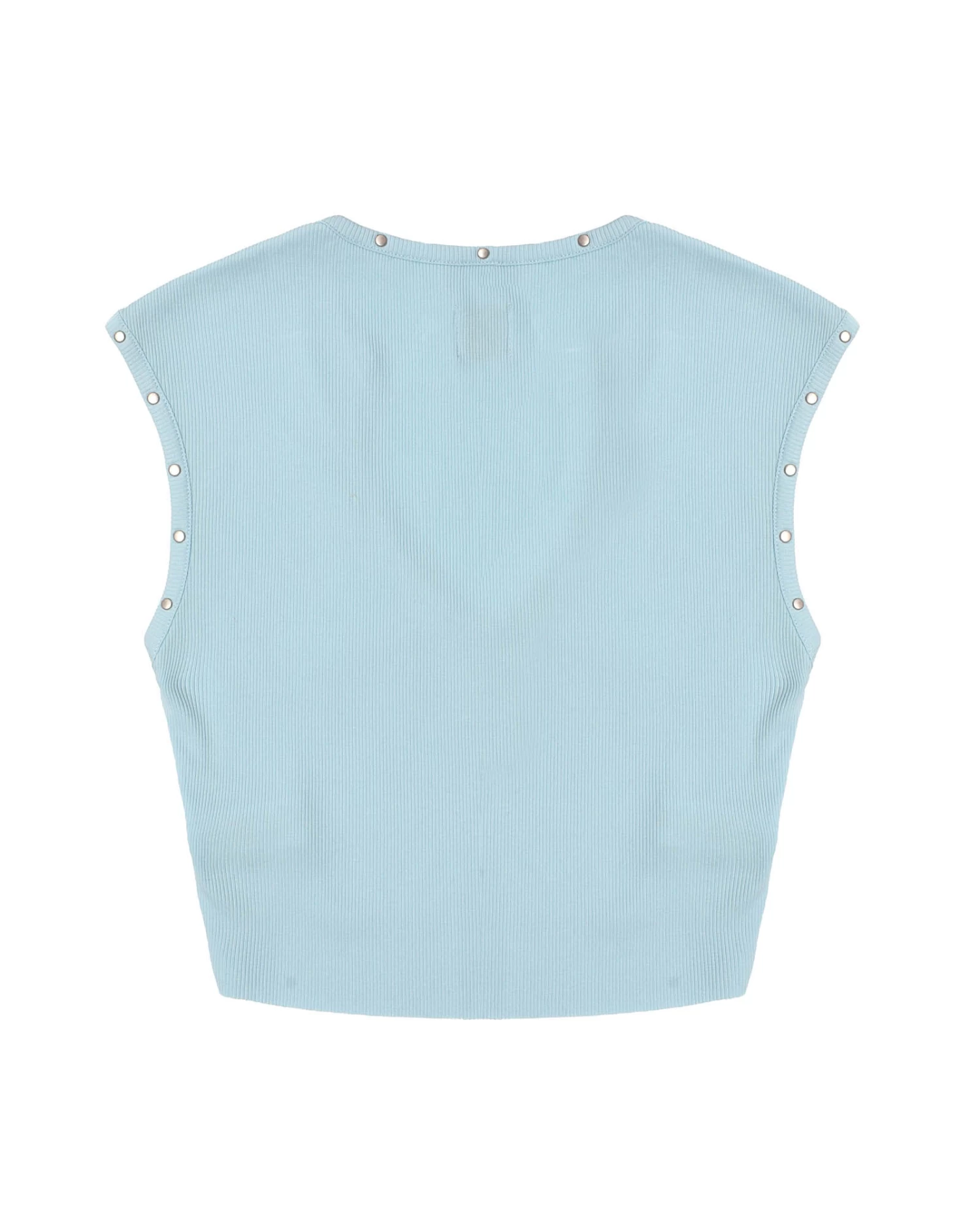 Blue ribbed crop tank with a V neckline and silver stud details.Â