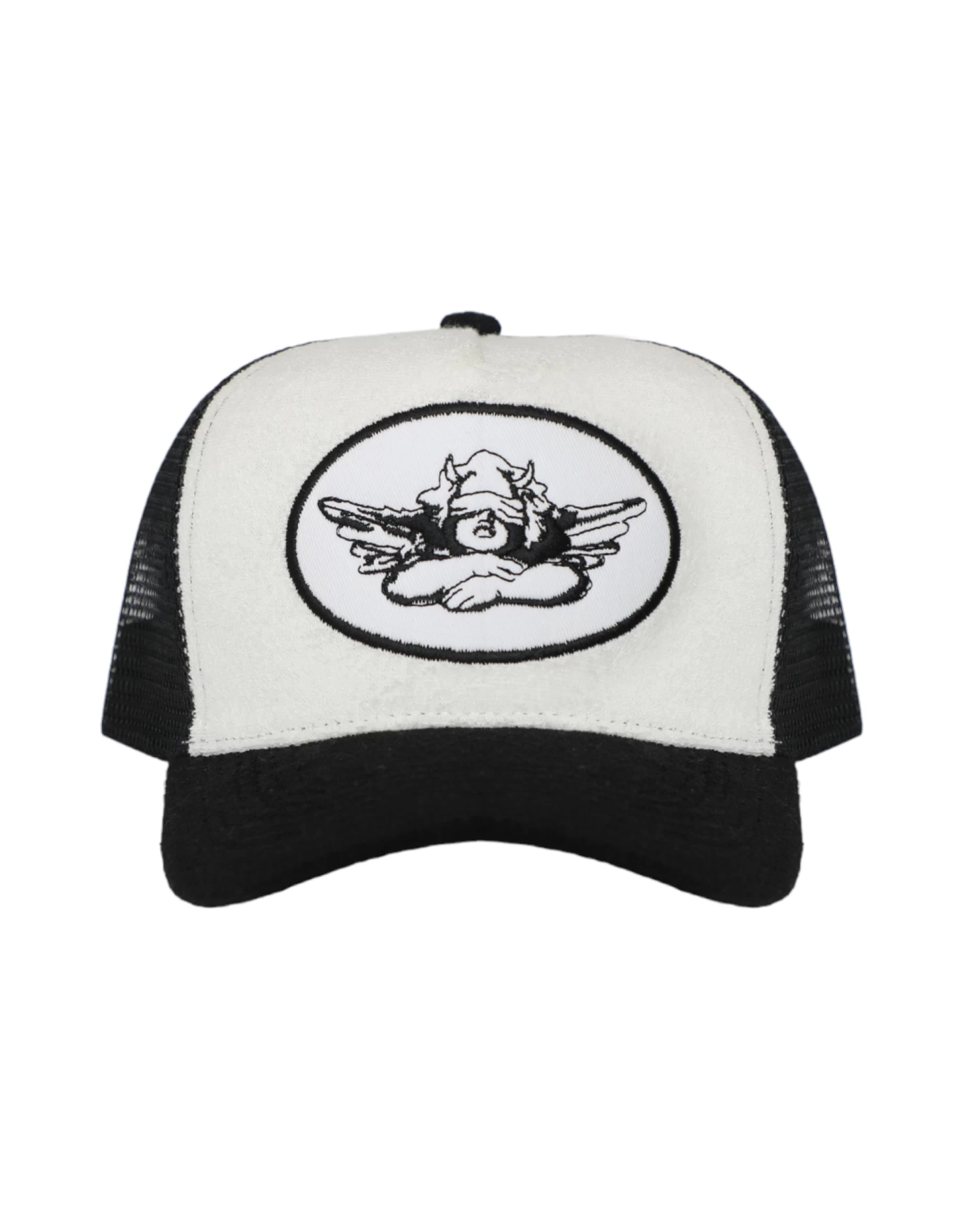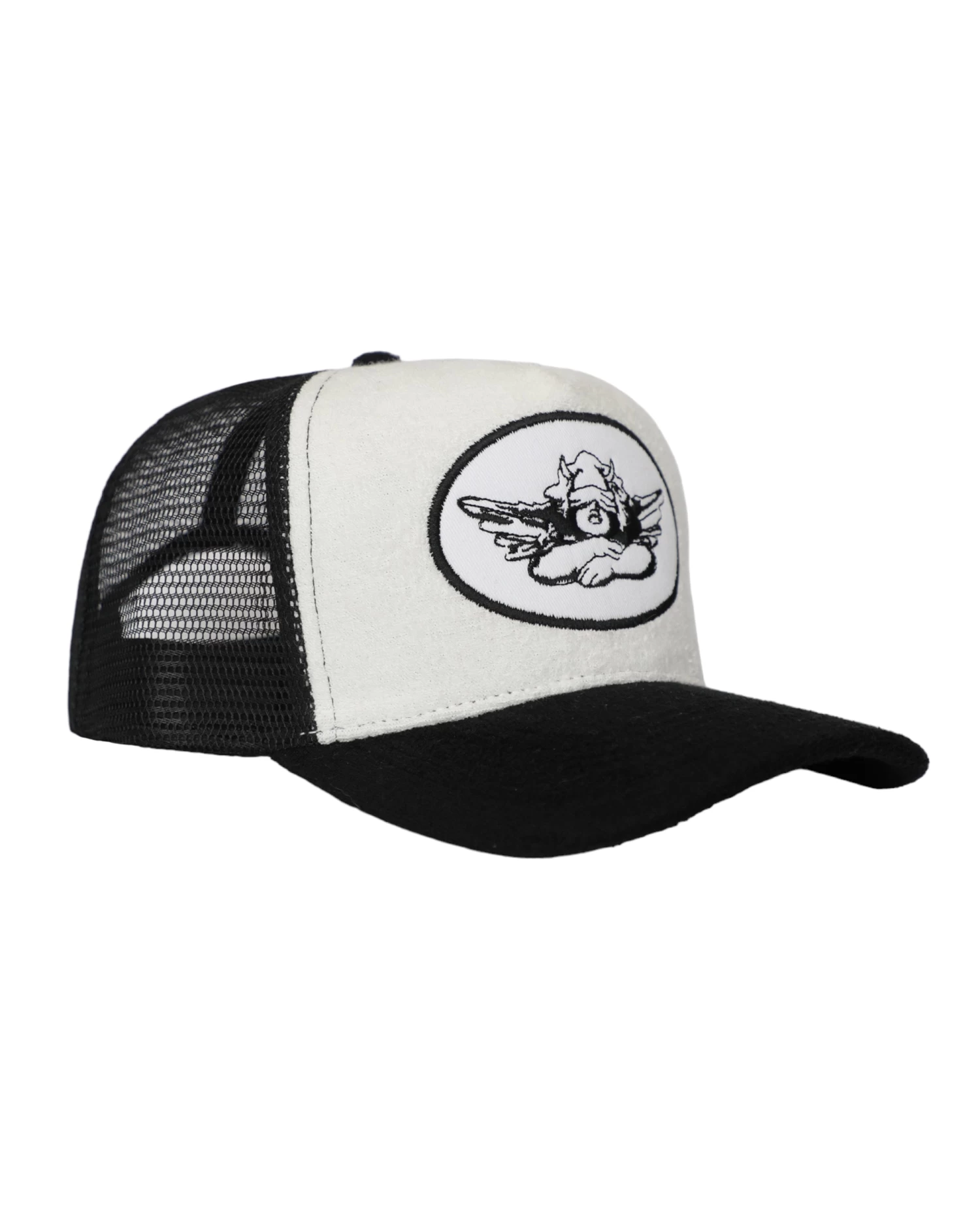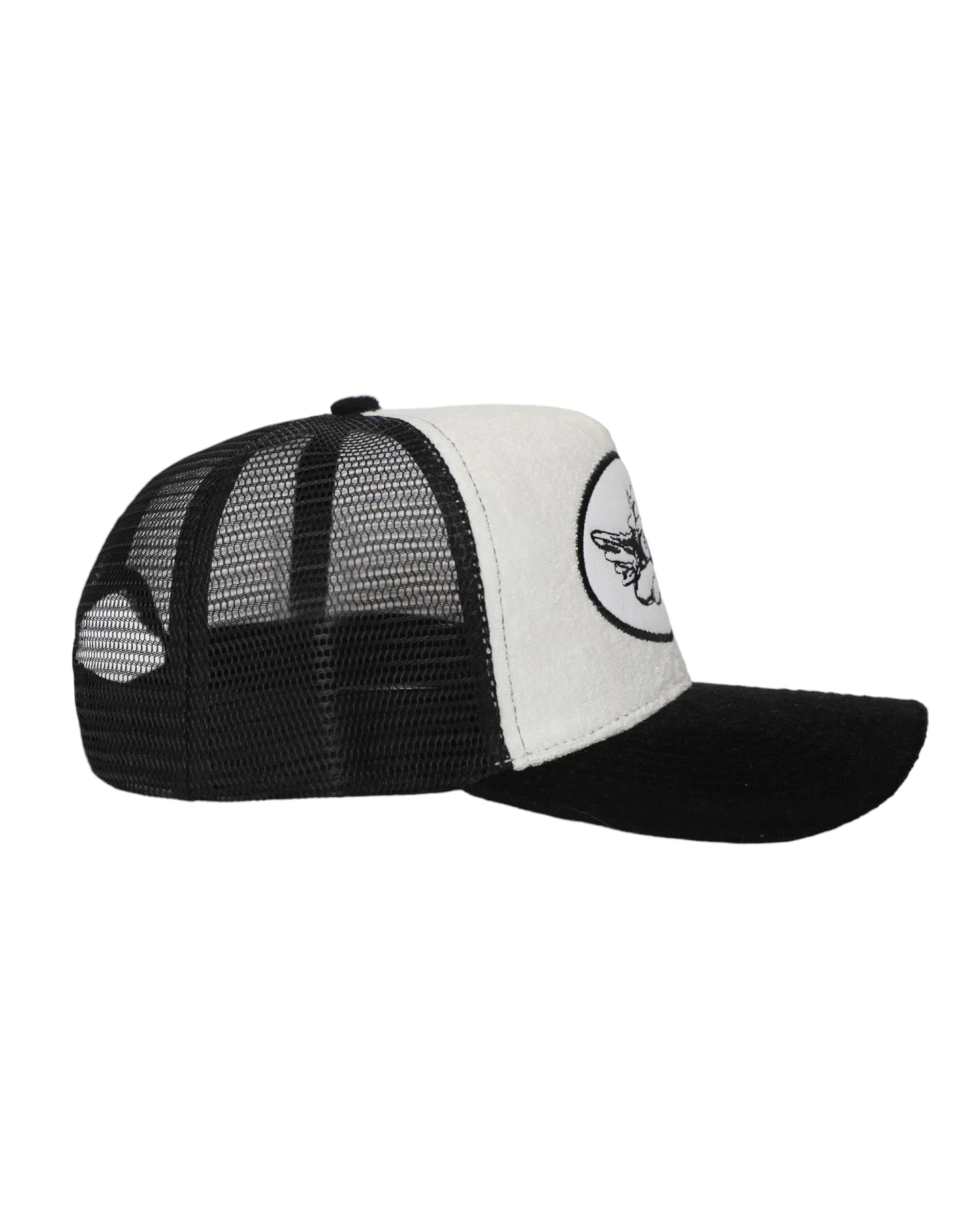White terry trucker hat with a white patch and black brim. Adjustable snapback.Â