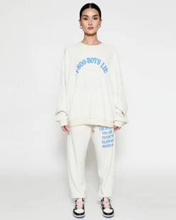 Soft thermal fabric in off white. High rise sweatpants with back and side pockets, elastic waistband and cuffs. Features puff print graphics.