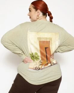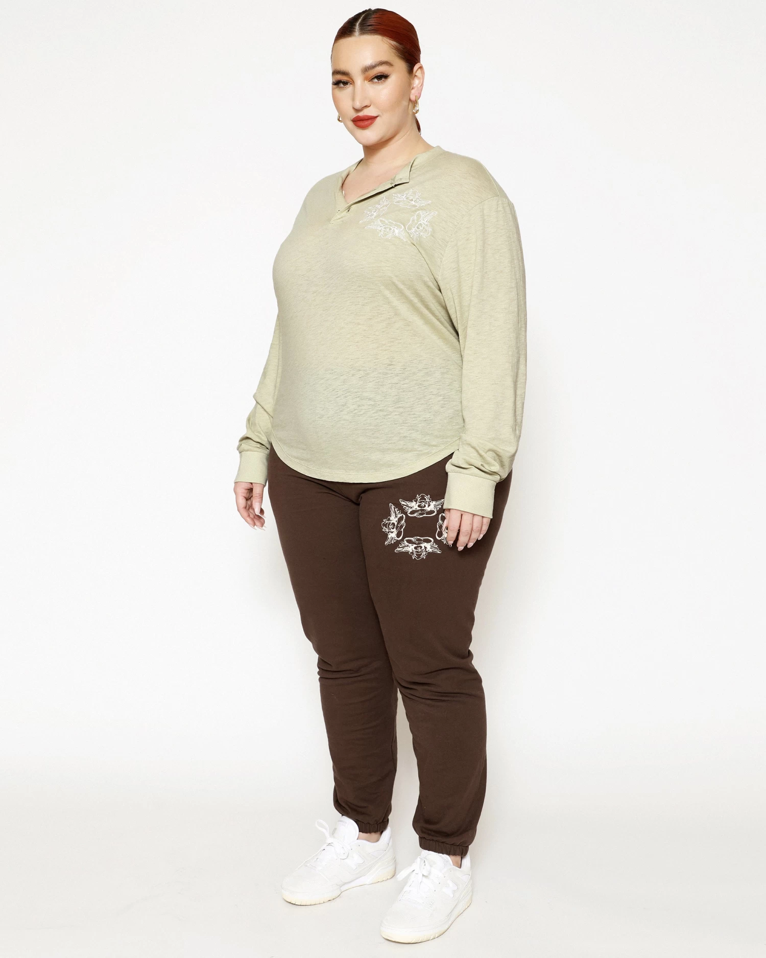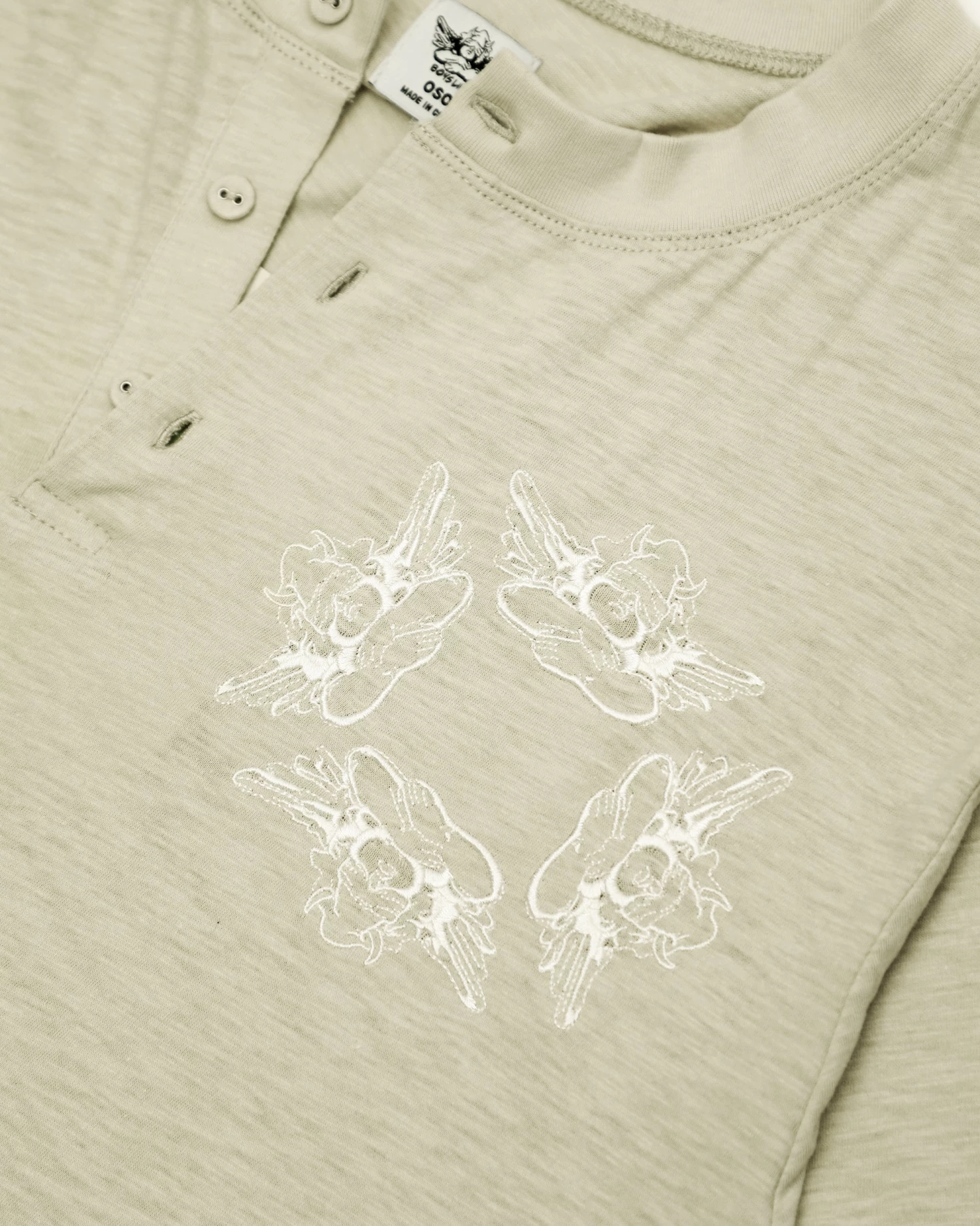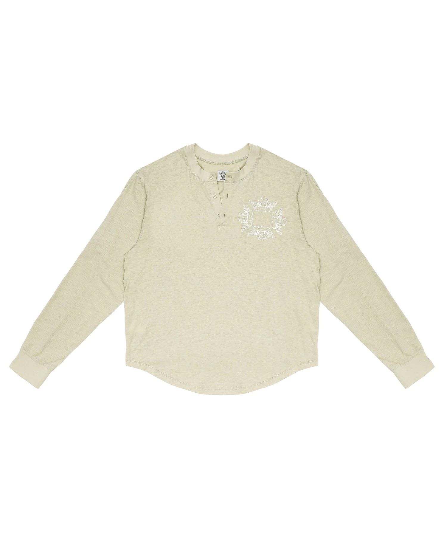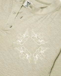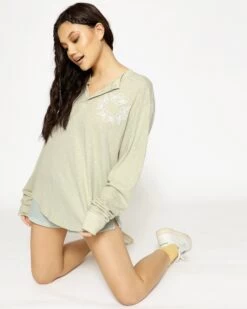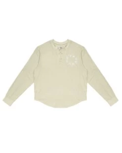 Oversized long sleeve henley in sage green. Front button details and a curved hem with embroidered logos.Â