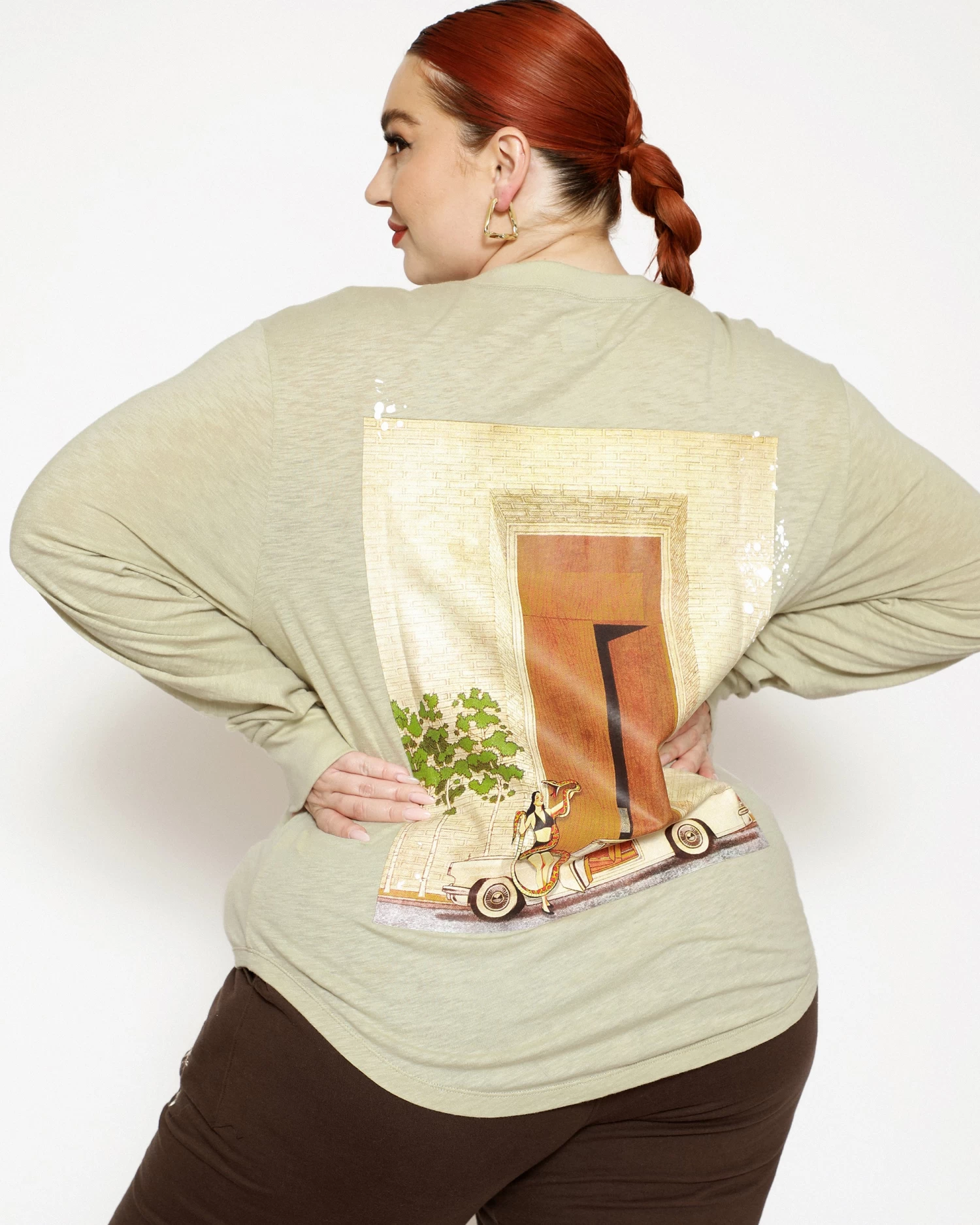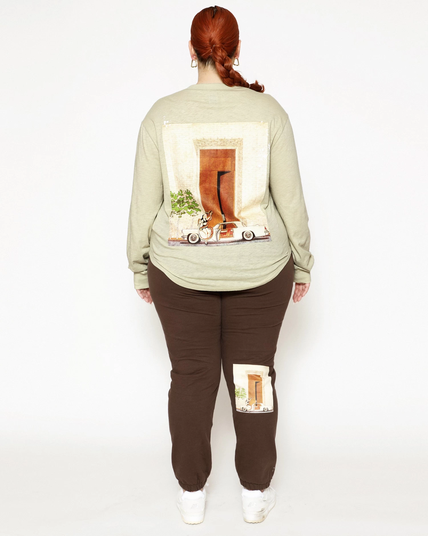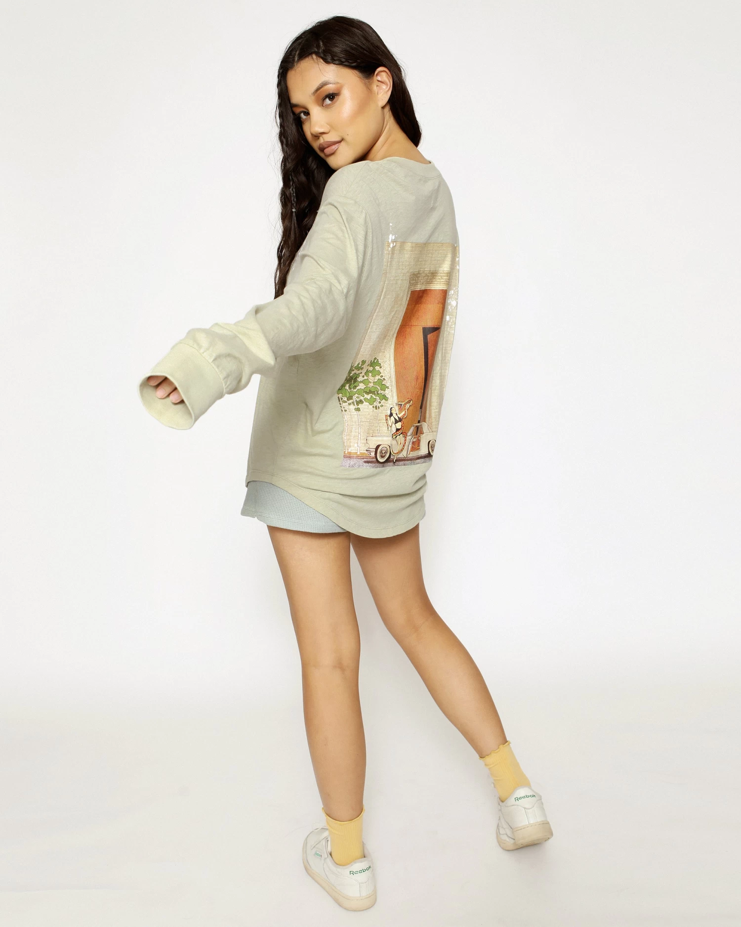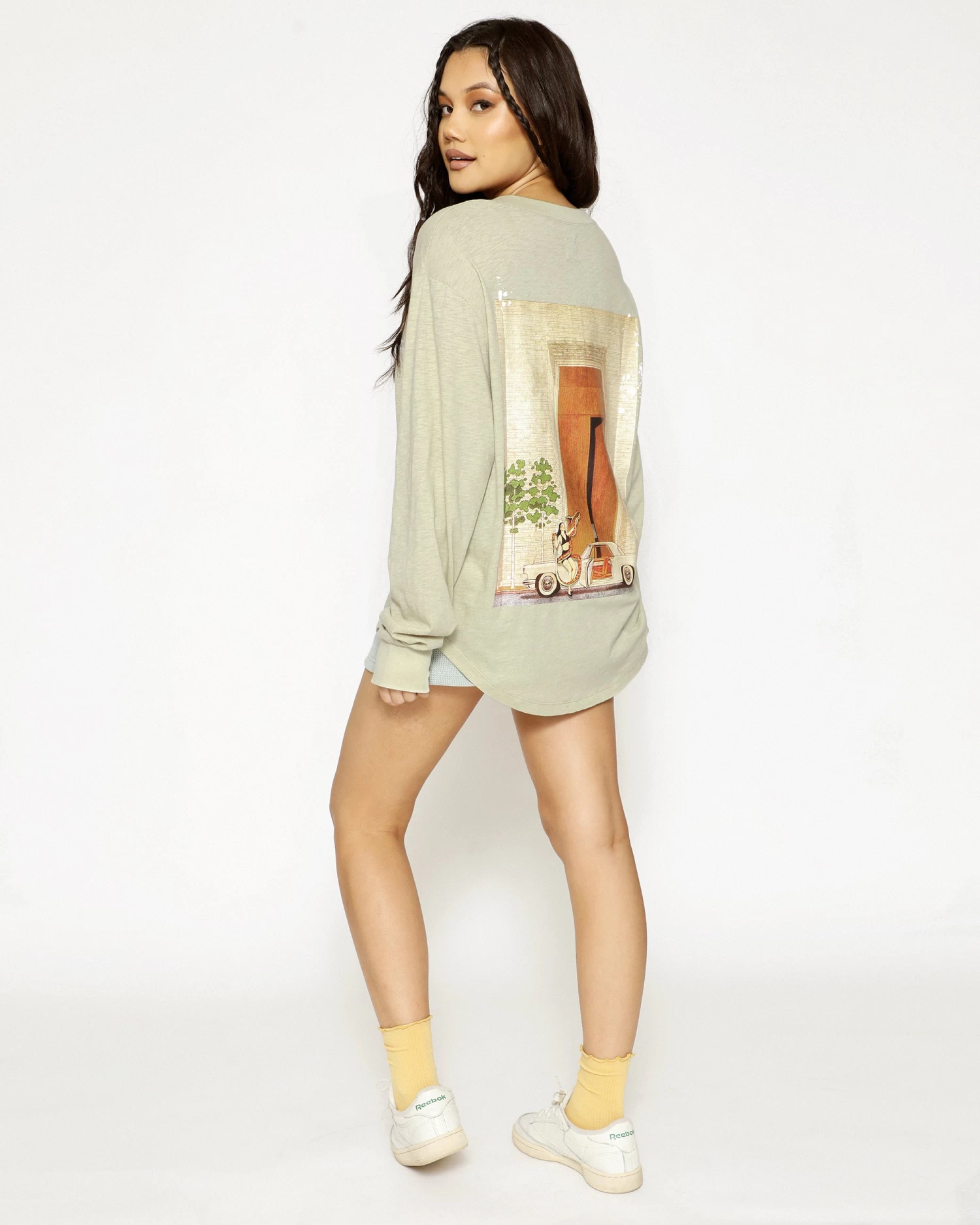 Oversized long sleeve henley in sage green. Front button details and a curved hem with embroidered logos.Â