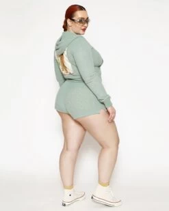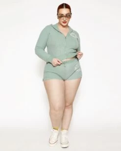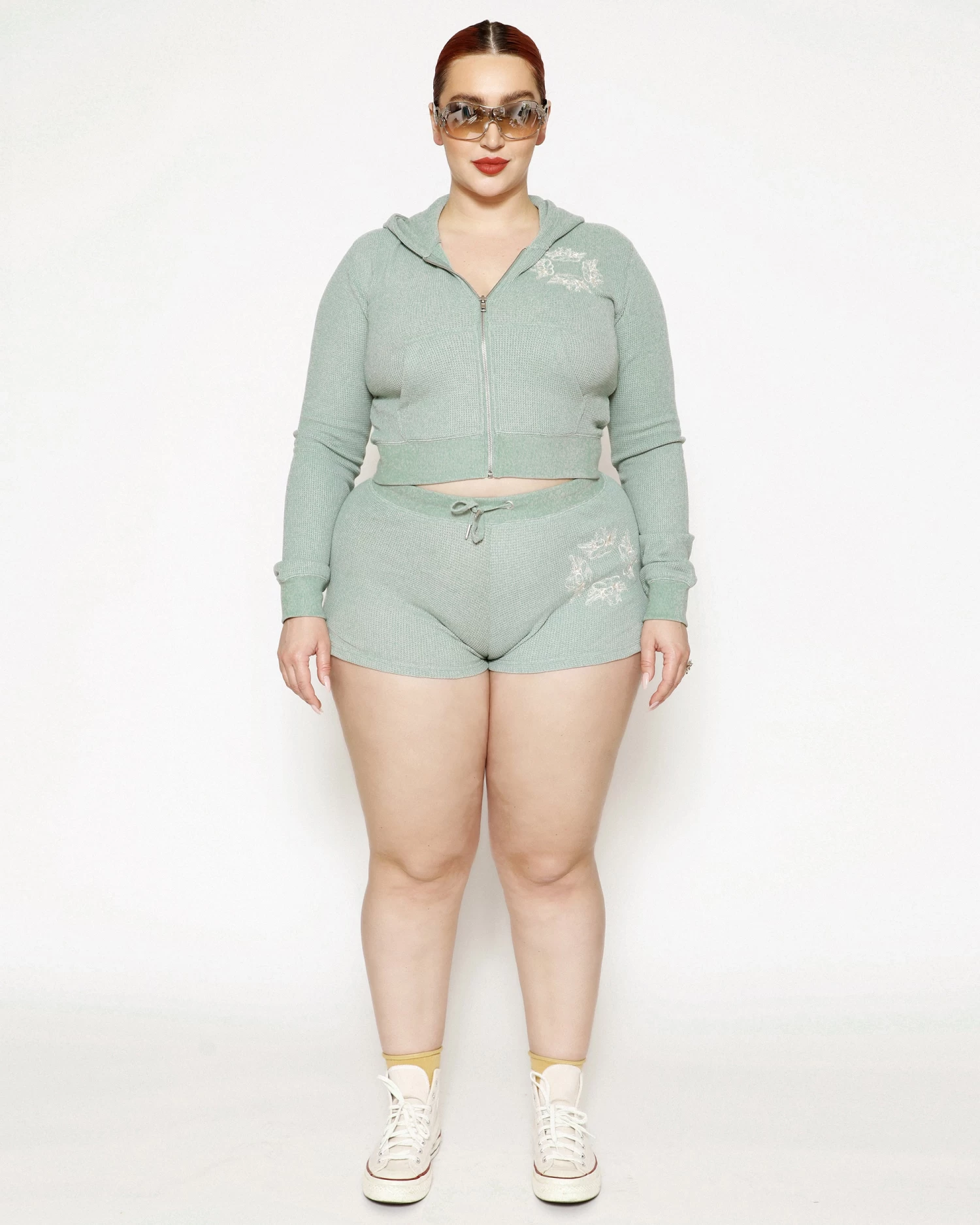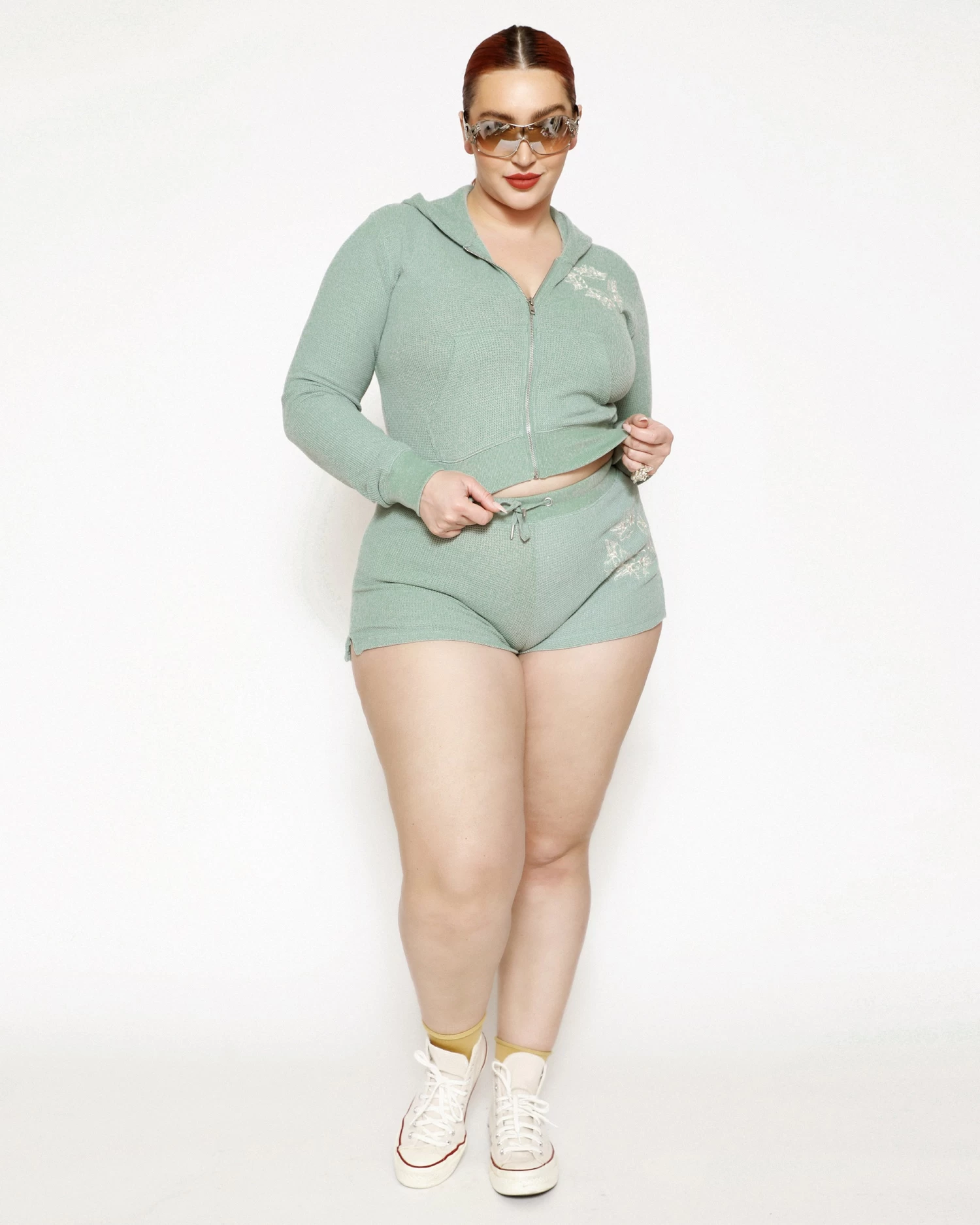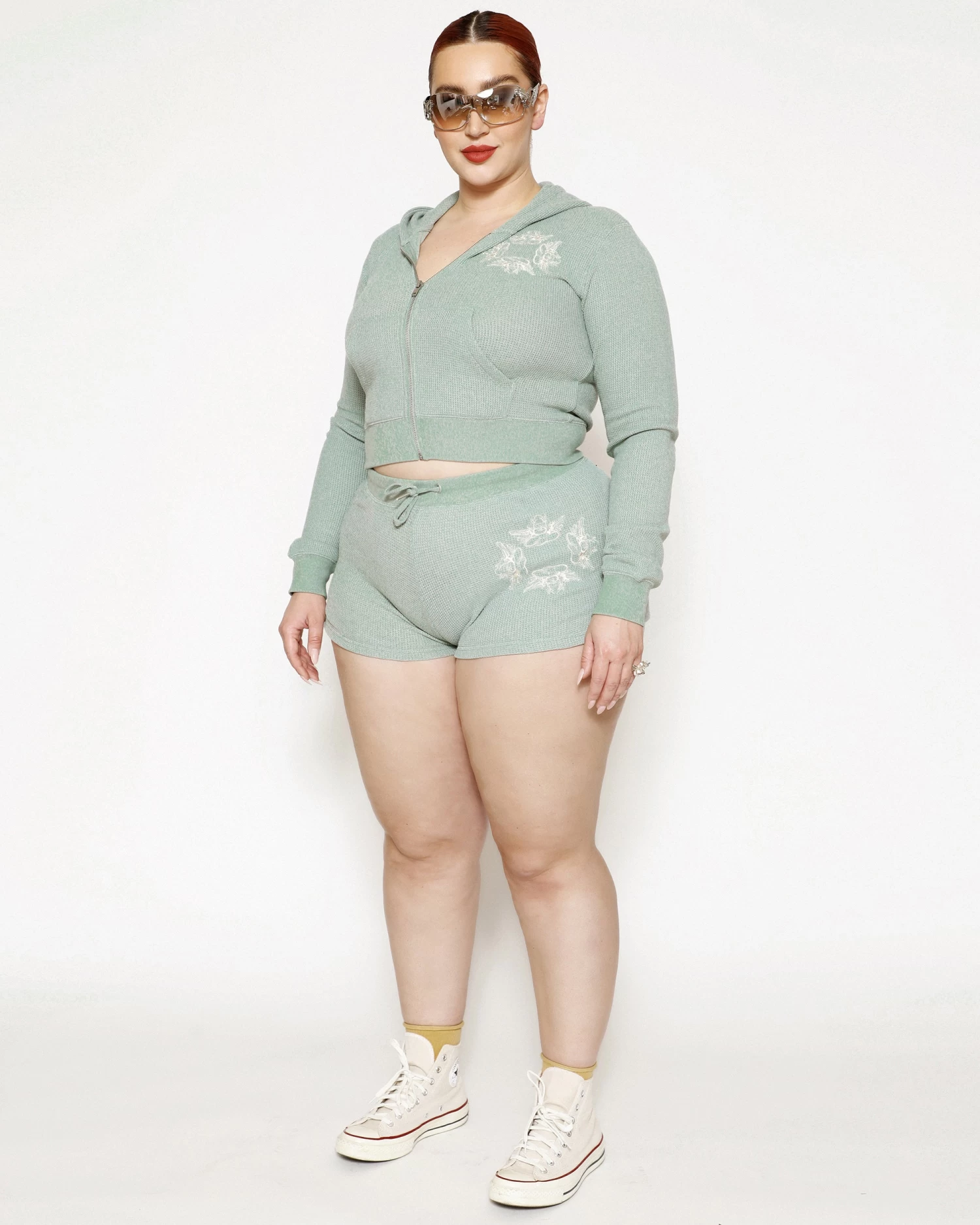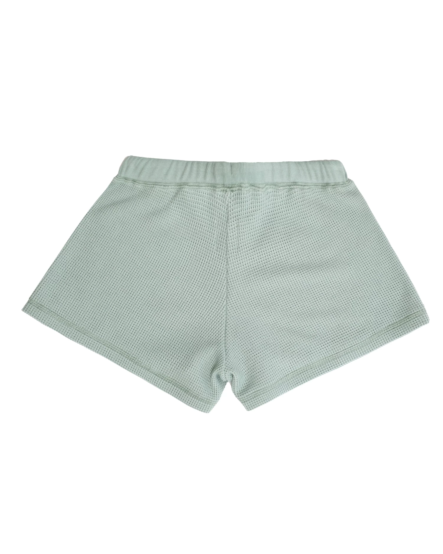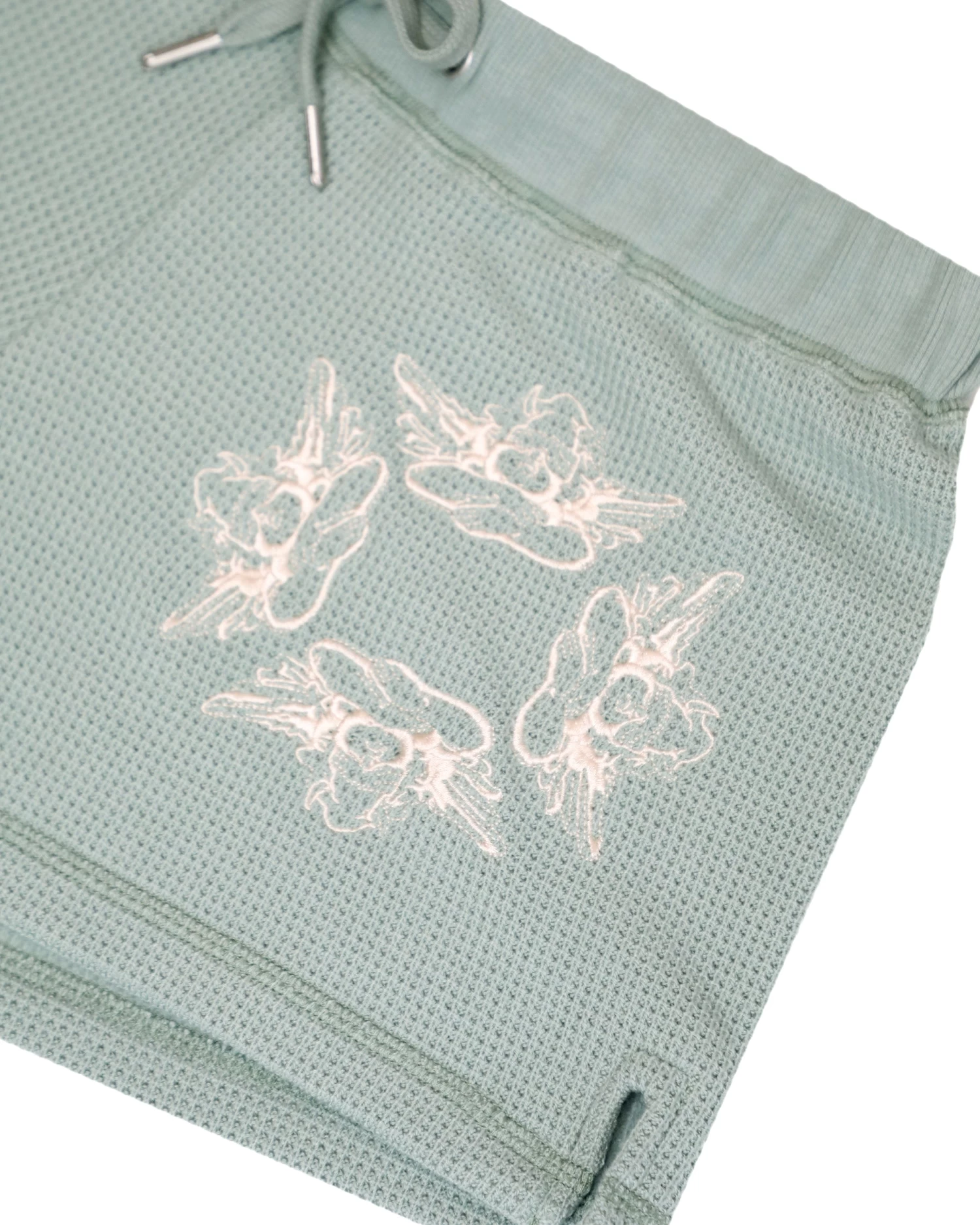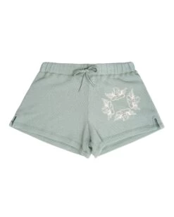 Soft thermal fabric in sage green. Mid-rise shorts with adjustable drawstring and embroidered logos. Â