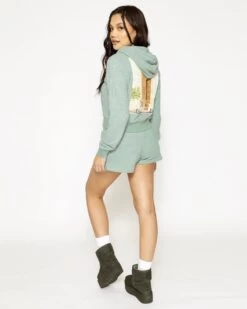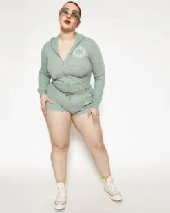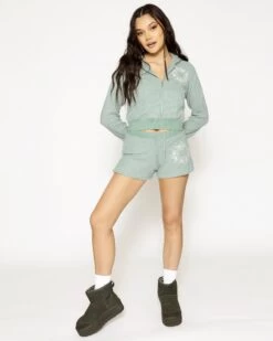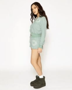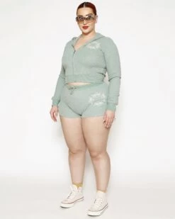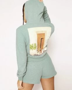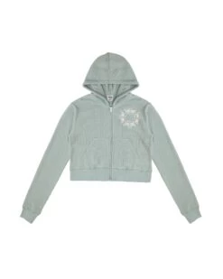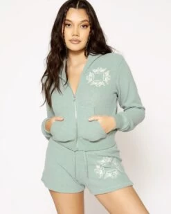 Soft thermal fabric in sage green. Zip up hoodie with cropped hem, front pockets, and embroidered front logos.Â