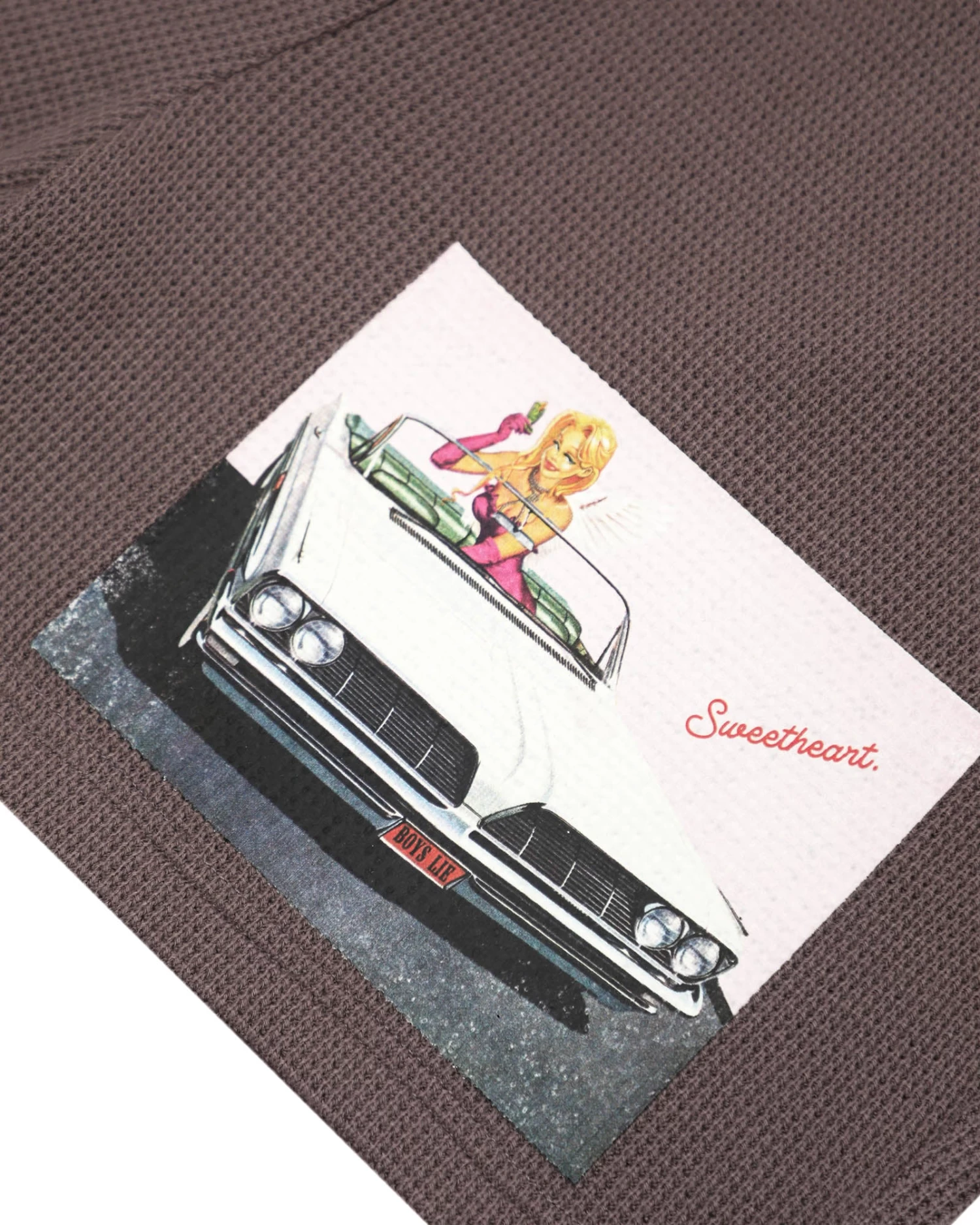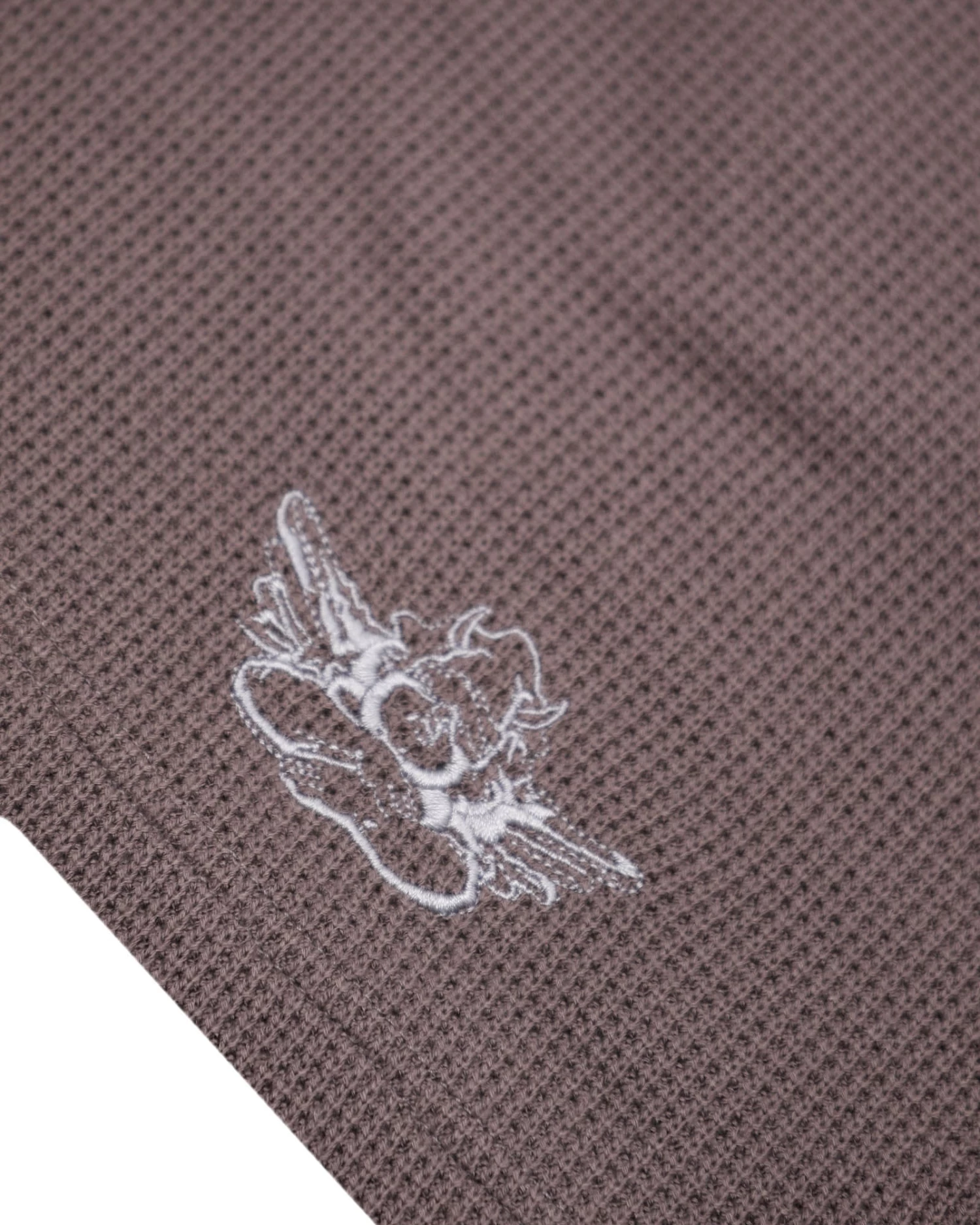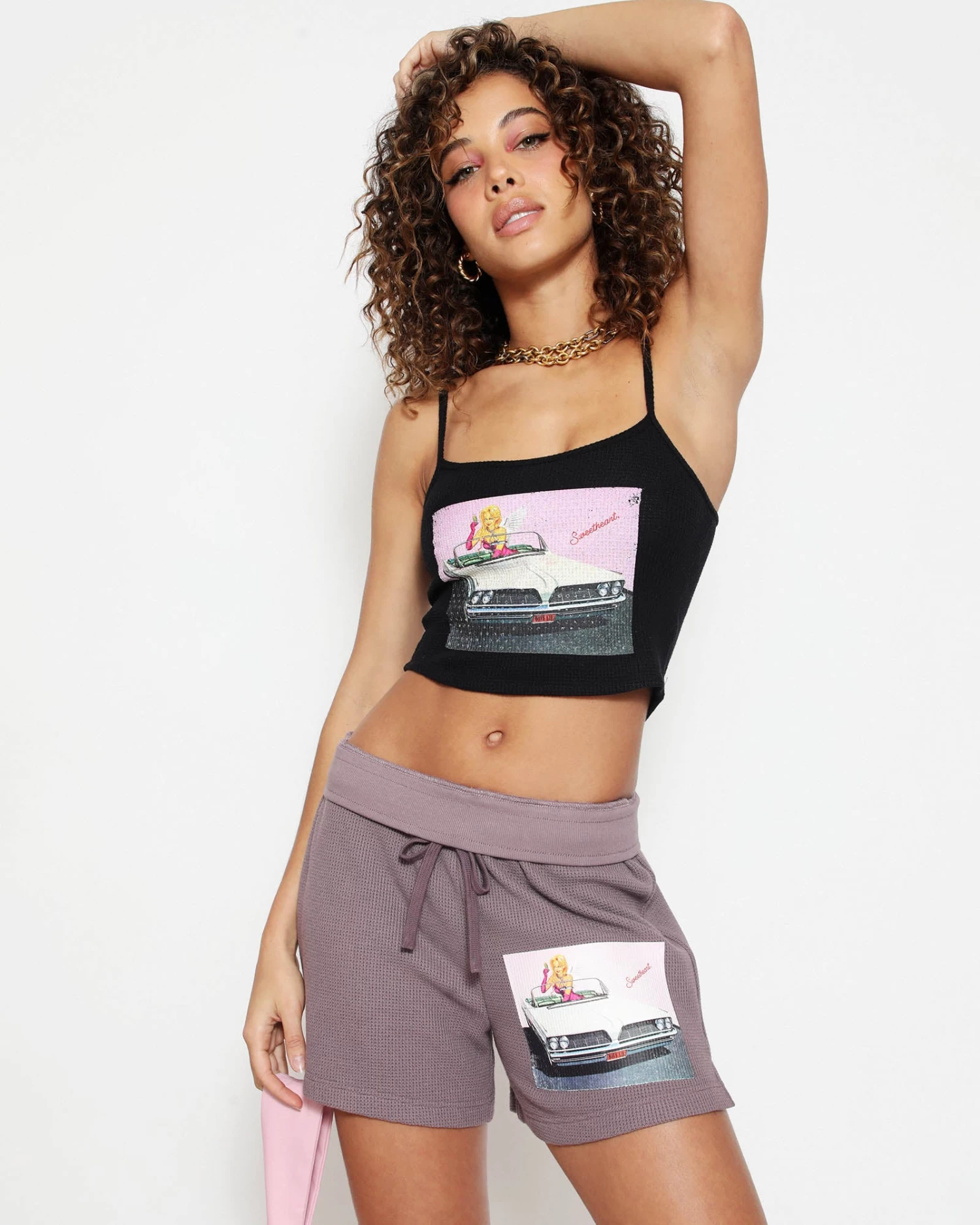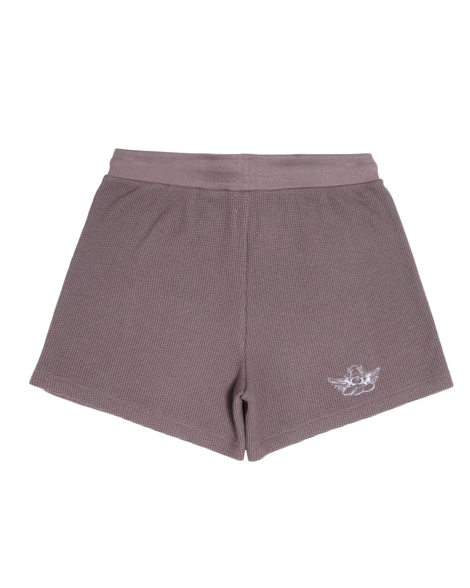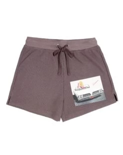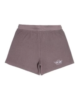 Soft thermal fabric in dusty purple. High rise shorts with adjustable drawstring and an oversized fit.Â