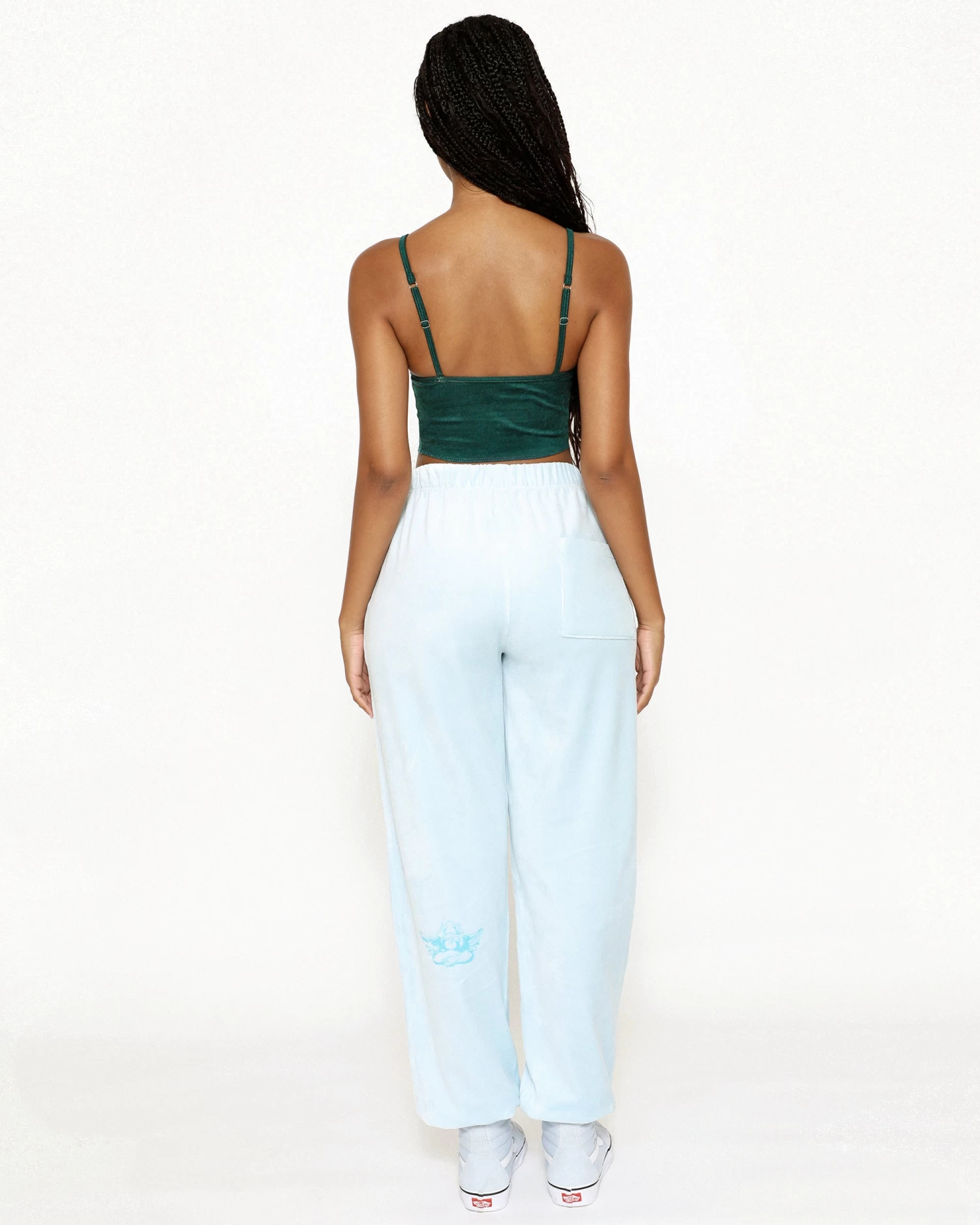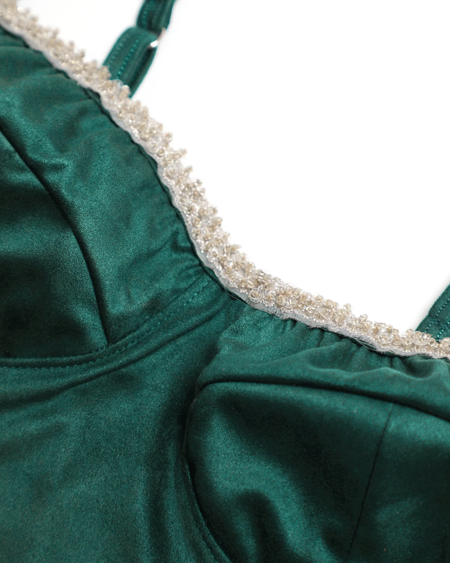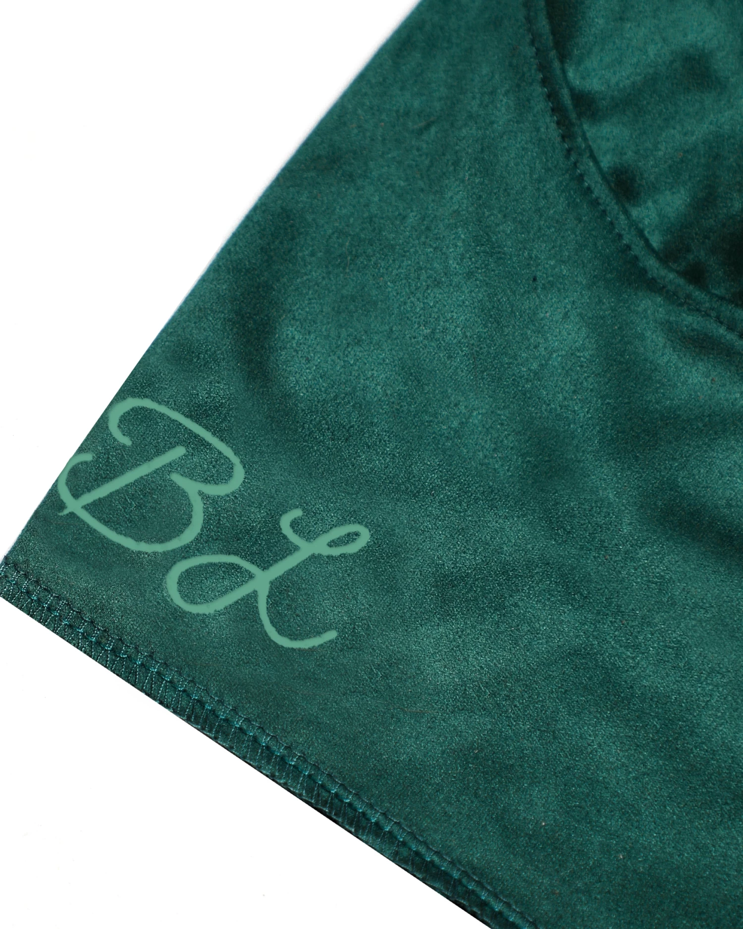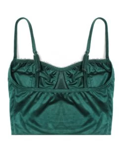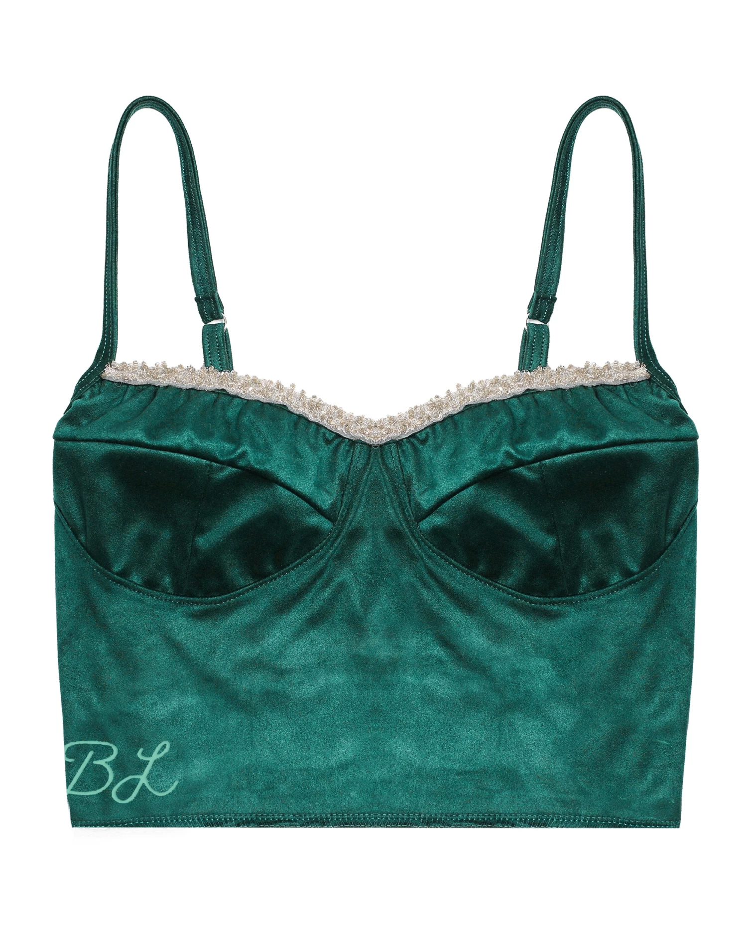 Poly suede bustier in green with lace trim. Printed “BL”, cropped hem, seam details, and adjustable straps.Â