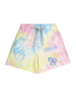 Lightweight fleece in pink, yellow, and blue tie dye. High rise sweat shorts with a thick elastic waistband, adjustable drawstring, and side pockets. Each item is hand dyed and may show slight color variations.Â
