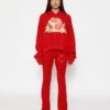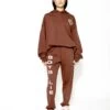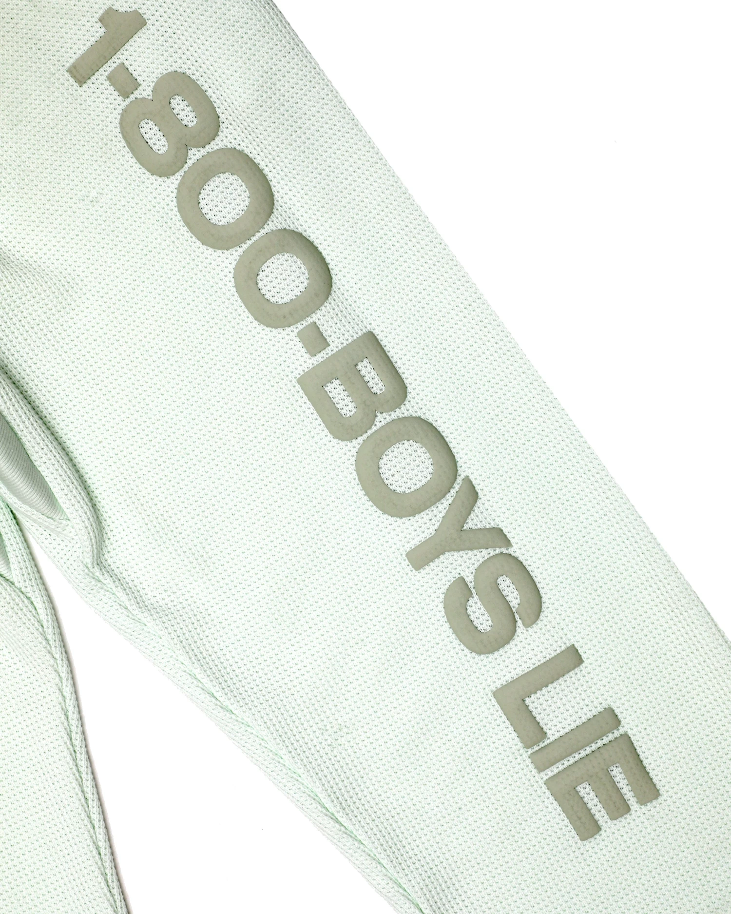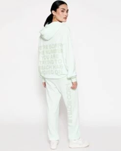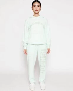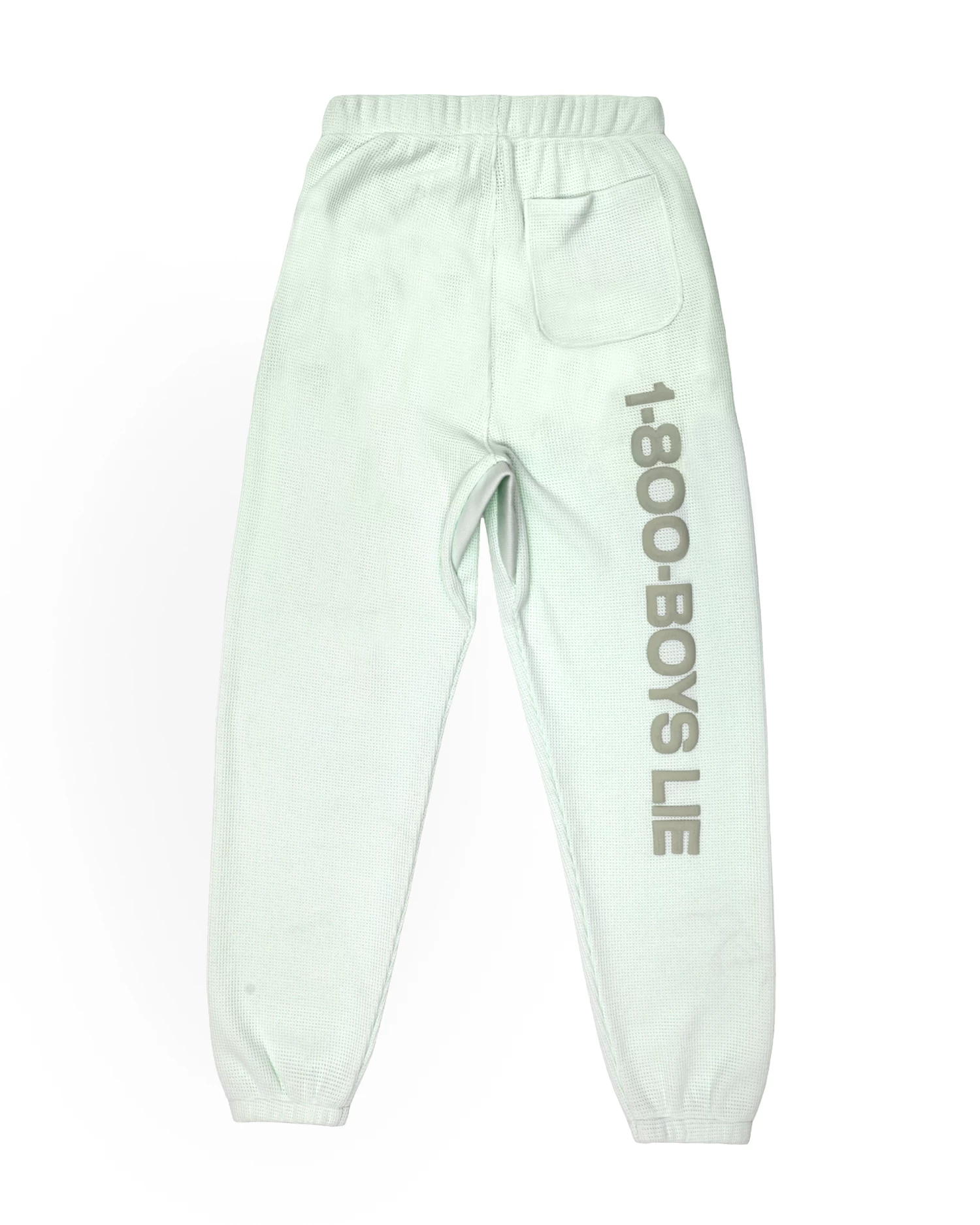 Soft thermal fabric in a soft green. High rise sweatpants with back and side pockets, elastic waistband and cuffs. Features puff print graphics.