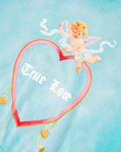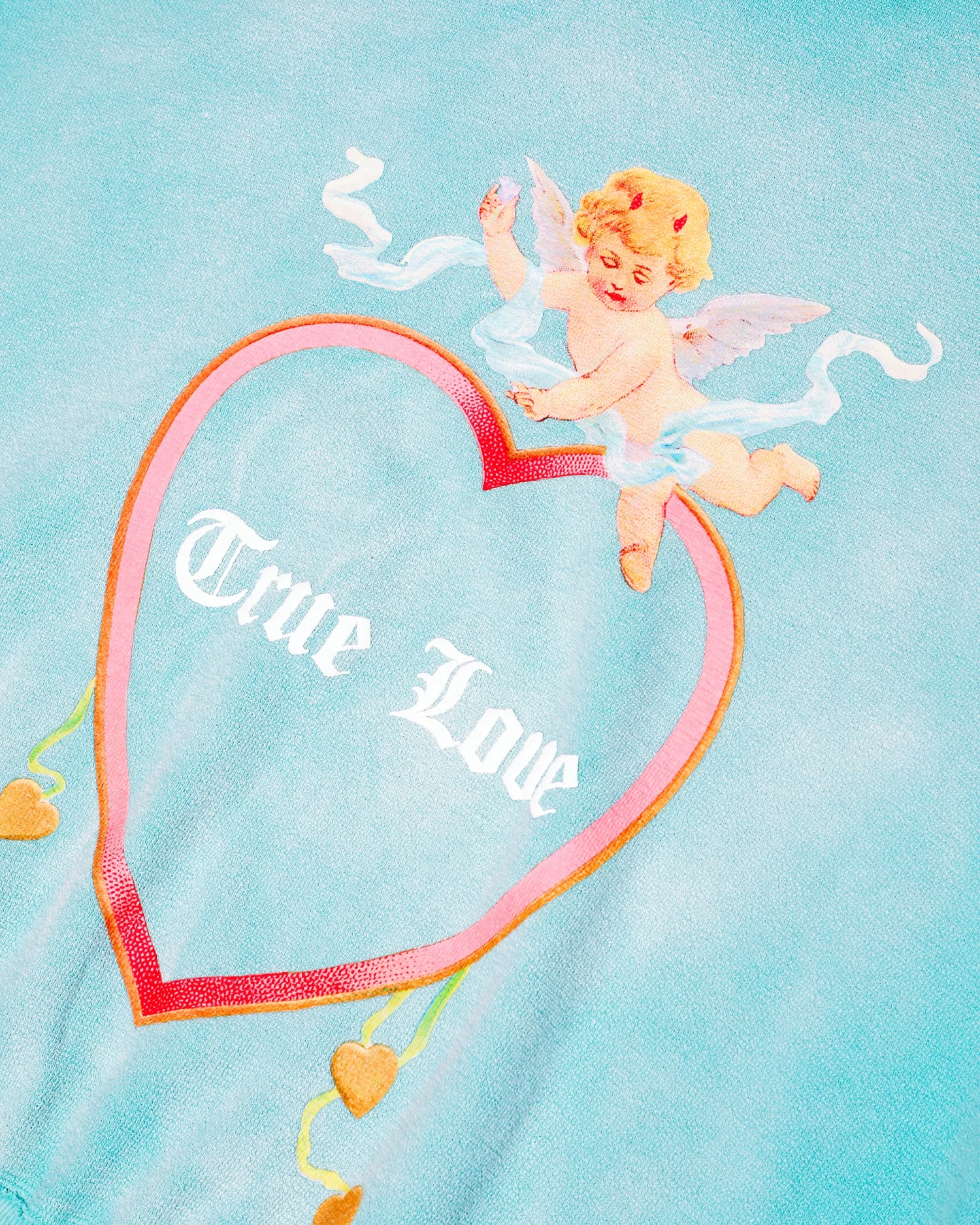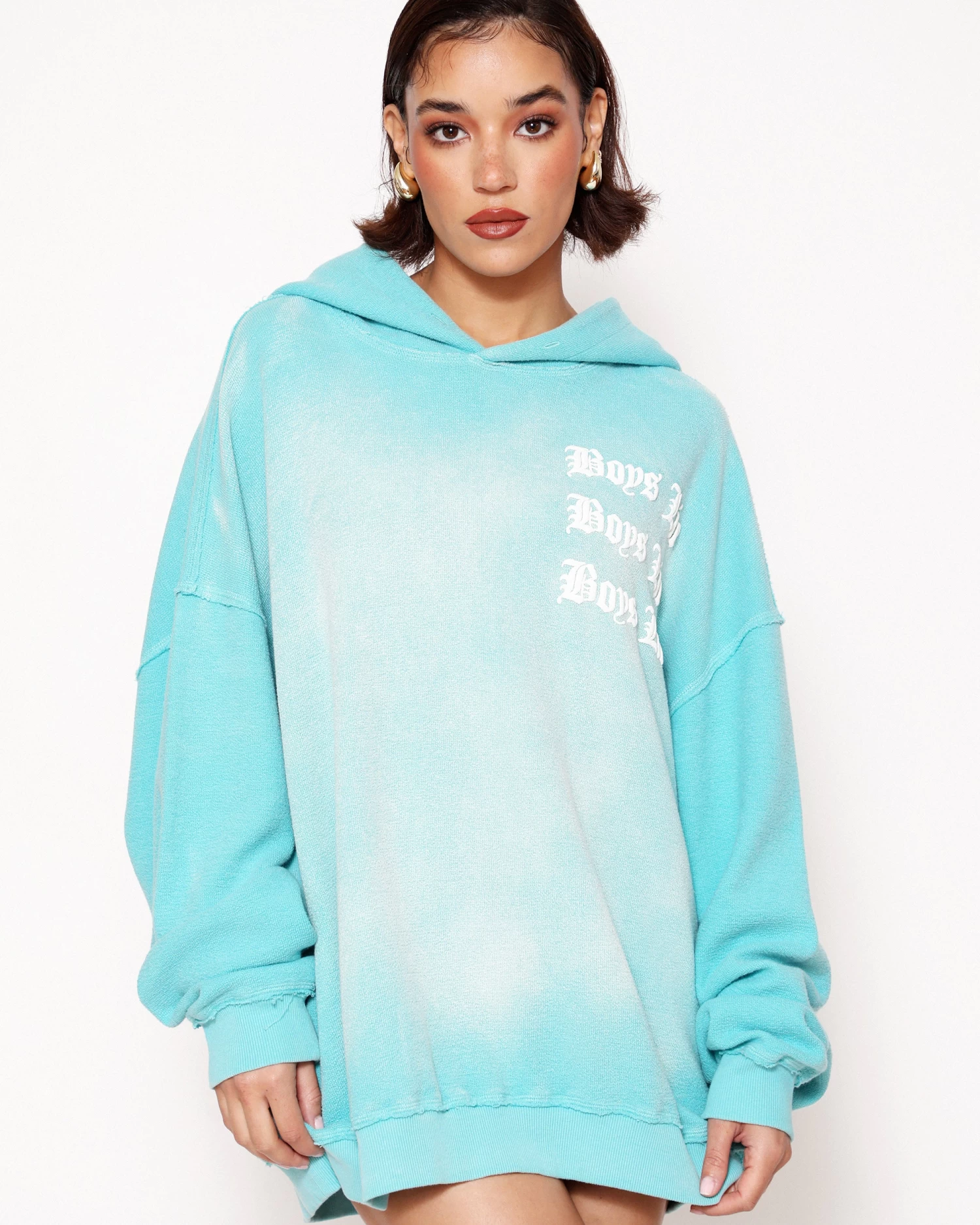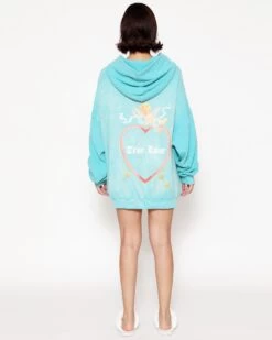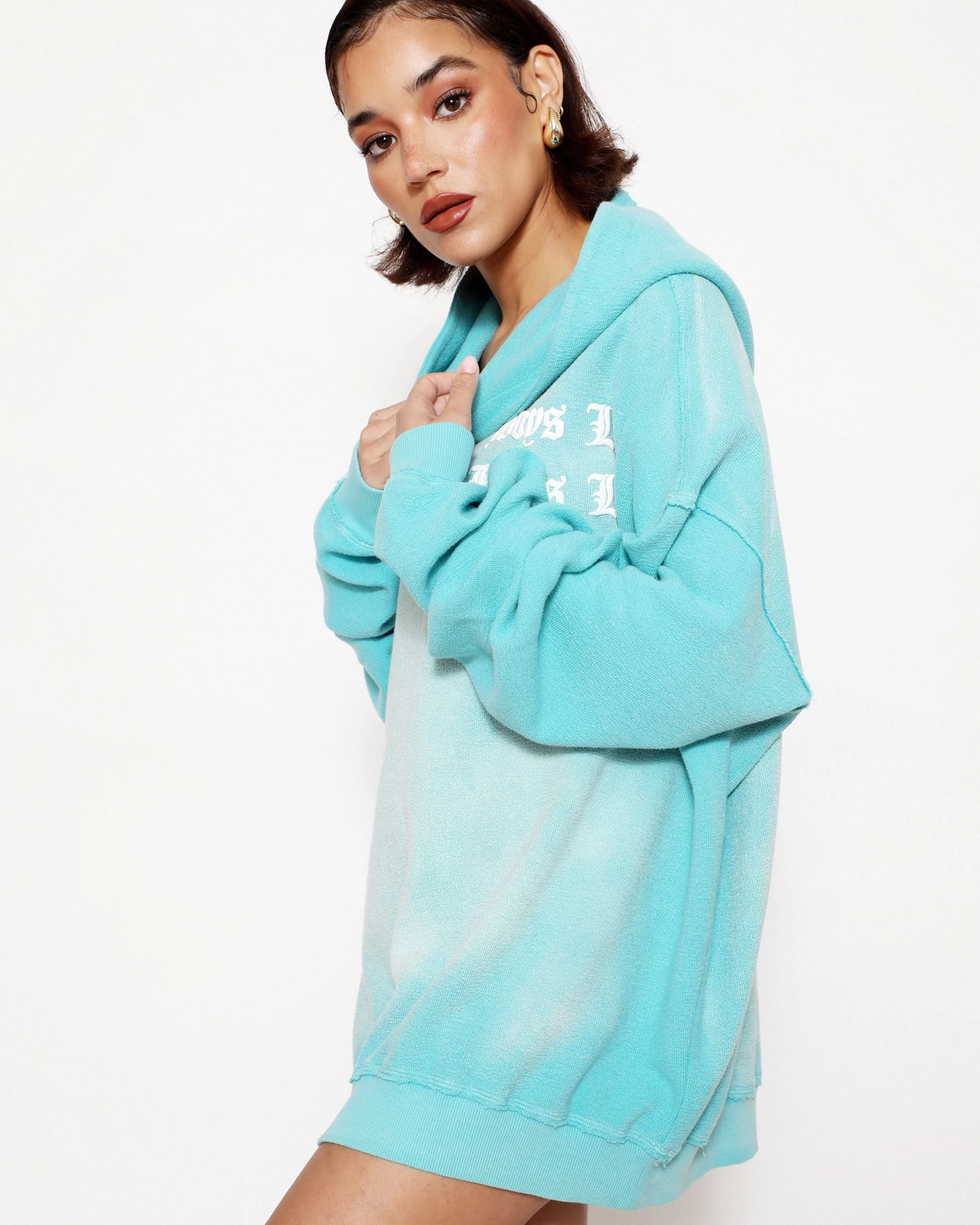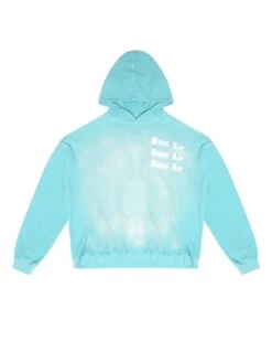 Inside out french terry fabric in teal with potassium dye treatment. Oversized hoodie featuring a dramatic hood and front and back printed graphics.