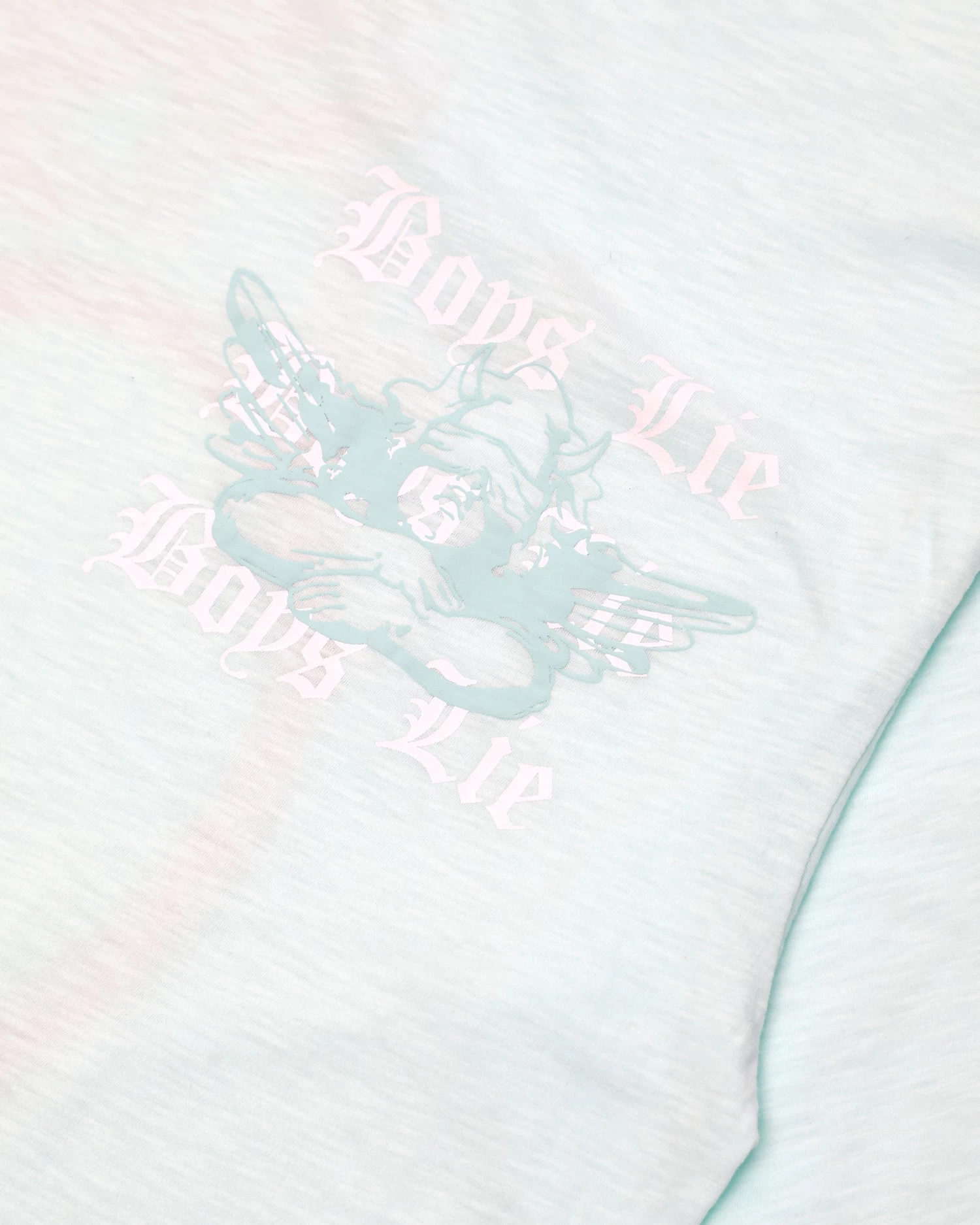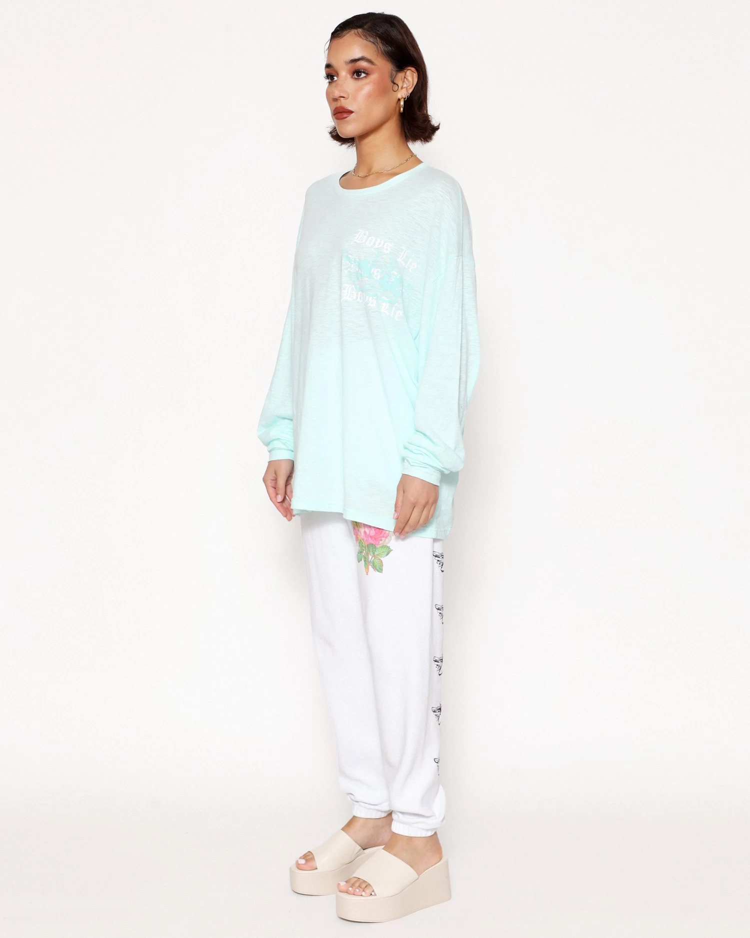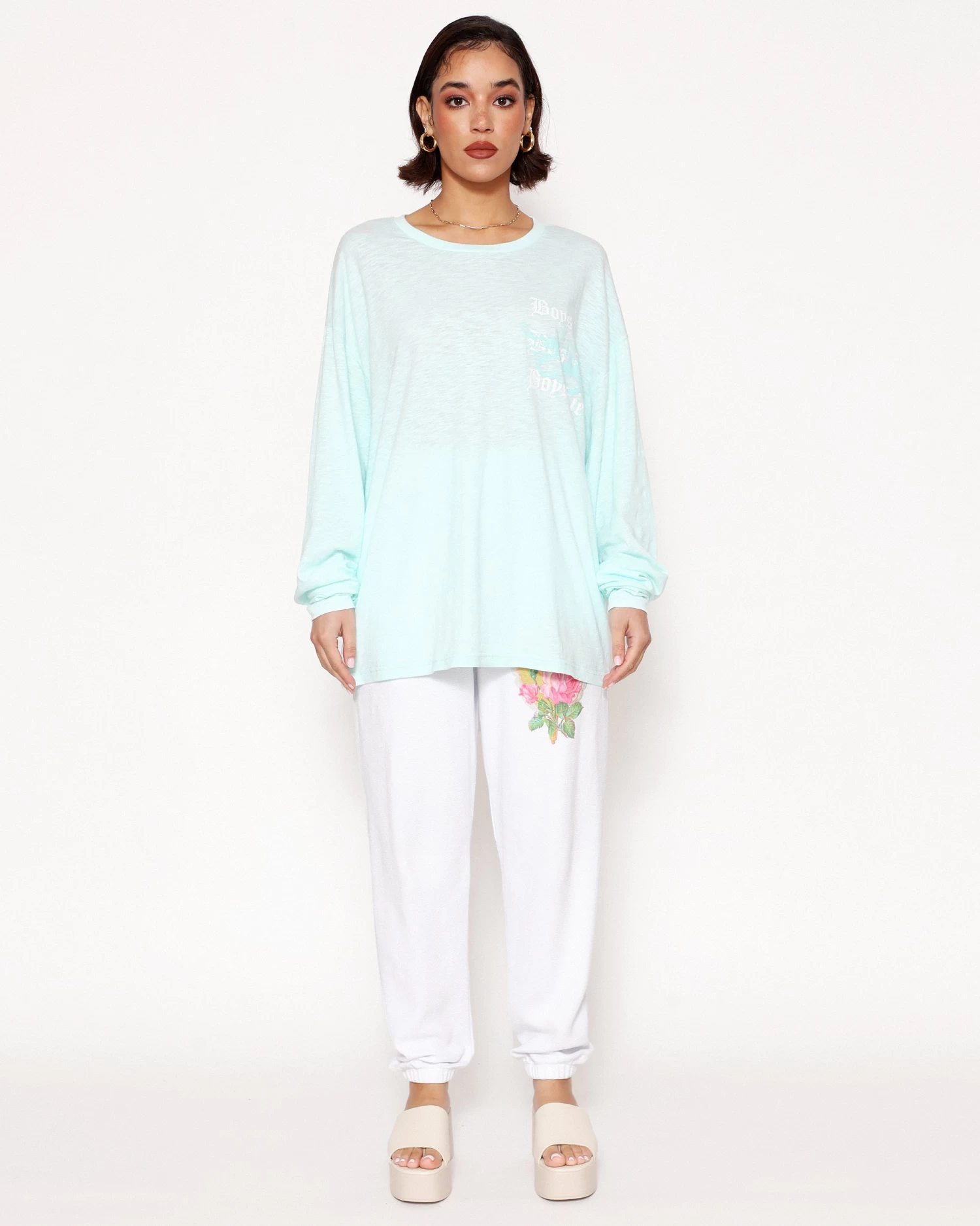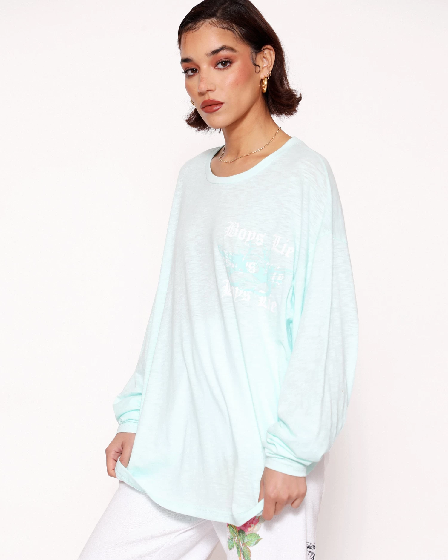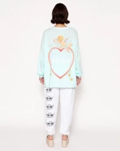 Oversized long sleeve tee in teal. Printed front and back graphic with rhinestone embellishments.