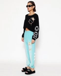 Oversized cropped longsleeve in black. Printed graphics on front, back, and sleeves.