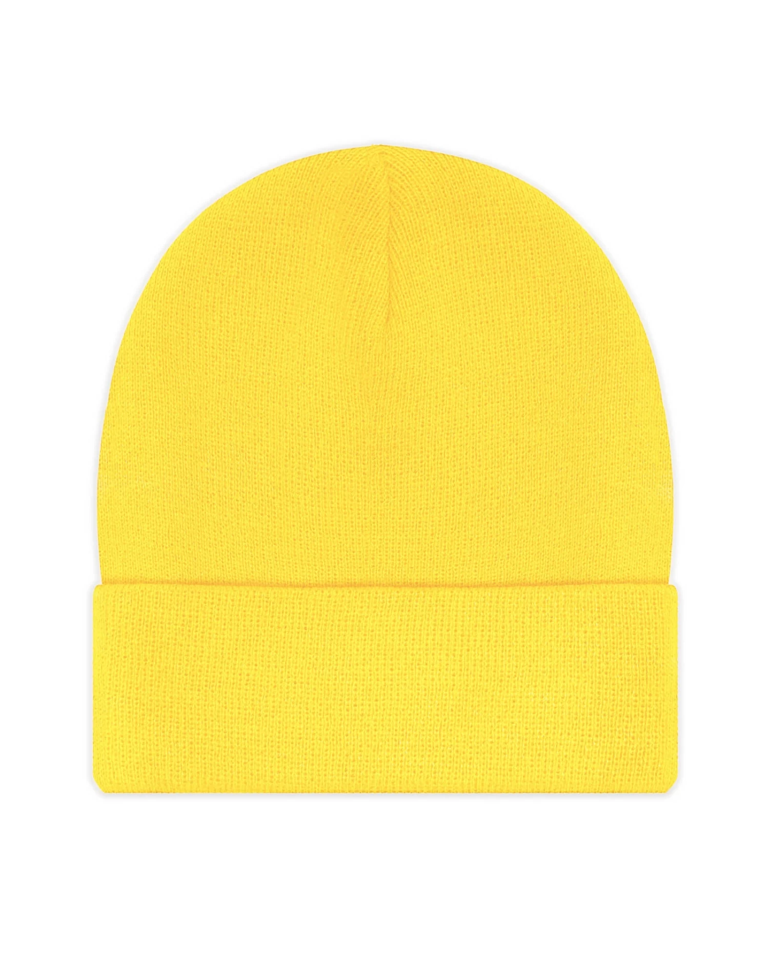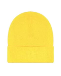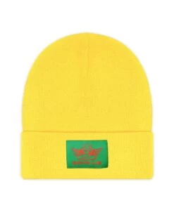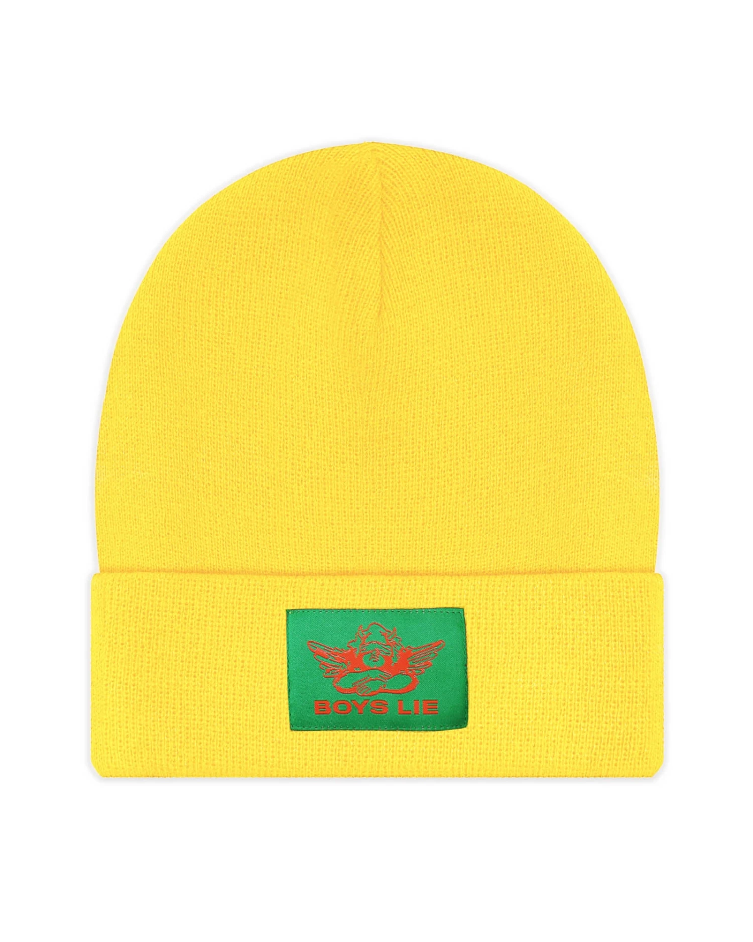 Yellow beanie with green Boys Lie logo patch.