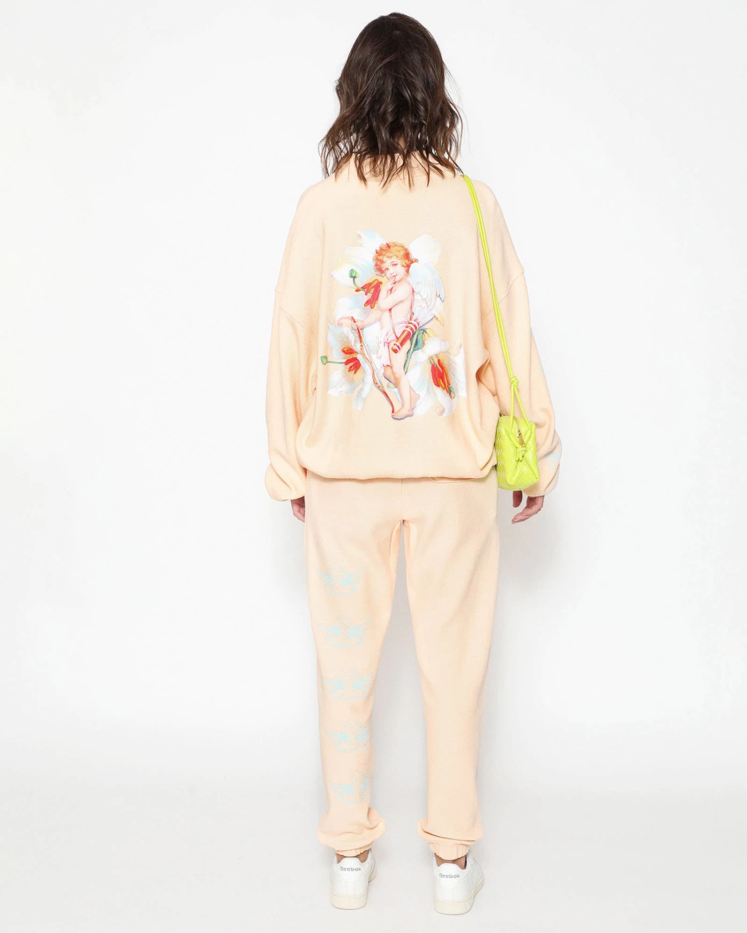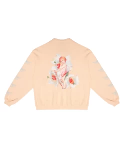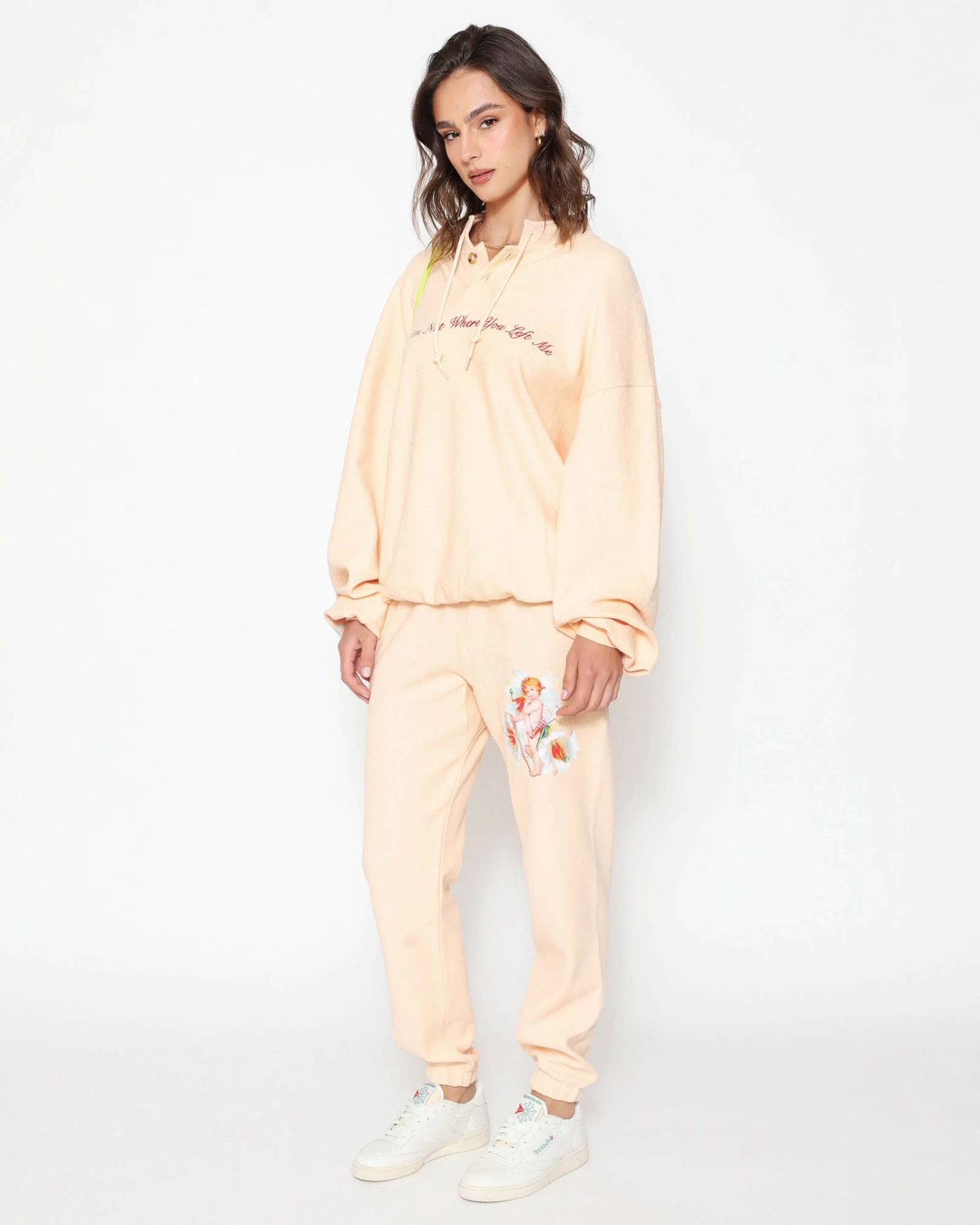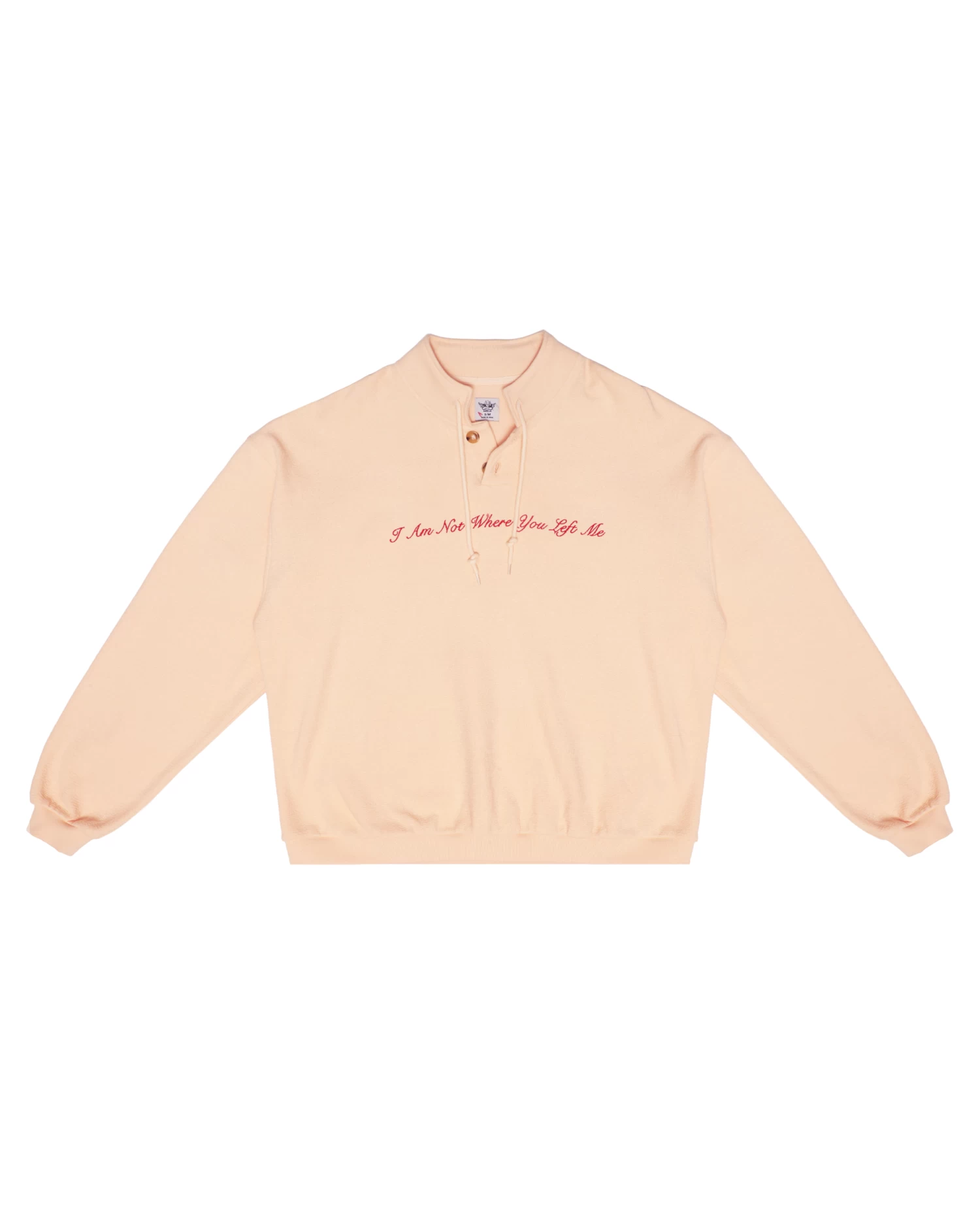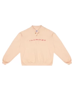 Inside out french terry fabric in peach. Henley style crewneck with button details, drawstring, and ribbed cuffs and hem. Features embroidery.Â