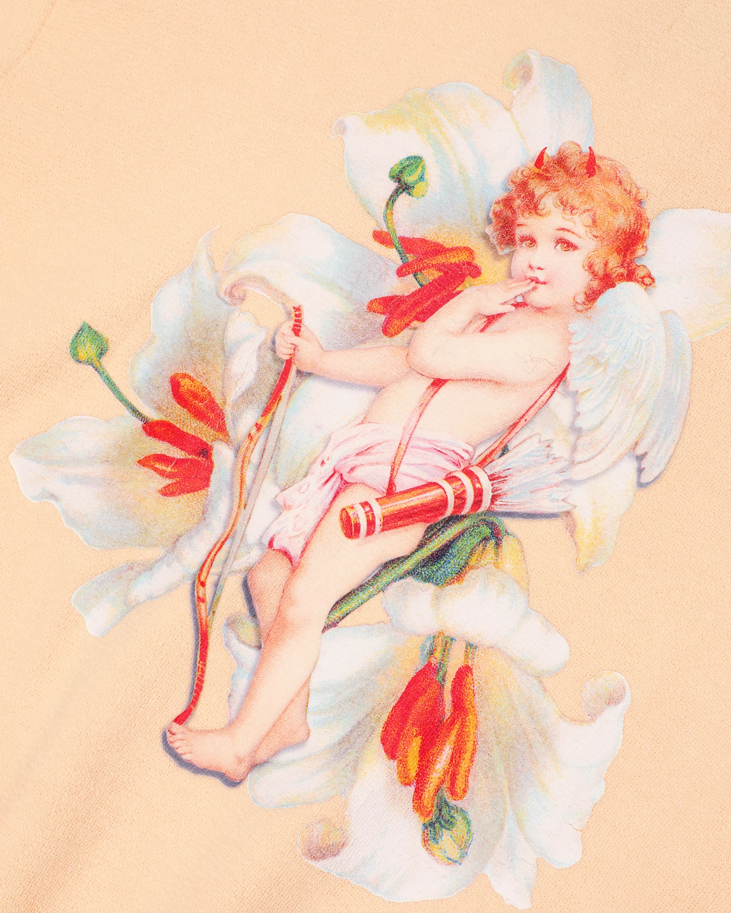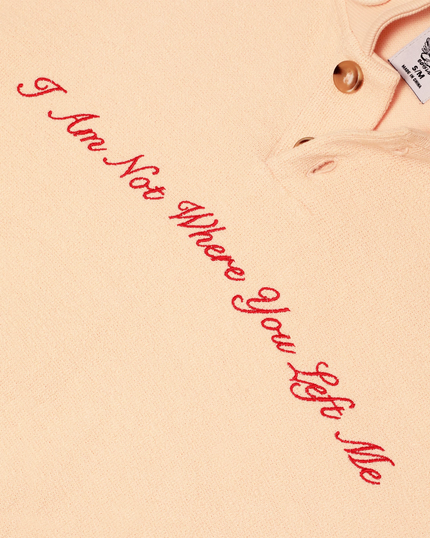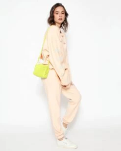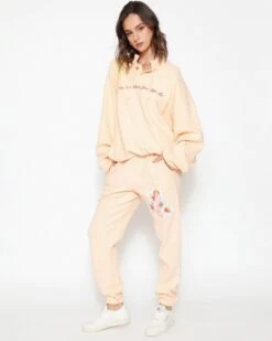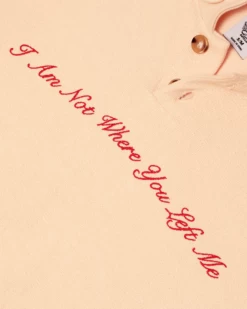 Inside out french terry fabric in peach. Henley style crewneck with button details, drawstring, and ribbed cuffs and hem. Features embroidery.Â