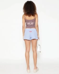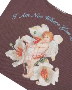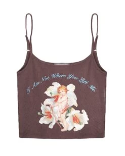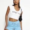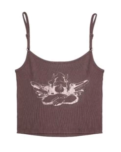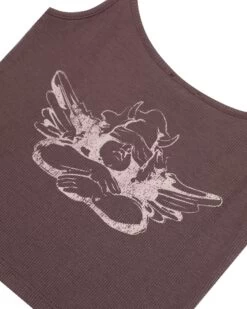 Ribbed crop tank in brown with adjustable straps, distressed logo, and rhinestone embellishments.Â