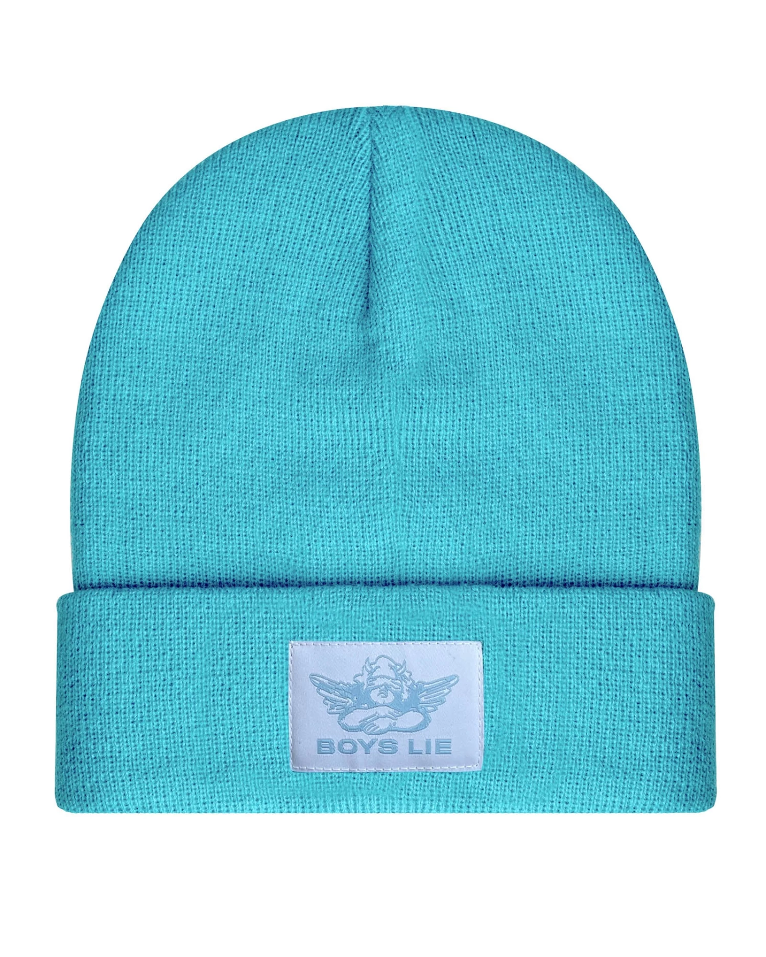 Mint beanie with pink Boys Lie logo patch.