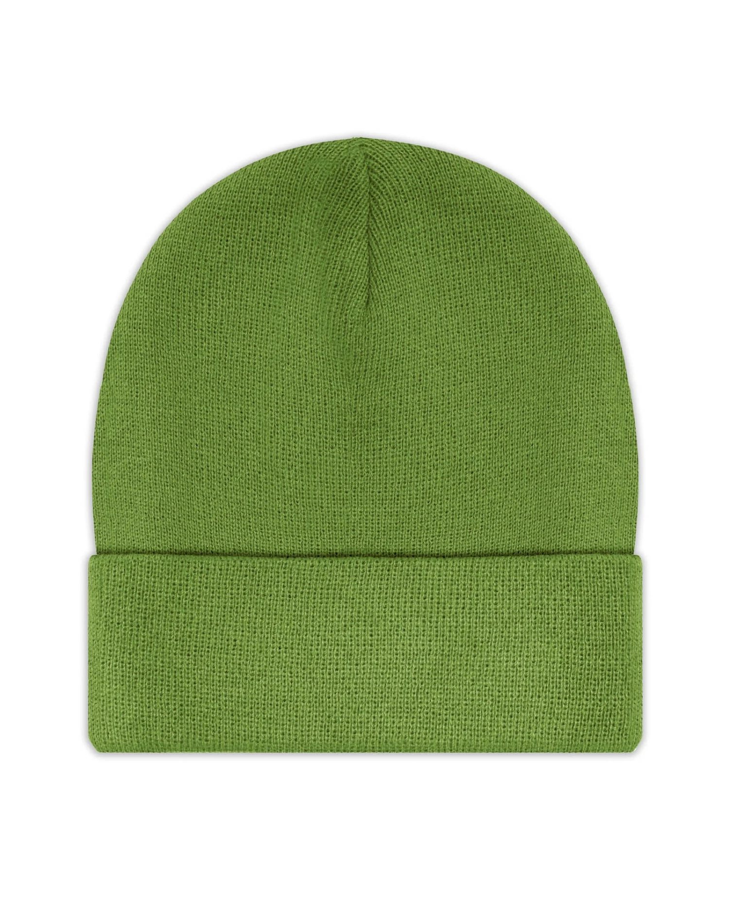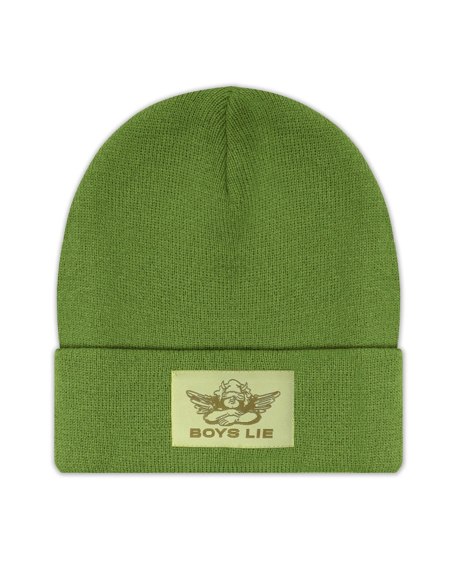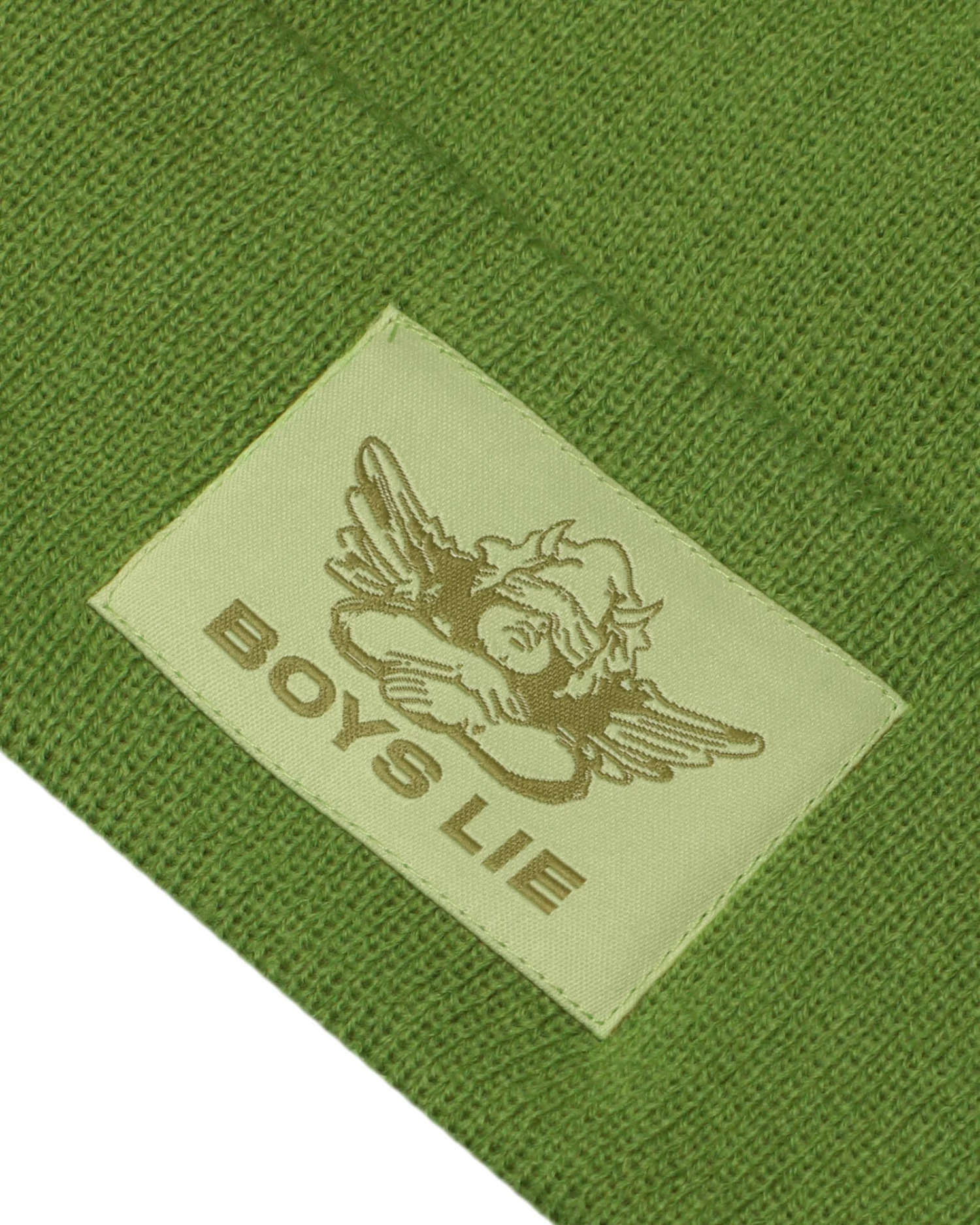Light olive green beanie with monochromatic green Boys Lie logo patch.
