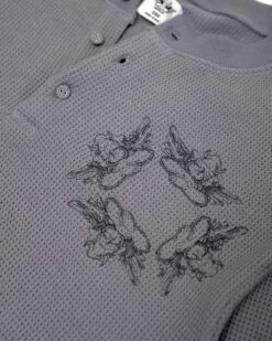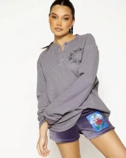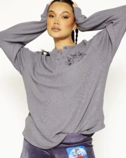 Oversized thermal long sleeve henley in dusty purple. Front button details and a curved hem with embroidered logos.Â