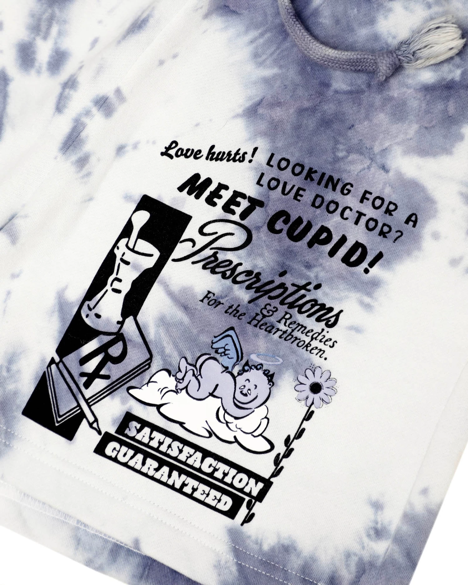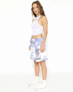 Lightweight fleece in deep purple tie dye. High rise sweat shorts with a thick elastic waistband, adjustable drawstring, and side pockets. Each item is hand dyed and may show slight color variations.Â
