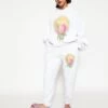 Lightweight fleece fabric in navy blue with rhinestone embellishments. High rise sweatpants with back and side pockets, elastic waistband and cuffs.