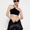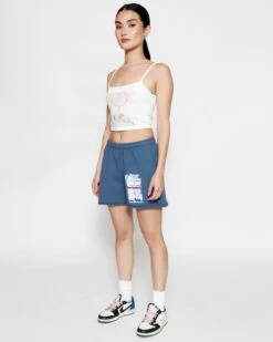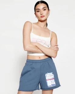 French terry fabric in navy. Mid-rise shorts with interior adjustable drawstring, side pockets, and a raw edge hem.Â