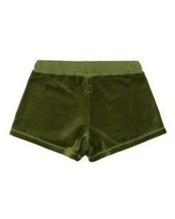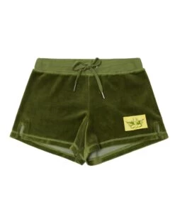 Lightweight velour fabric in olive green. Mid-rise shorts with adjustable drawstring and Boys Lie logo patch.Â
