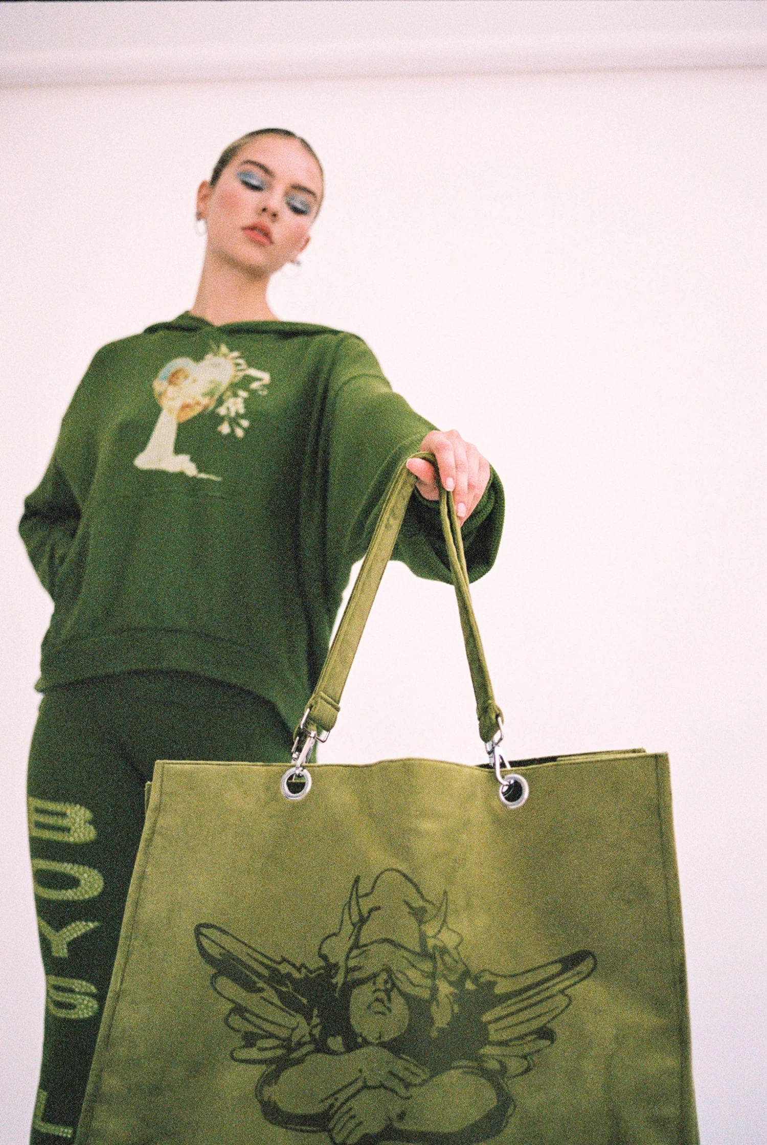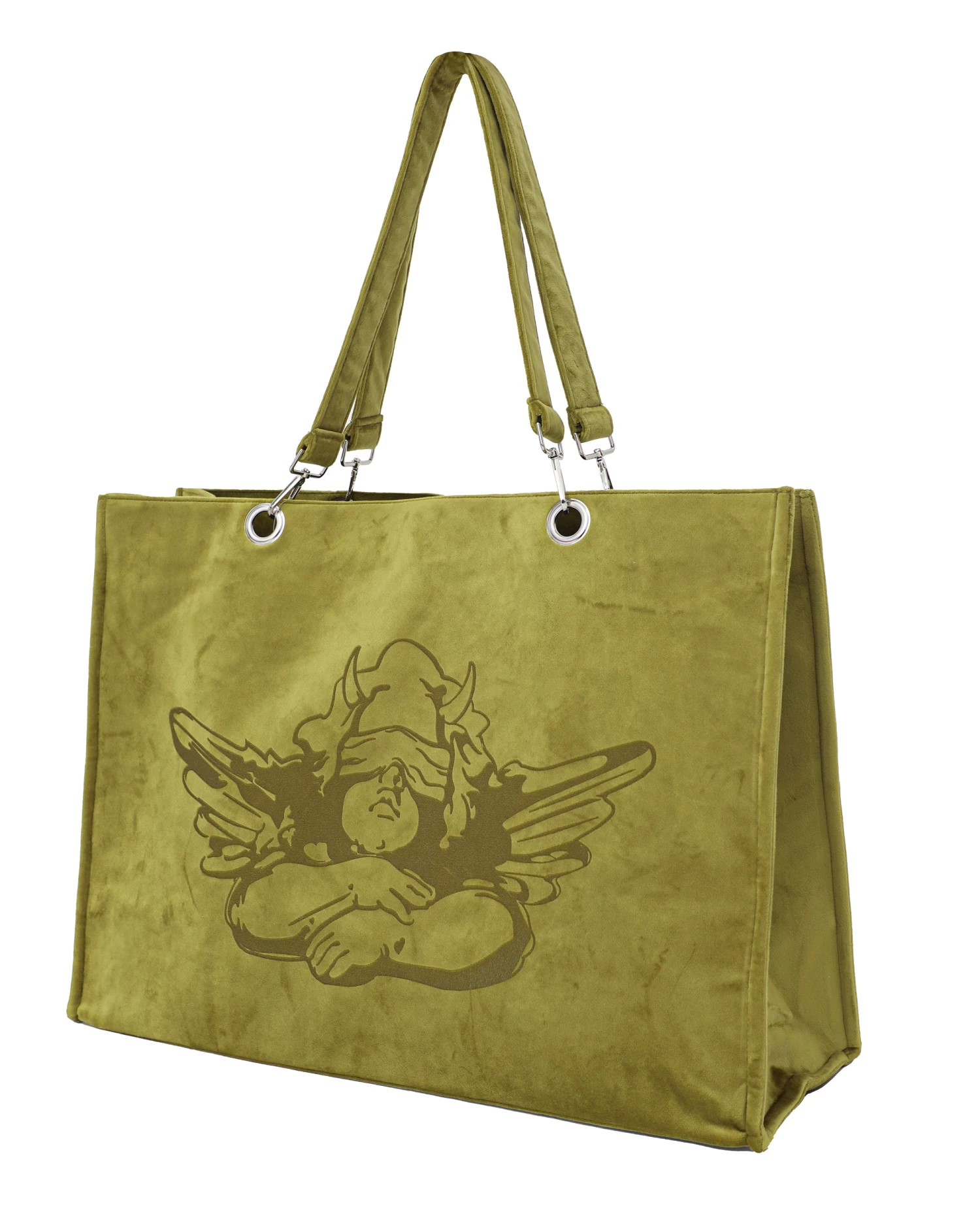 OversizedĀ olive greenĀ velourĀ structured tote. Small interior pocket, silver hardware, and magnetic closure.Ā