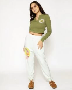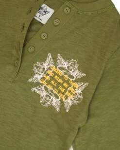 Olive green cropped henley long sleeve with button details and front embroidered graphic.Â