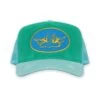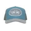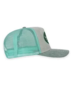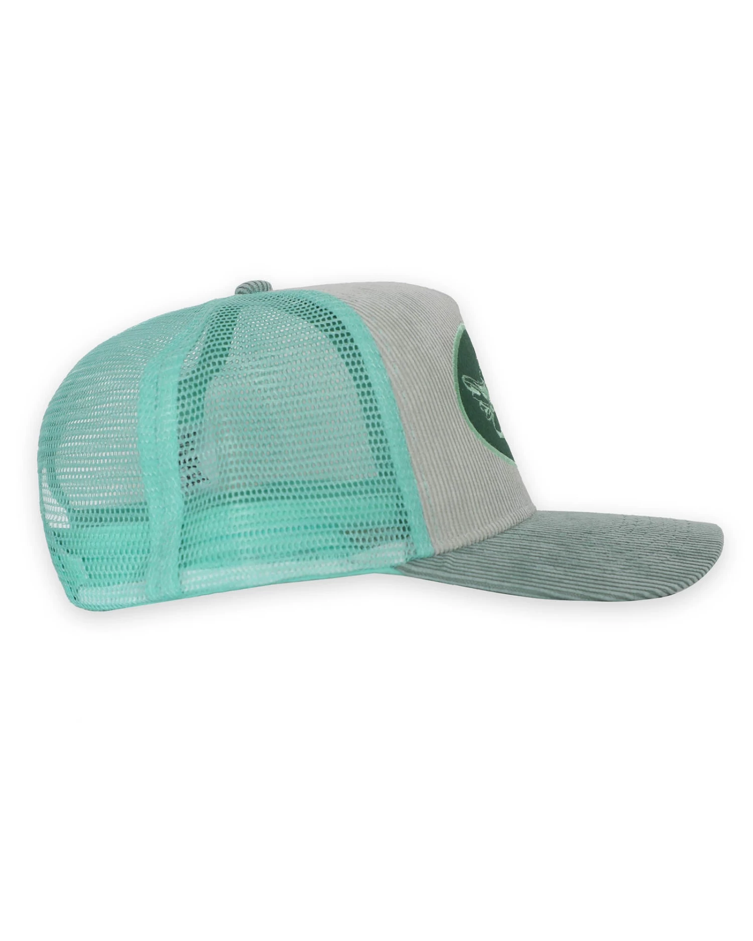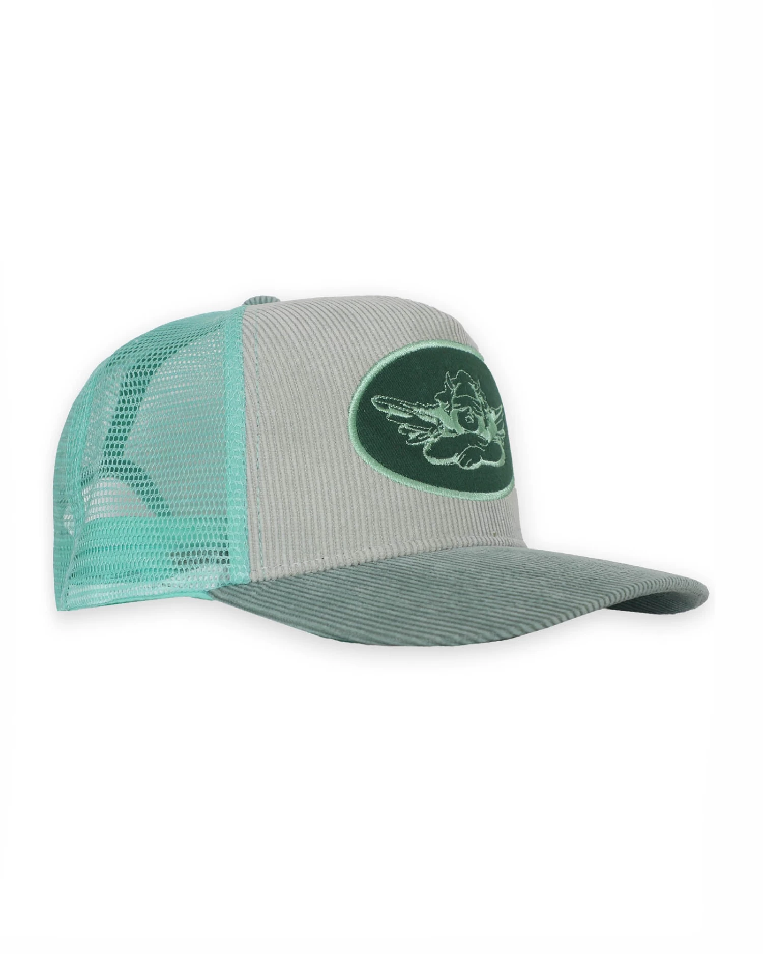 Aquamarine trucker hat with green patch and pale blue/grey corduroy. Adjustable snapback.Â