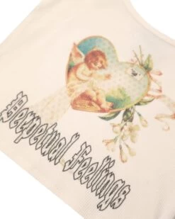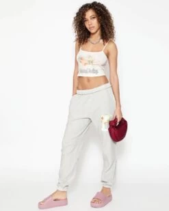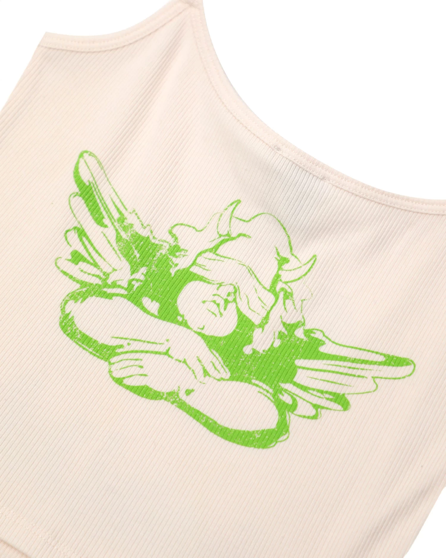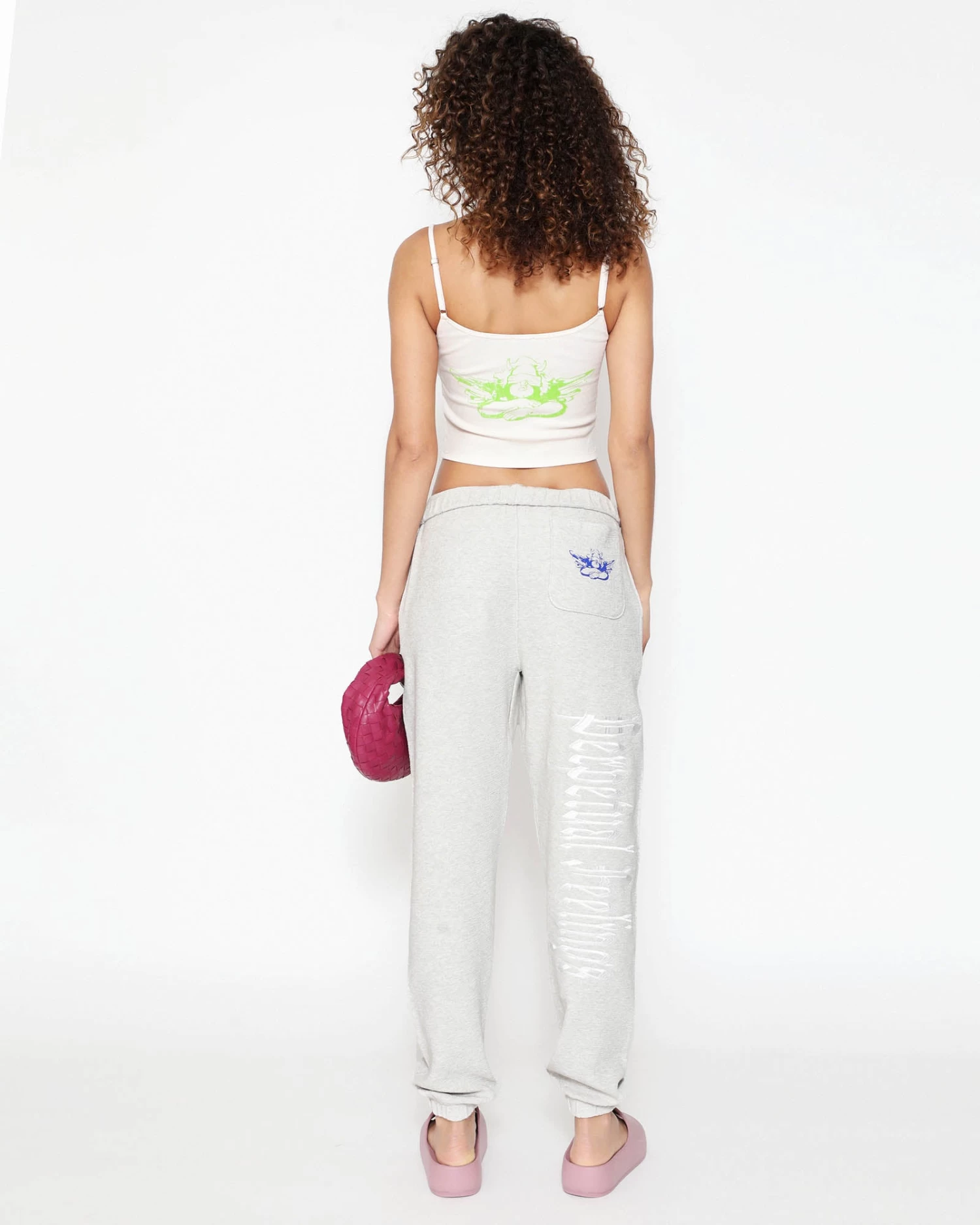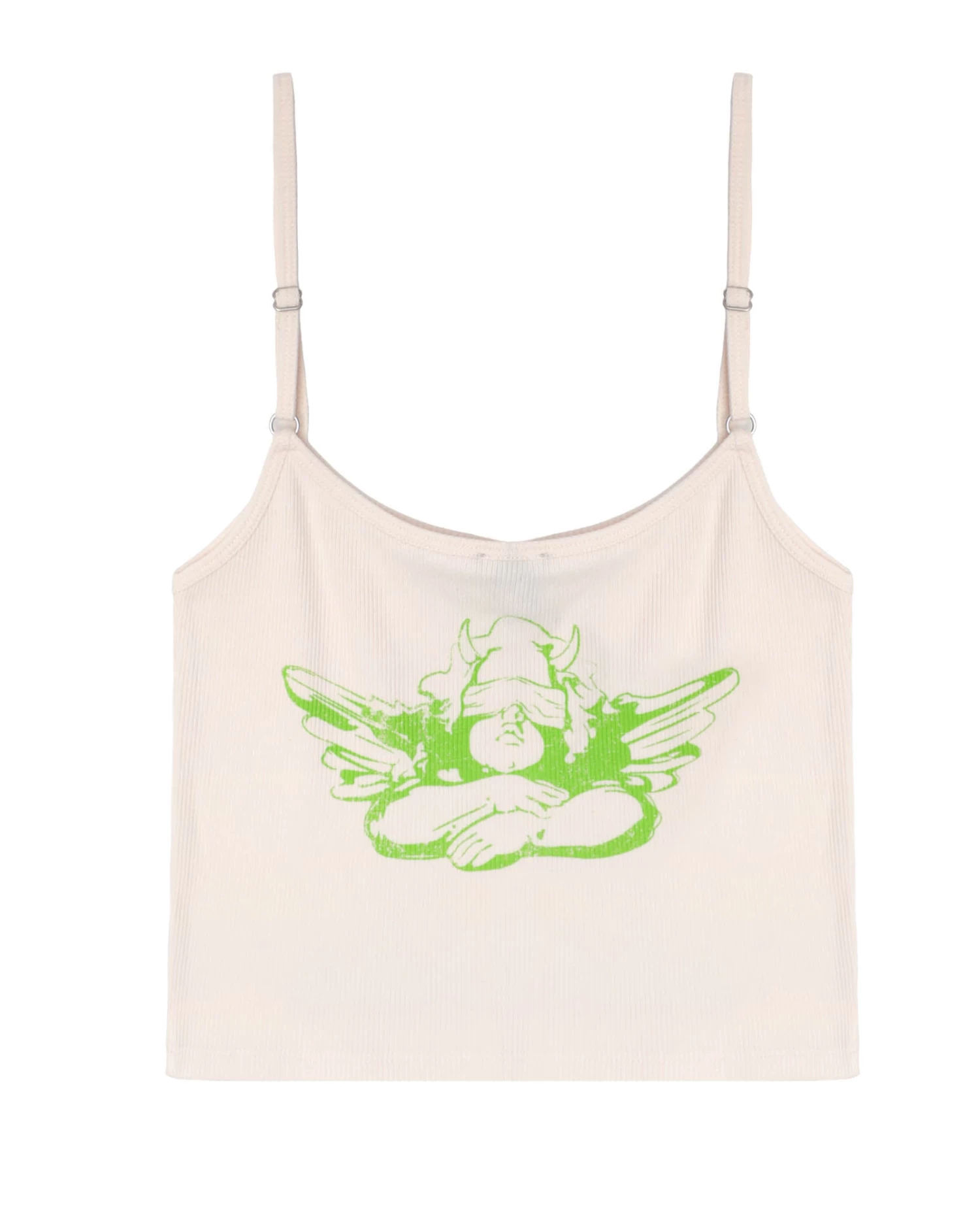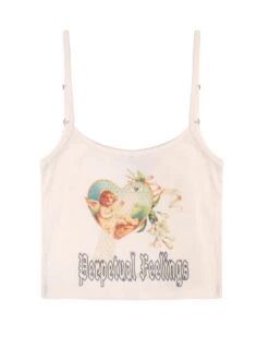 Ribbed crop tank in baby pink with adjustable straps, distressed logo, and rhinestone embellishments.Â
