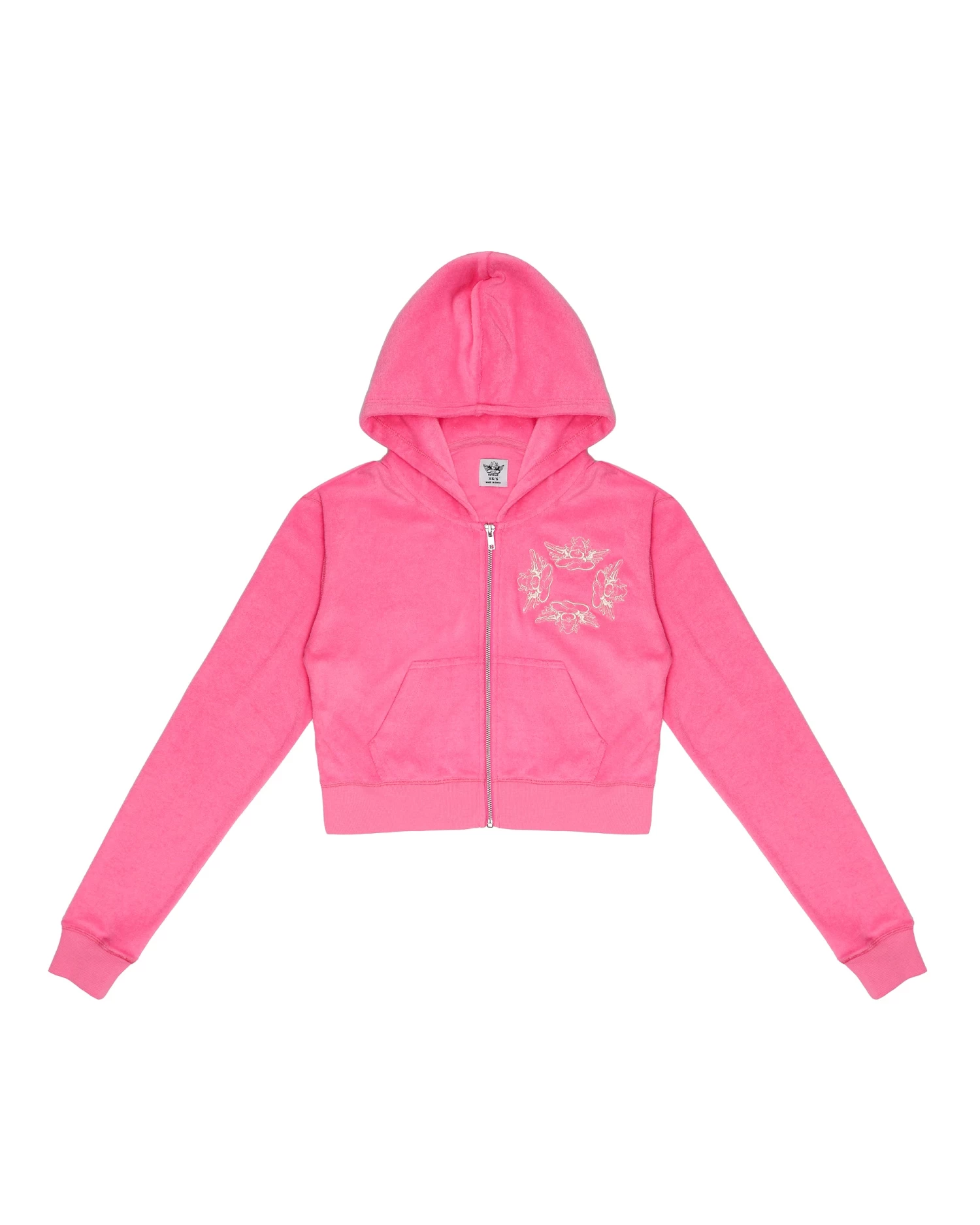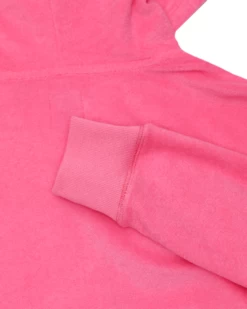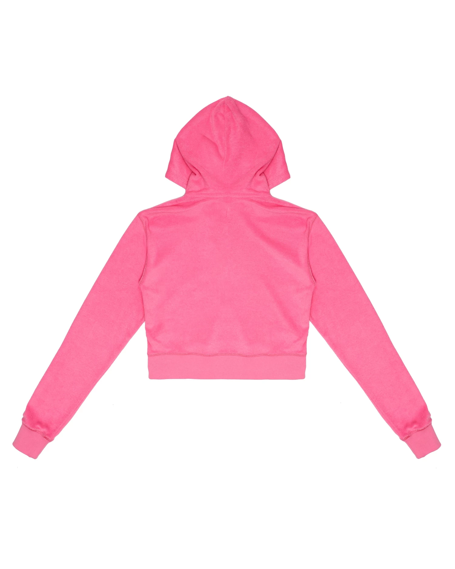 Lightweight terry cloth fabric in a neon pink. Zip up hoodie with cropped hem, front pockets, and ribbed cuffs. Features embroidered front logos.Â