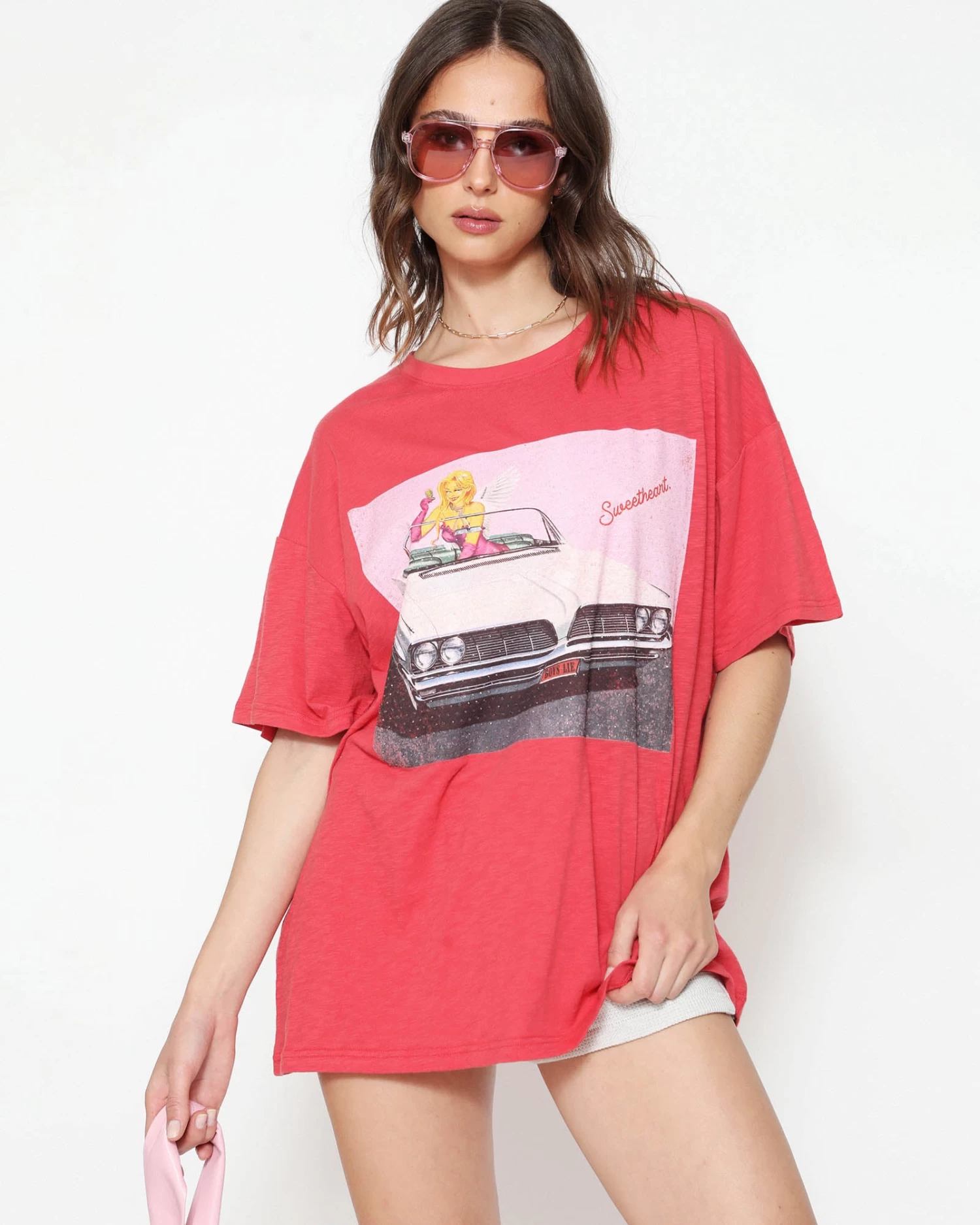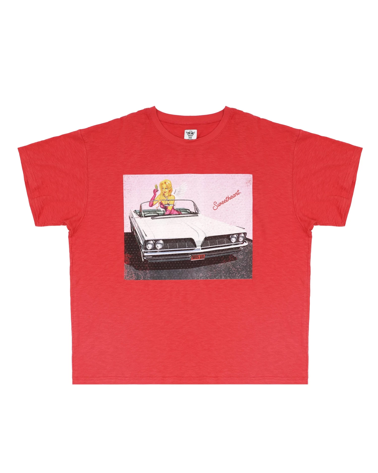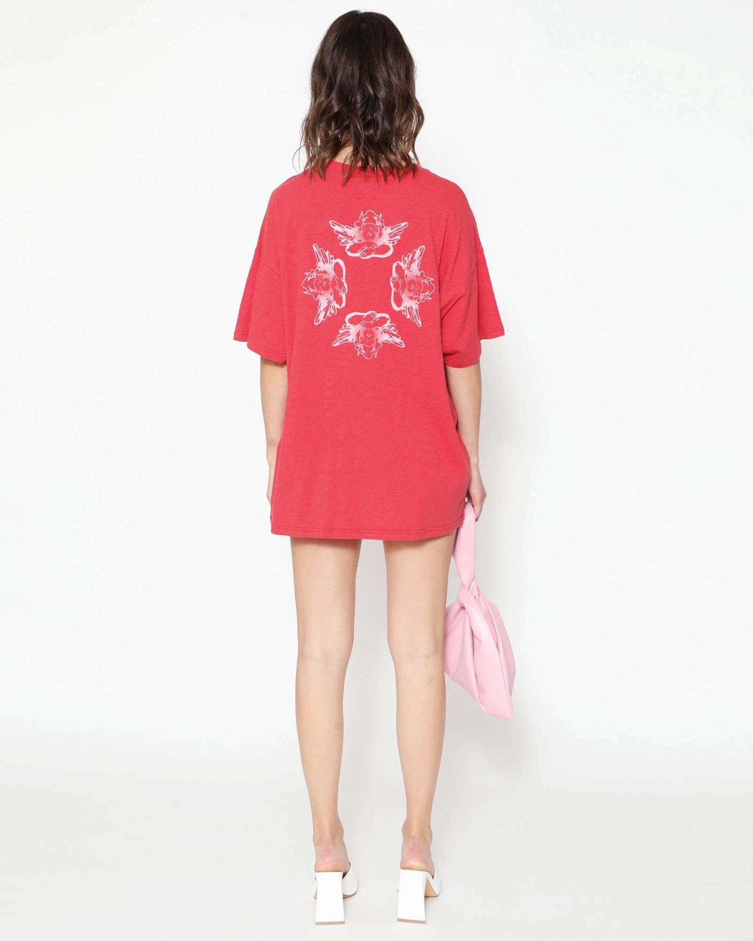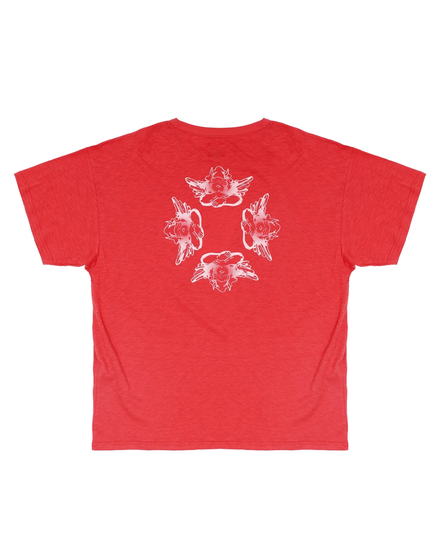 Lightweight and slightly sheer red tee in cotton slub jersey with an oversized fit. Features distressed graphics and rhinestone embellishments.Â