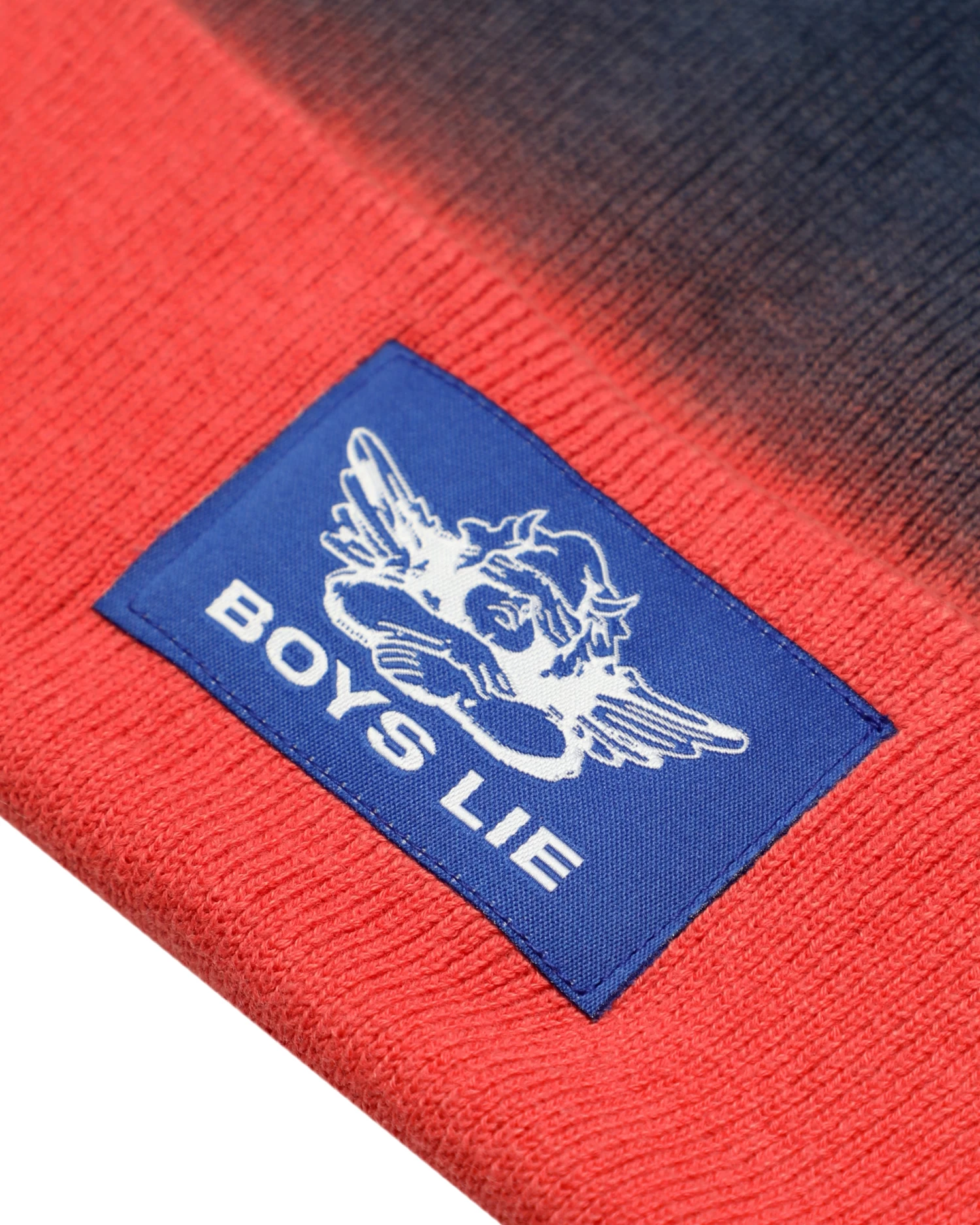 Red and navy dip-dye beanie with blue Boys Lie logo patch. This item is individually dyed and may show slight color variations.Â