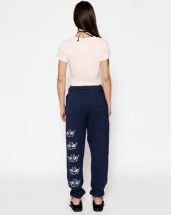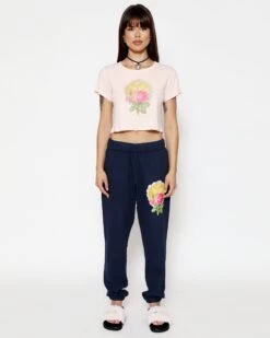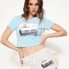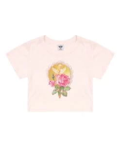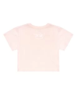 Pink ribbed crop tee with rounded neckline and cap sleeves. Features front and back graphic prints and rhinestone embellishments.
