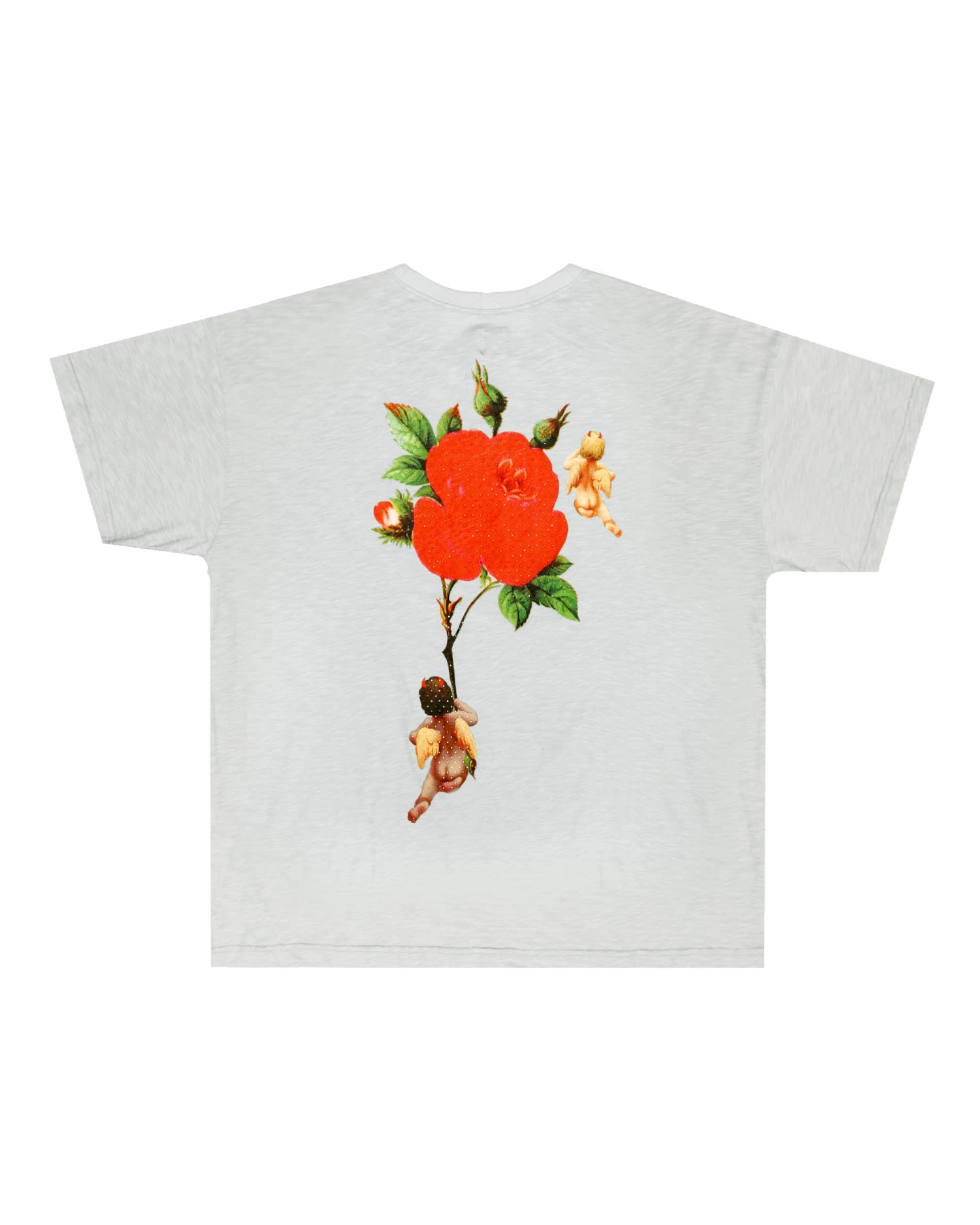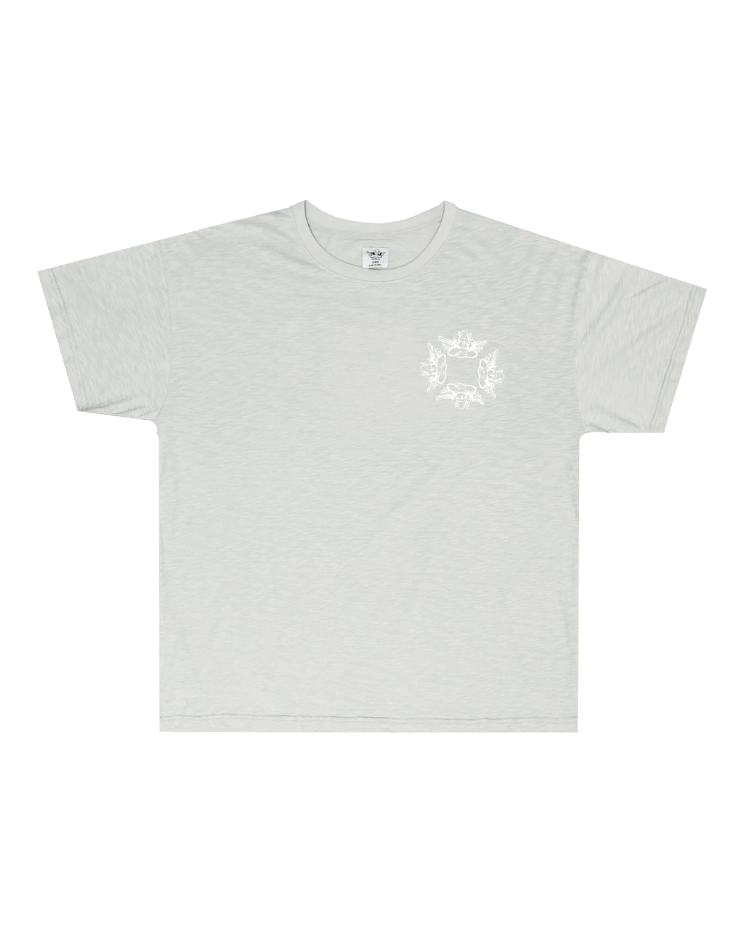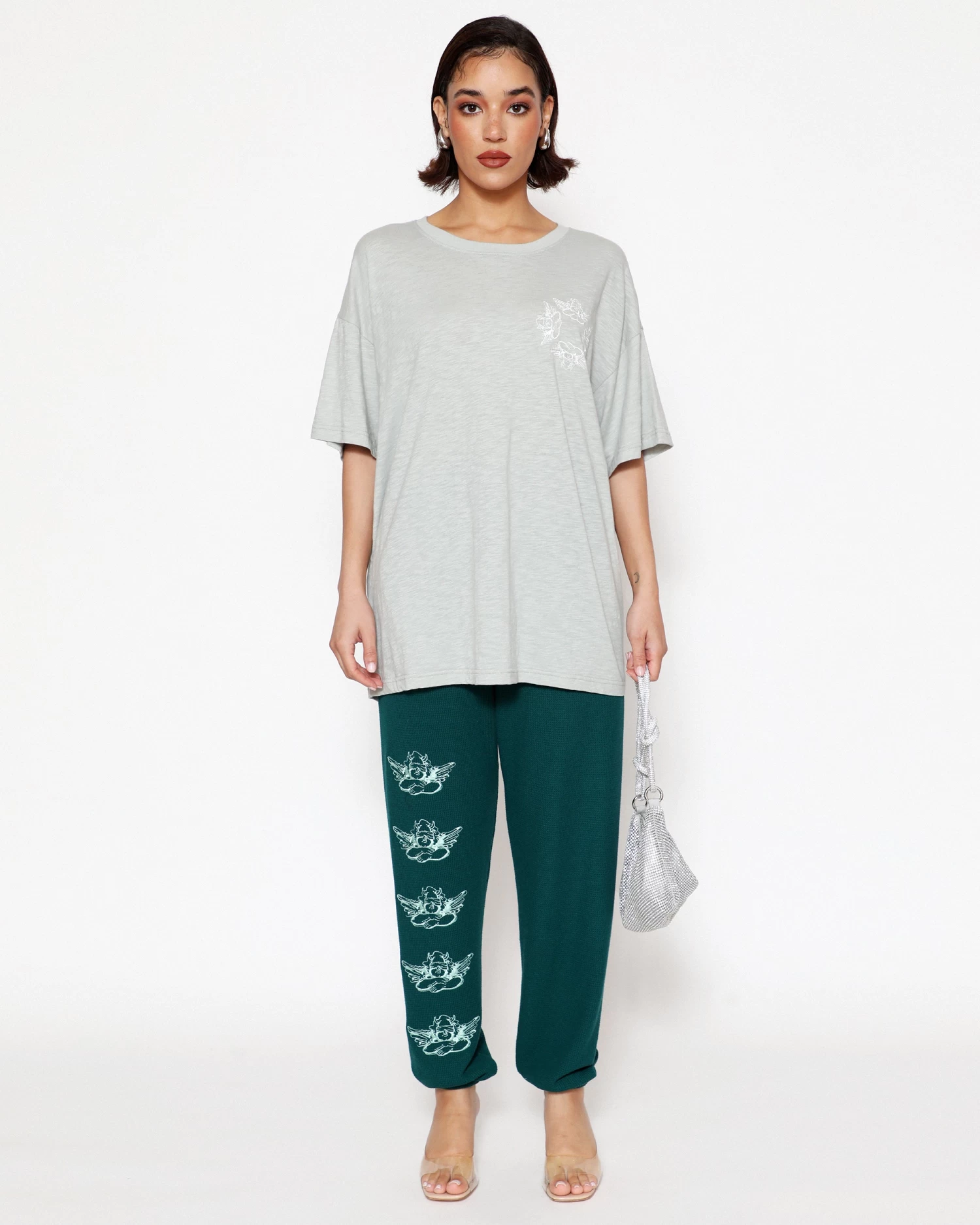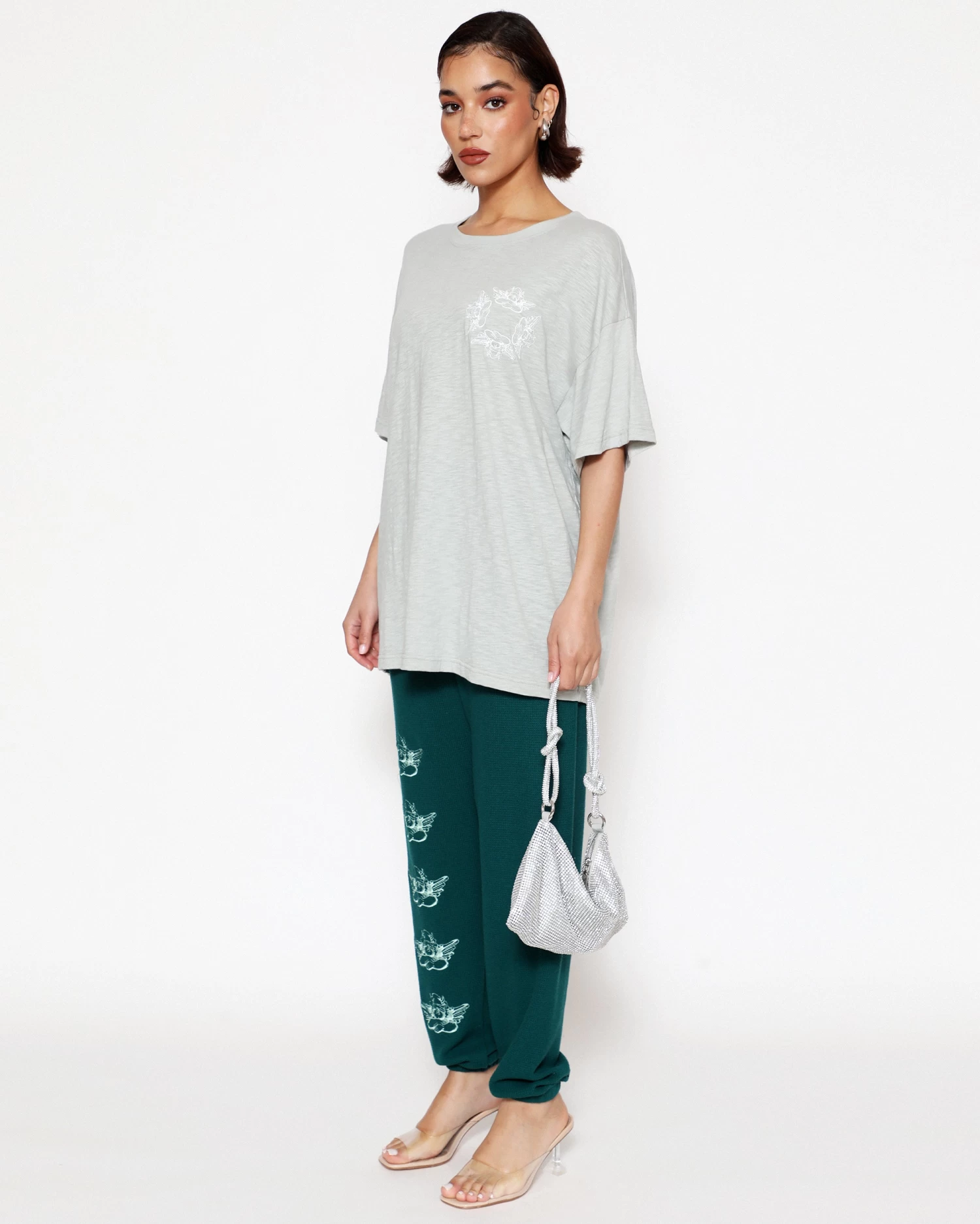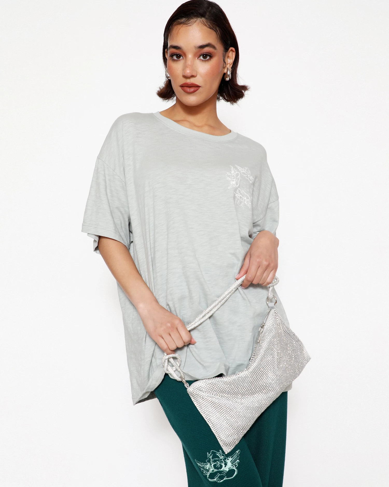 Lightweight and slightly sheer sage tee in cotton slub jersey with an oversized fit. Features rhinestone embellishments.Â