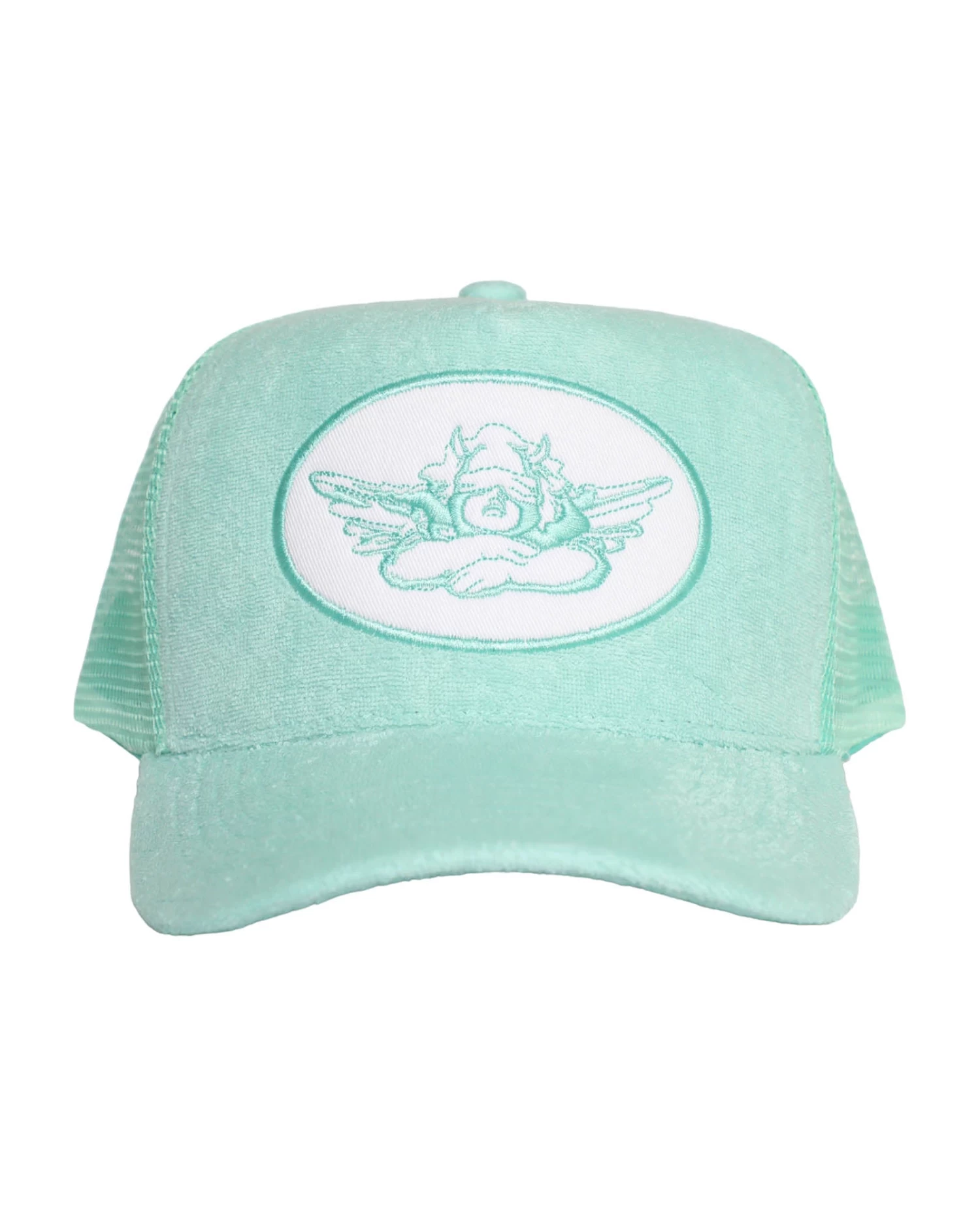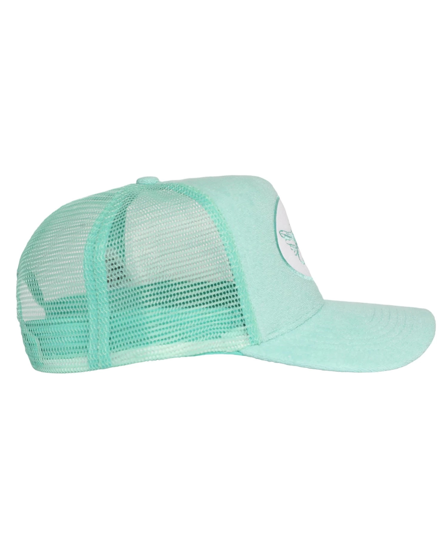 Mint green trucker hat with white patch and mint green terry cloth. Adjustable snapback.Â