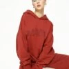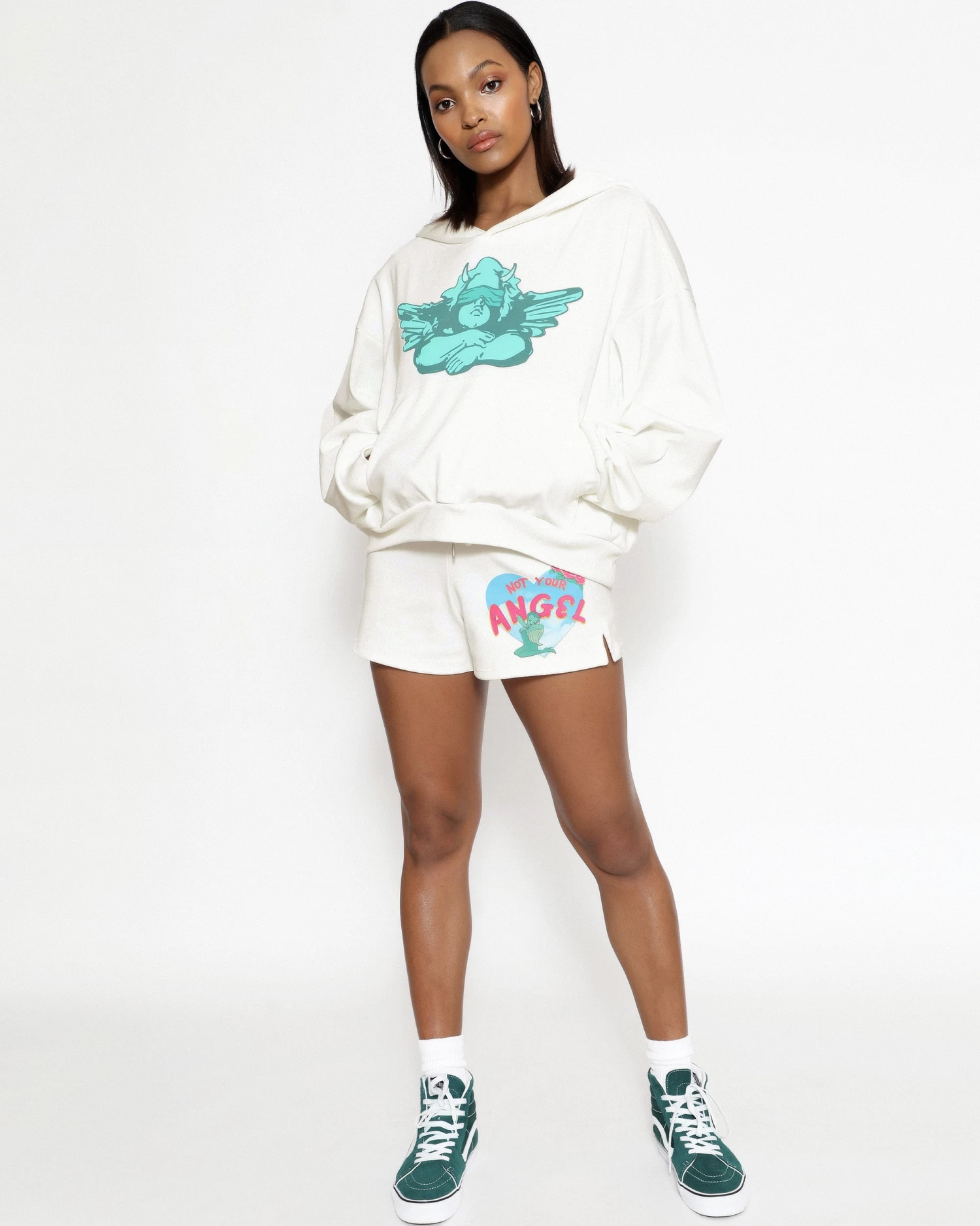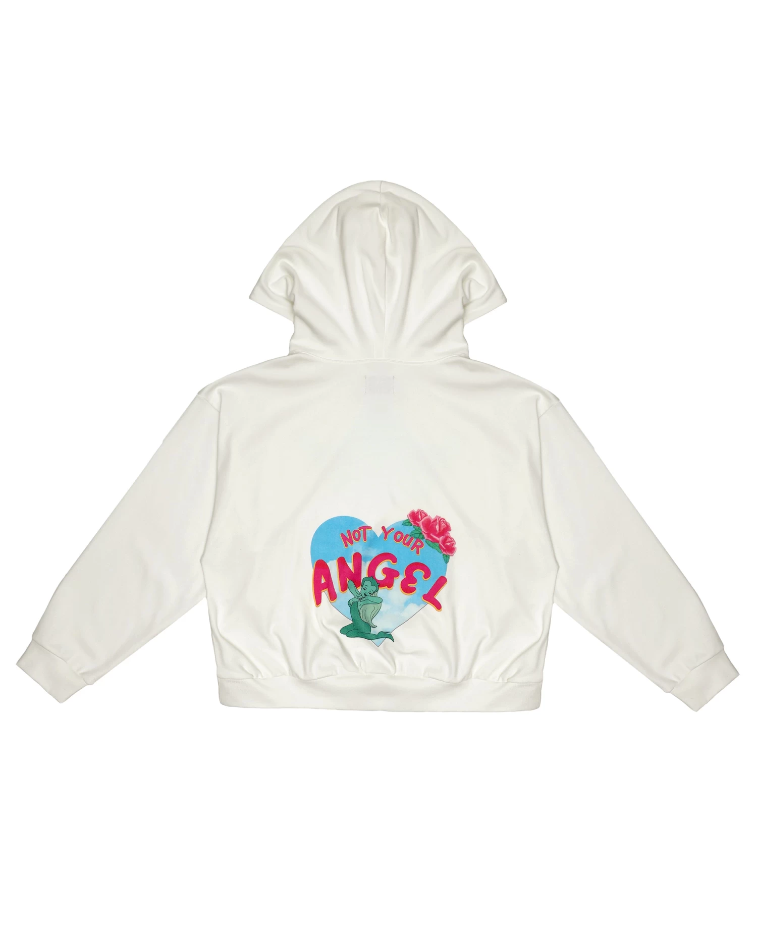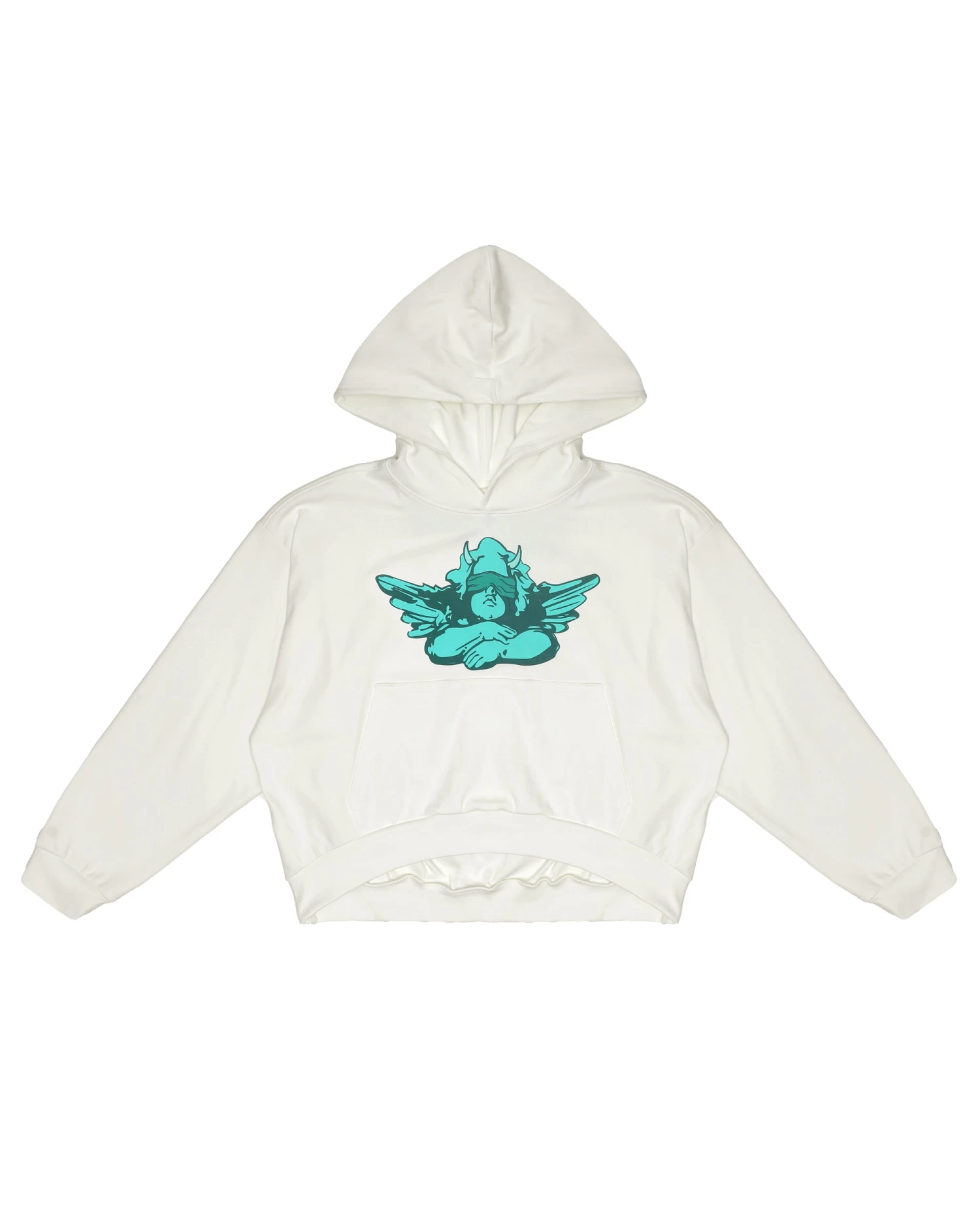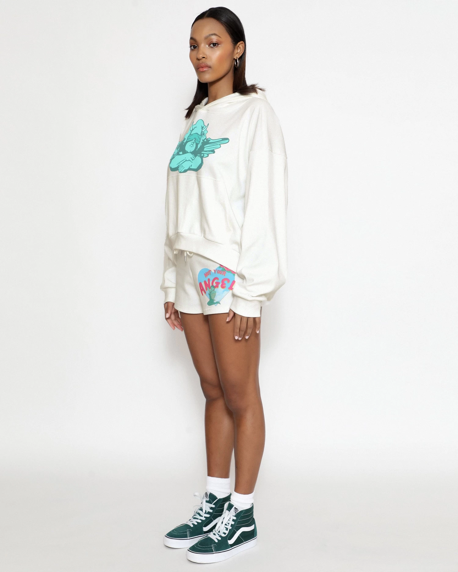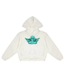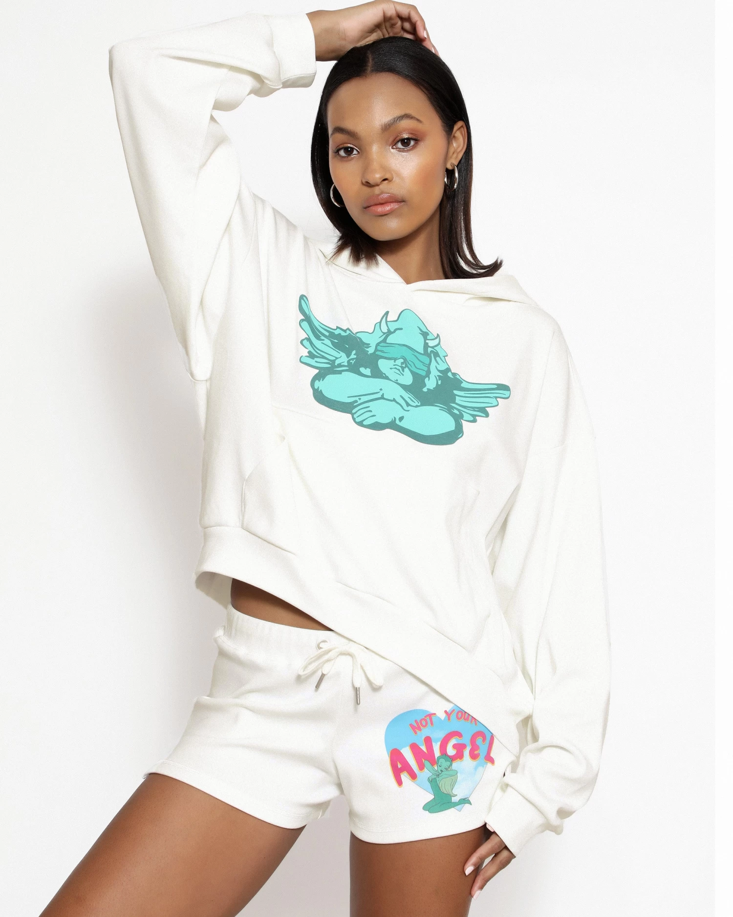 Heavyweight ribbed fabric in cream. Oversized cropped hoodie featuring a dramatic hood, front pocket, and slightly curved front hem.Â