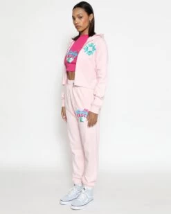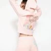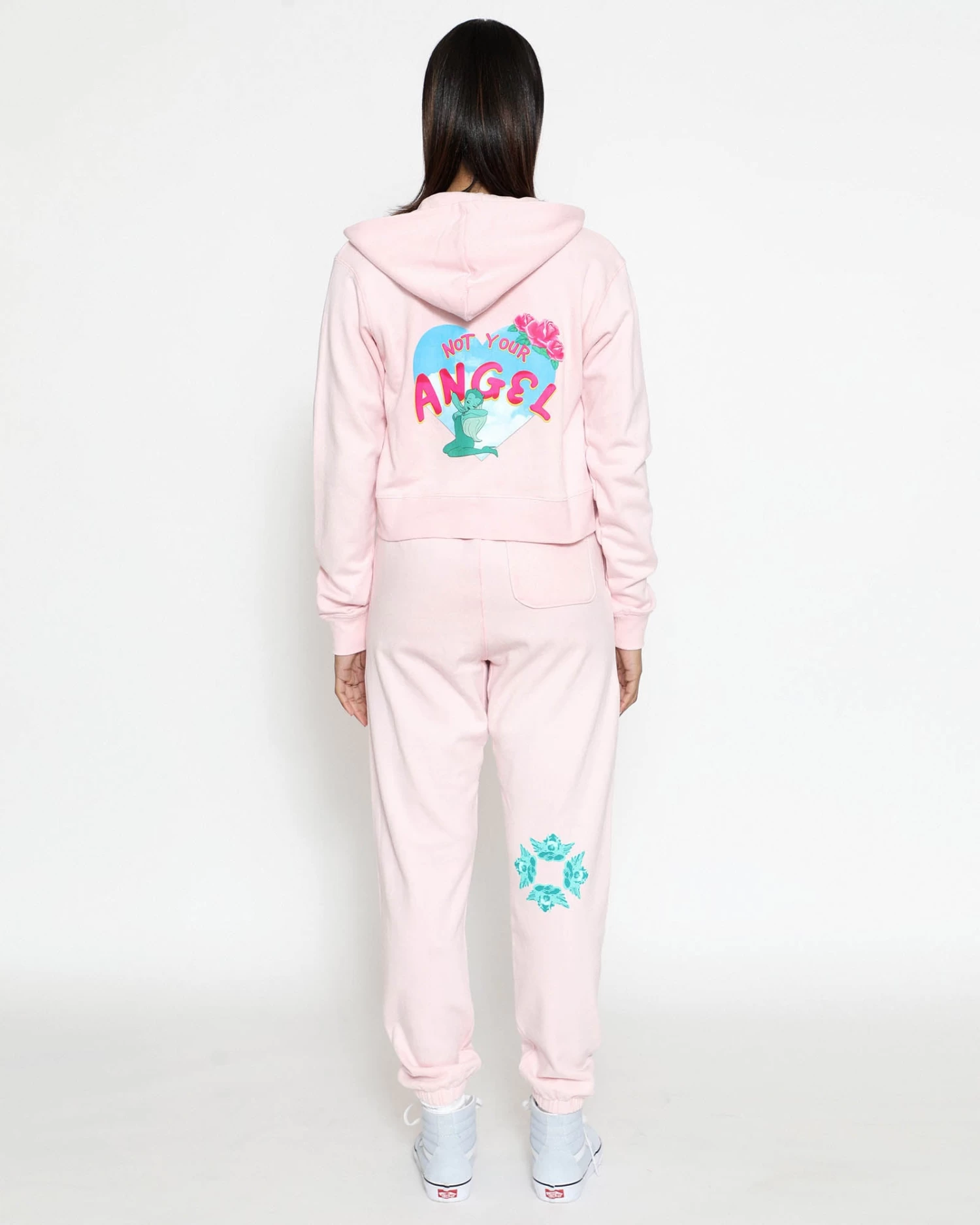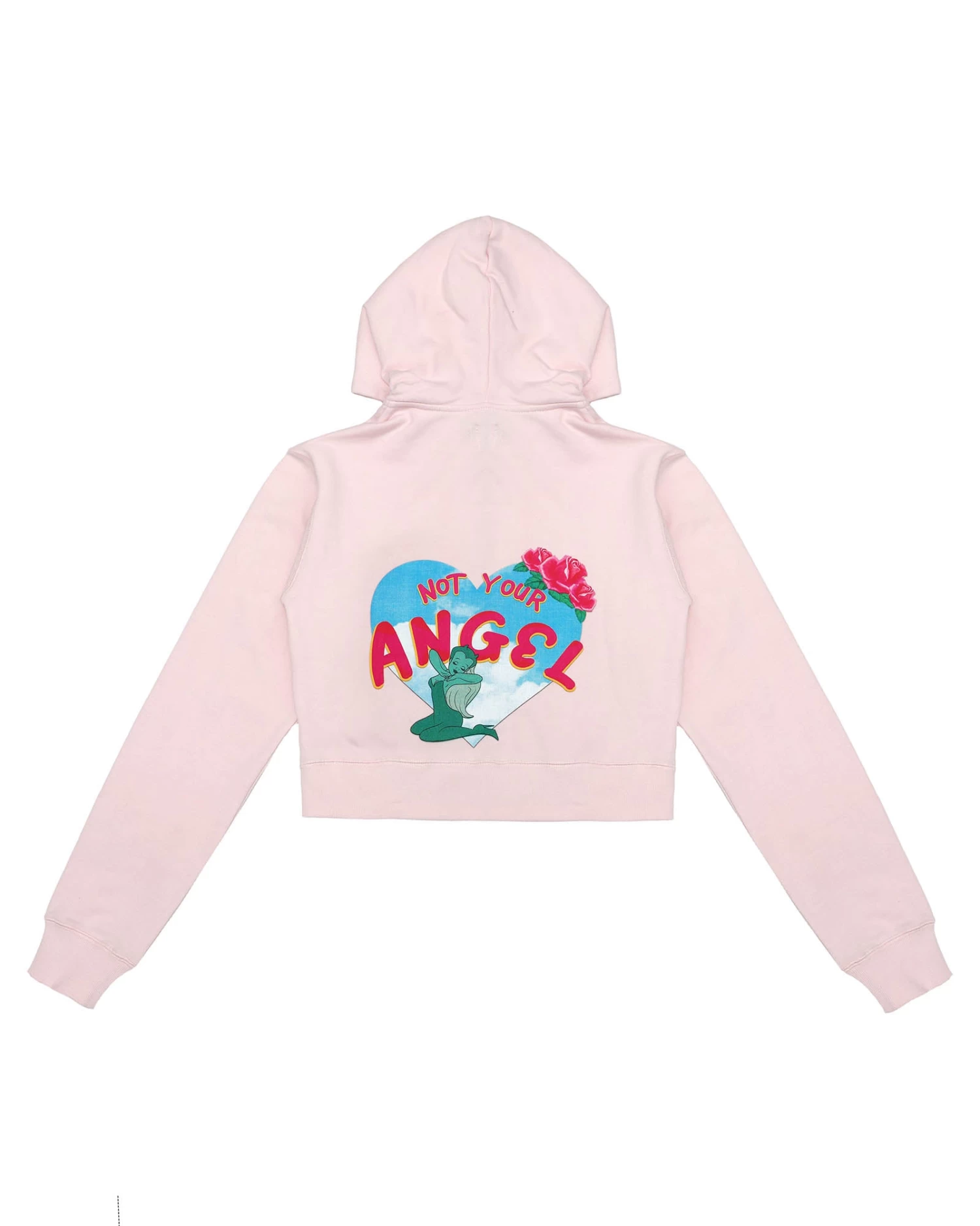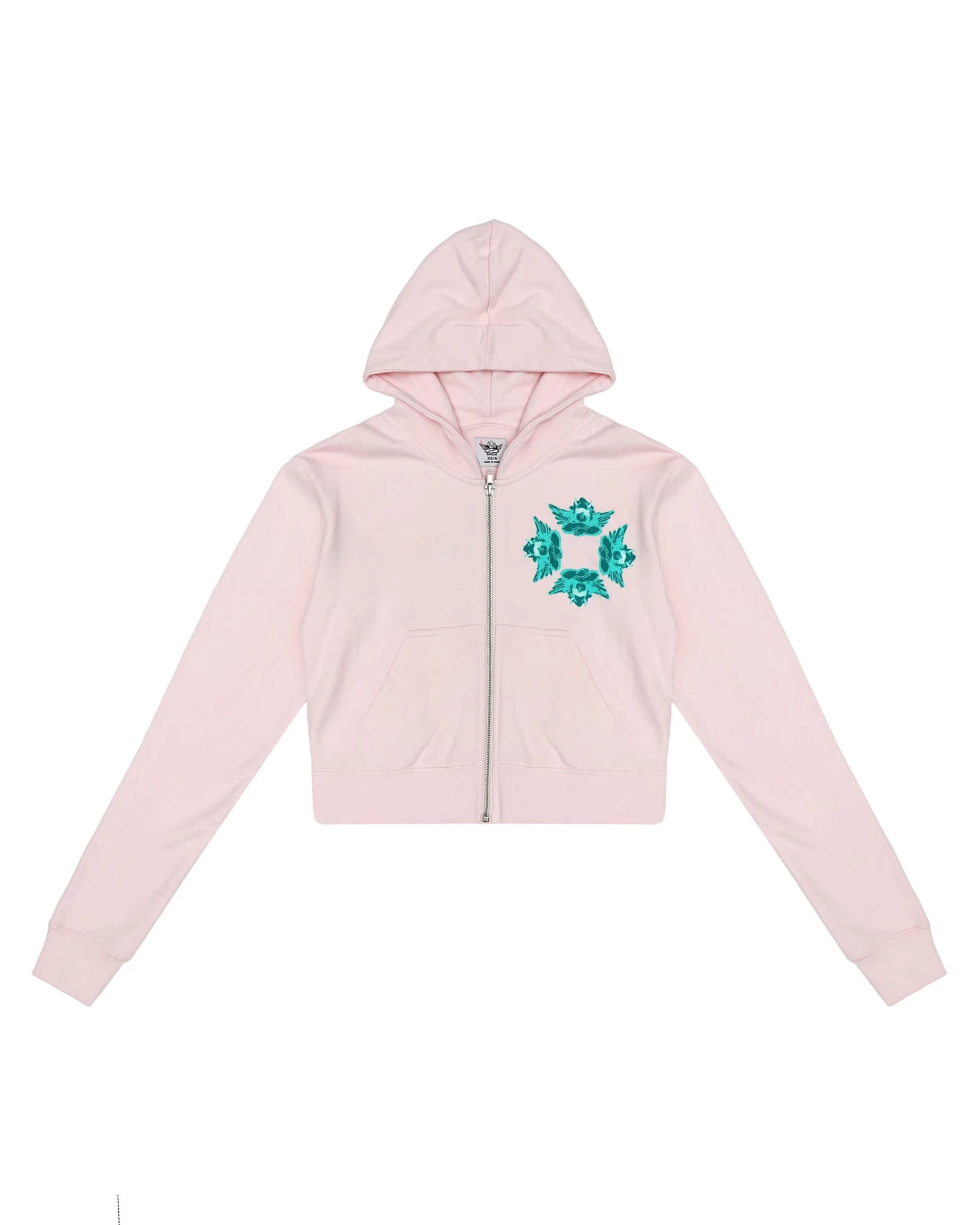 Lightweight french terry fabric in pink. Zip up hoodie with cropped hem, front pockets, and ribbed cuffs.Â