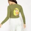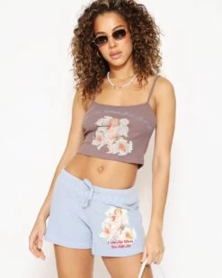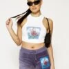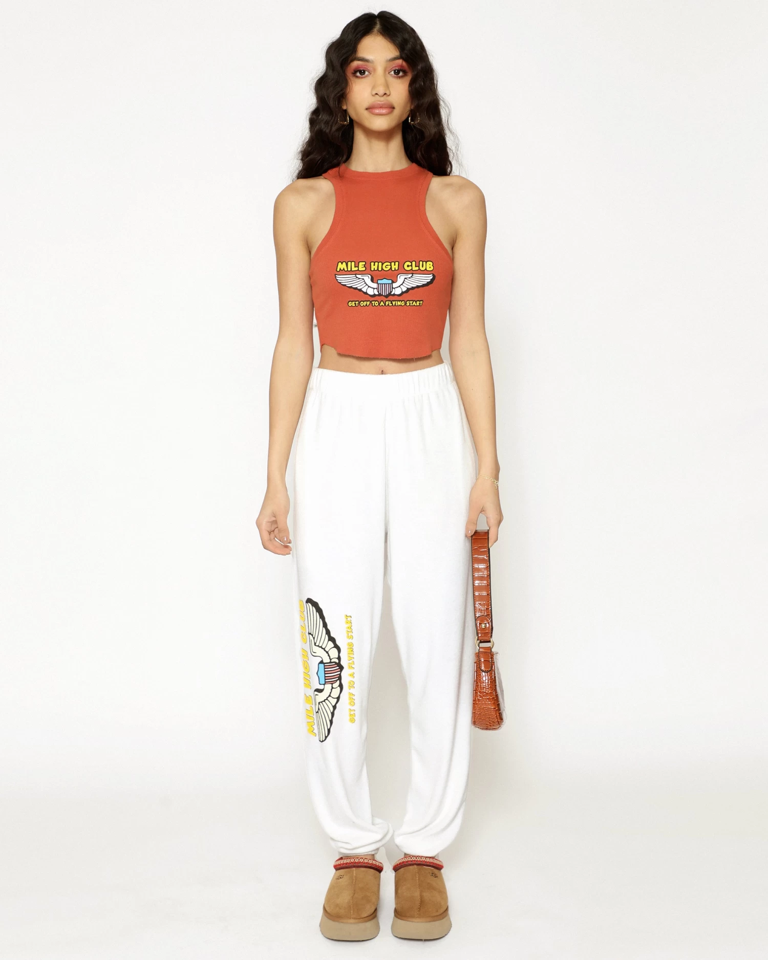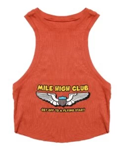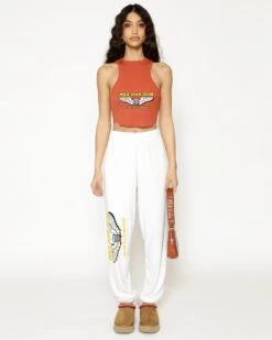 Ribbed crop tank in terracotta red. Curved hem with a raw edge and racerback neckline. Logos printed with vintage effect.Â