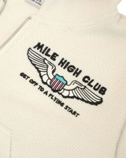 Lightweight and soft thermal fabric in cream. Zip up hoodie with cropped hem, front pockets, and embroidered front graphic. Features logos printed with vintage effect.Â