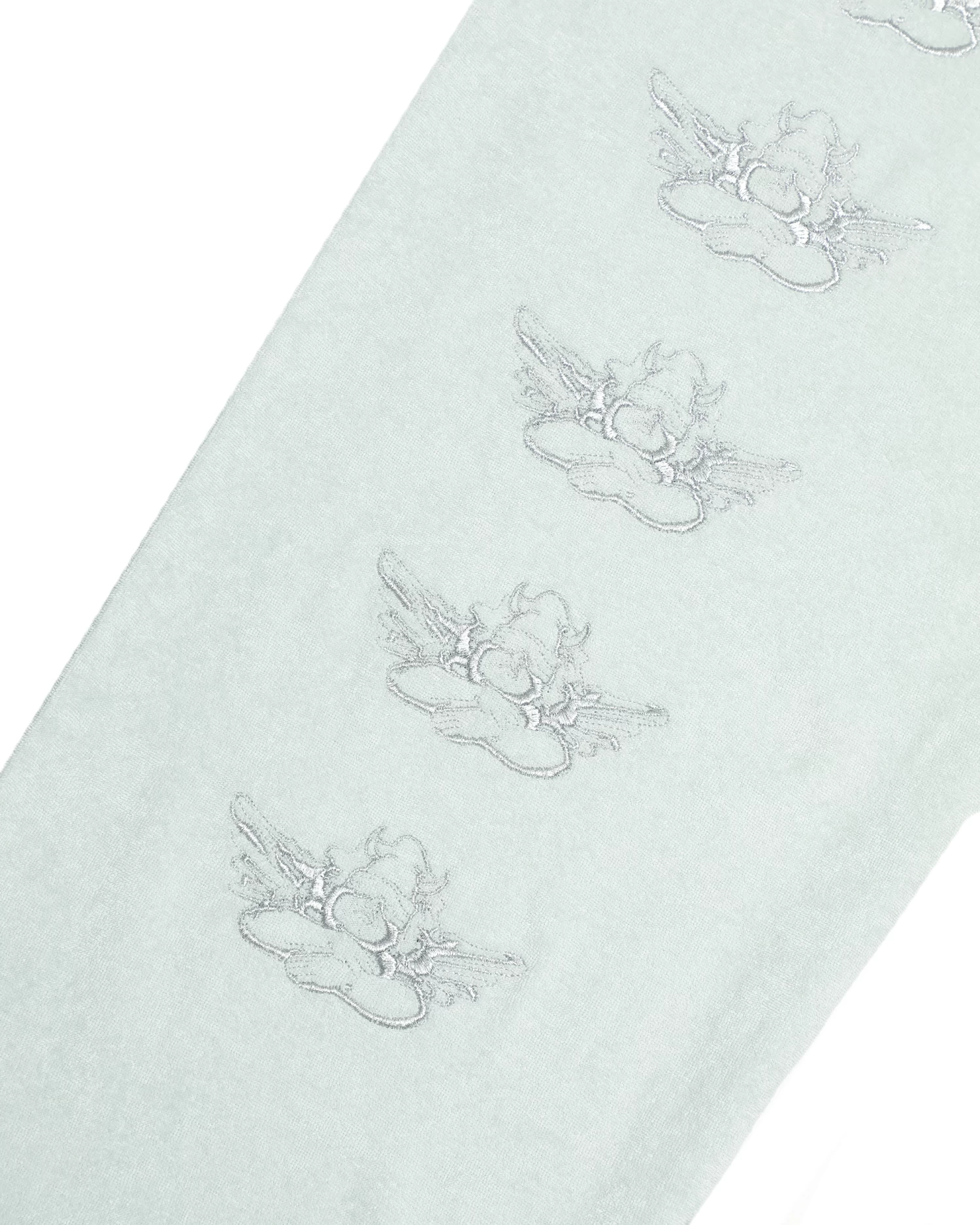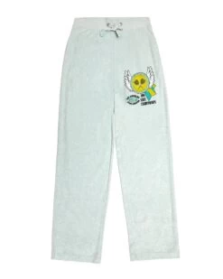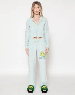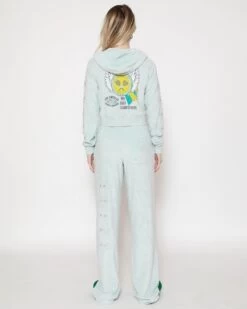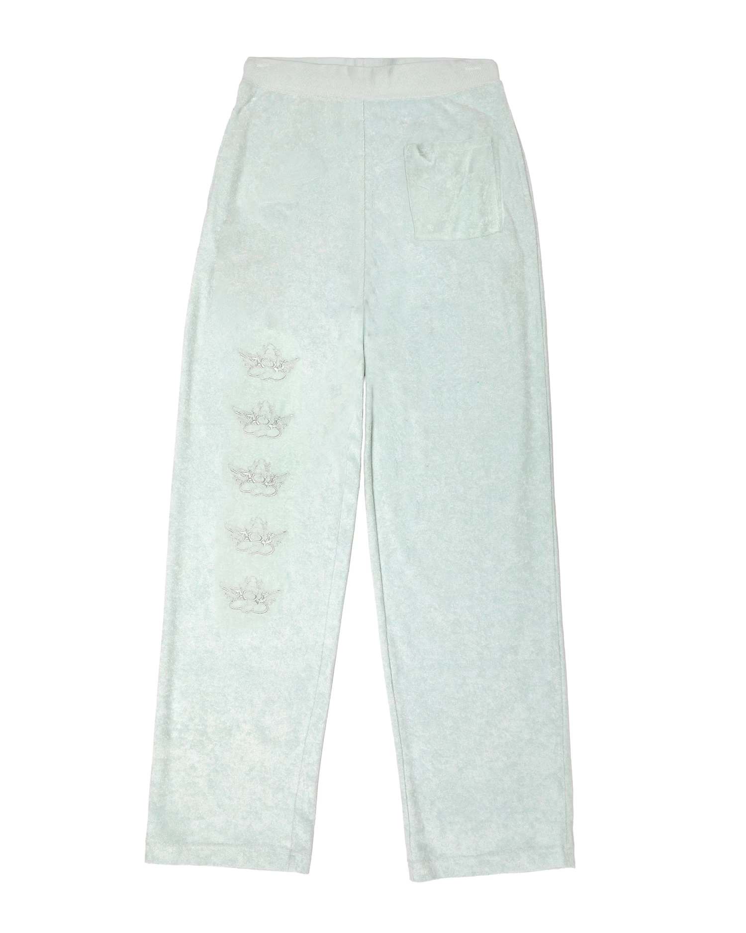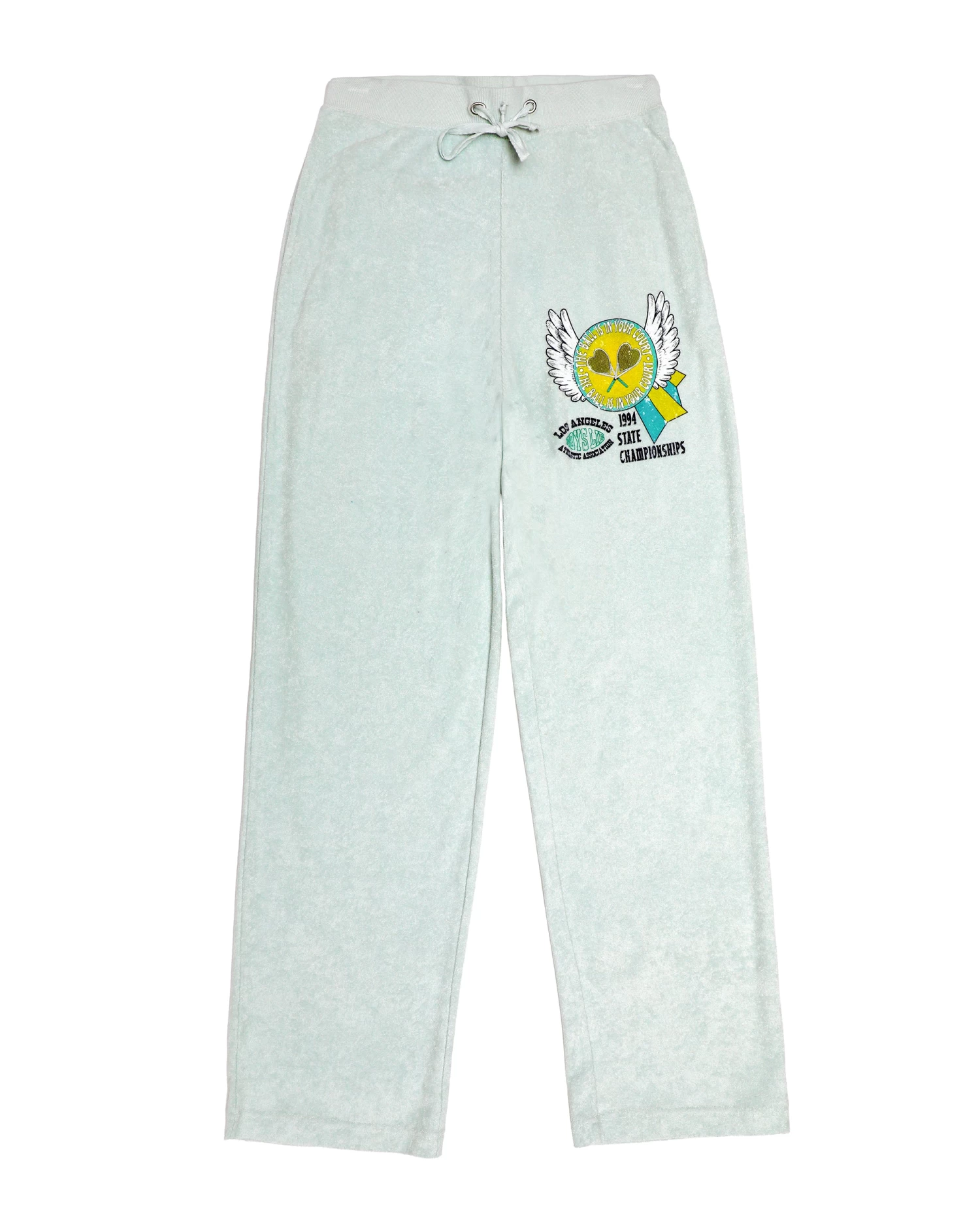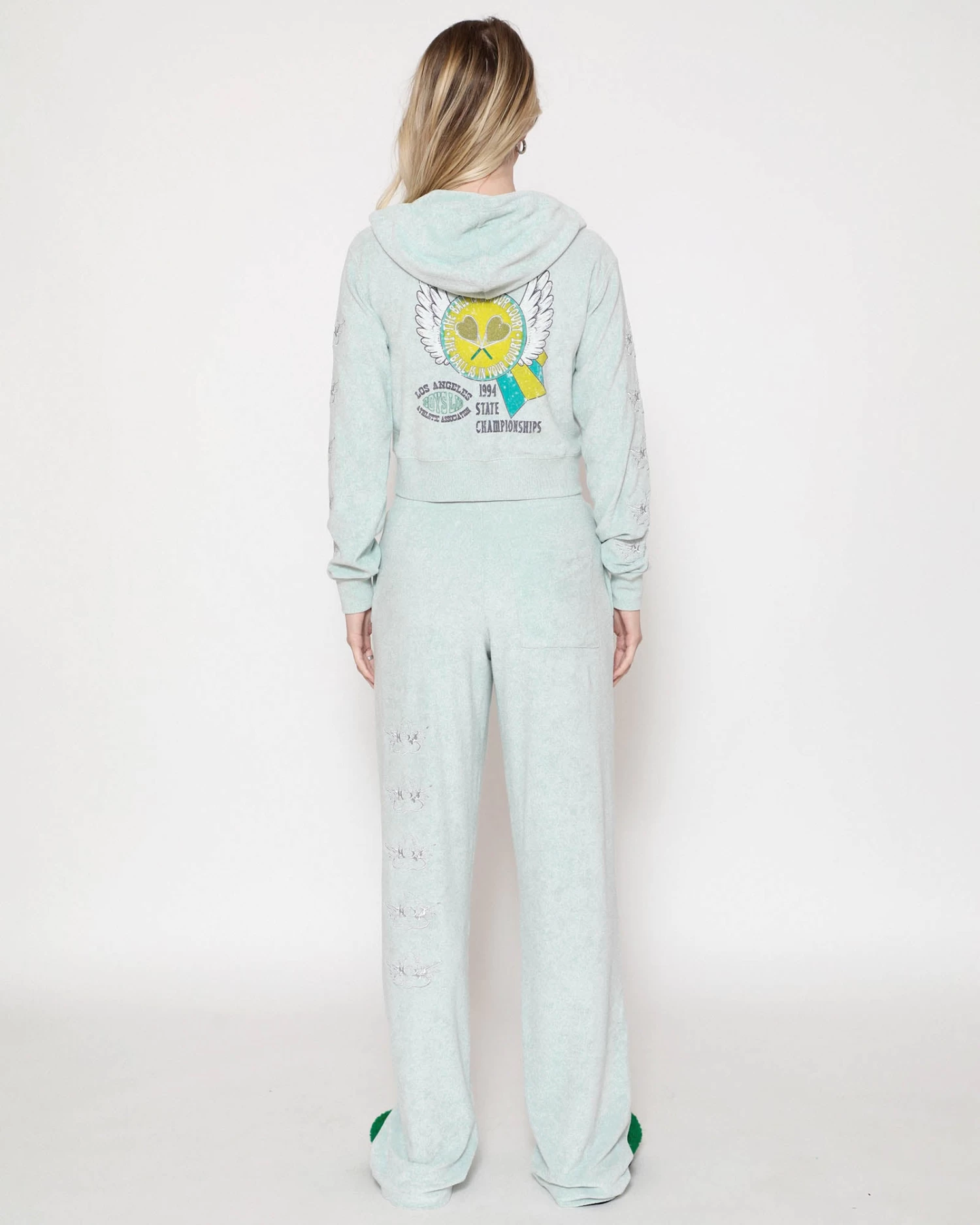 Lightweight terry cloth fabric in light blue-green. High rise sweatpants with side pockets, a drawstring waist, and straight leg with long inseam. Features metallic embroidery down the legs.Â