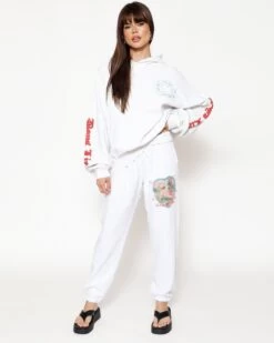 Inside out french terry in white. High rise sweatpants with back and side pockets, elastic waistband and cuffs. Printed front and back graphics.