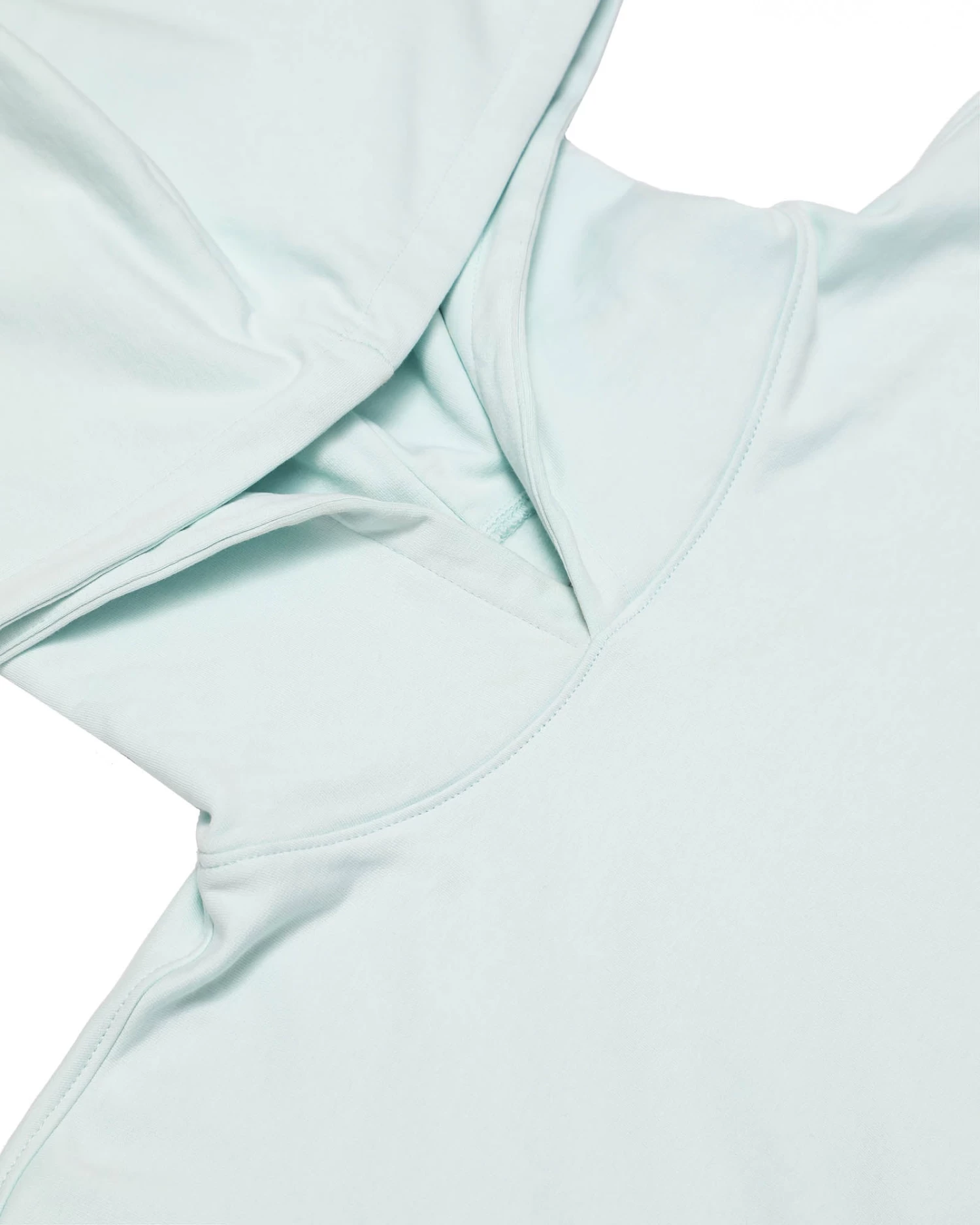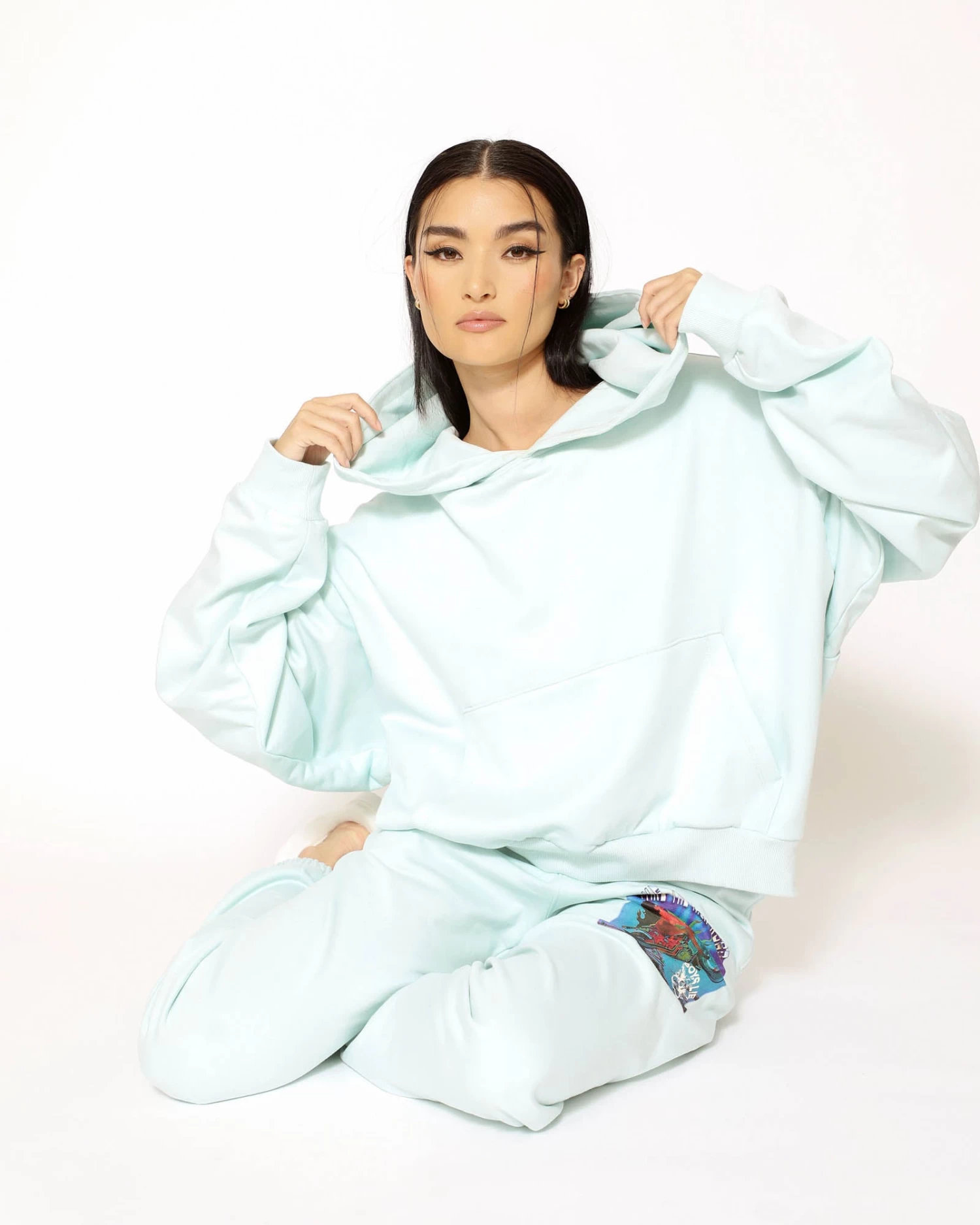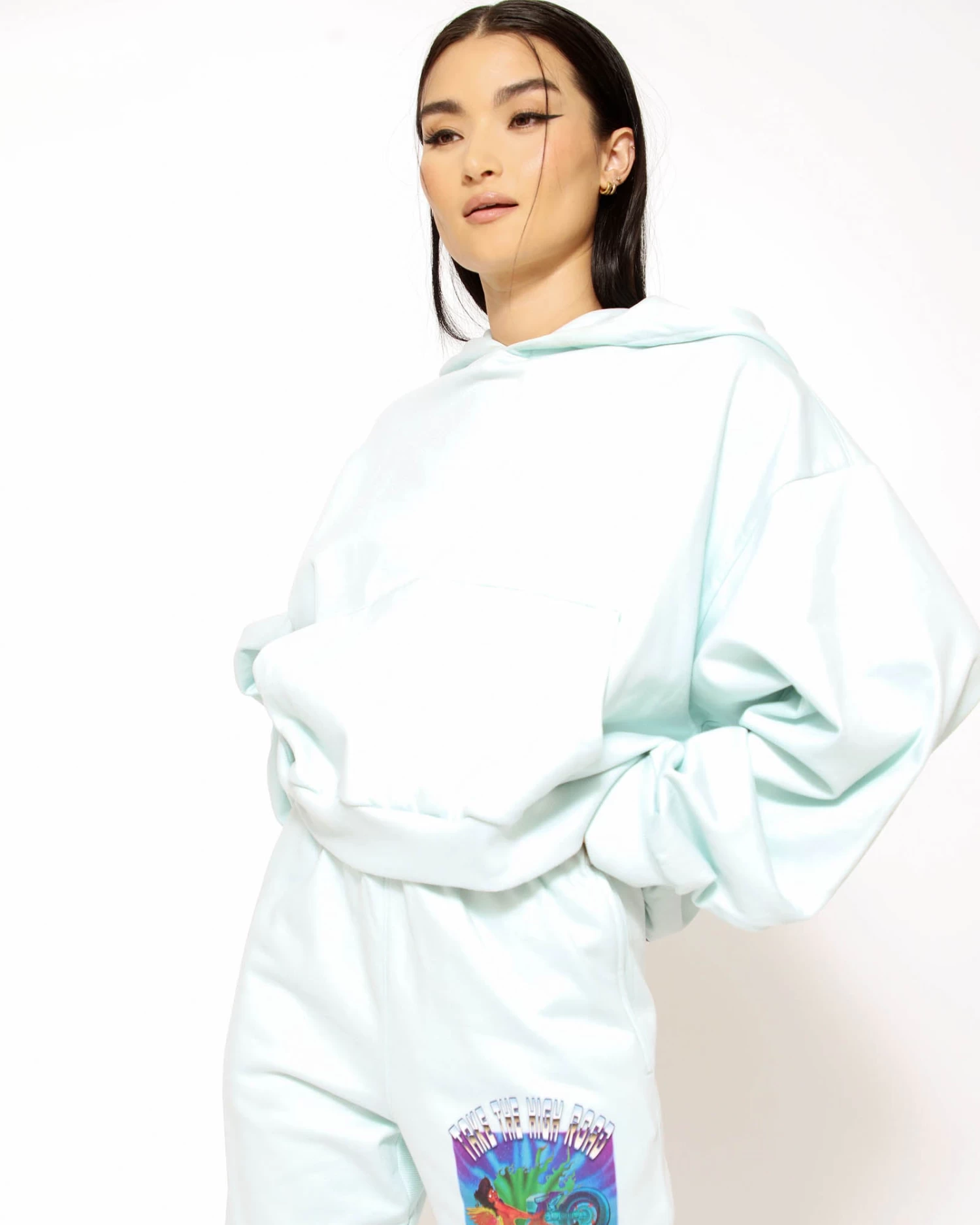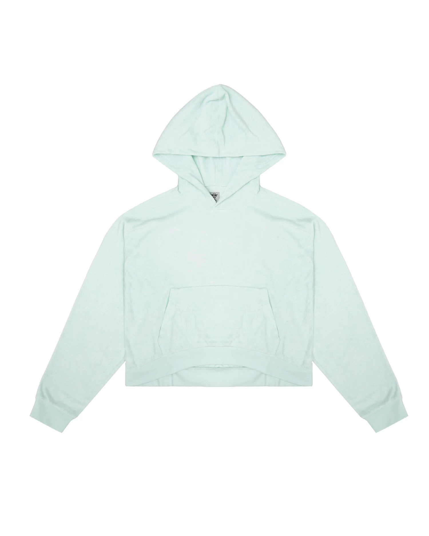 Mid-weight fleece fabric in mint green. Oversized cropped hoodie featuring a dramatic hood, front pocket, and slightly curved front hem.Â