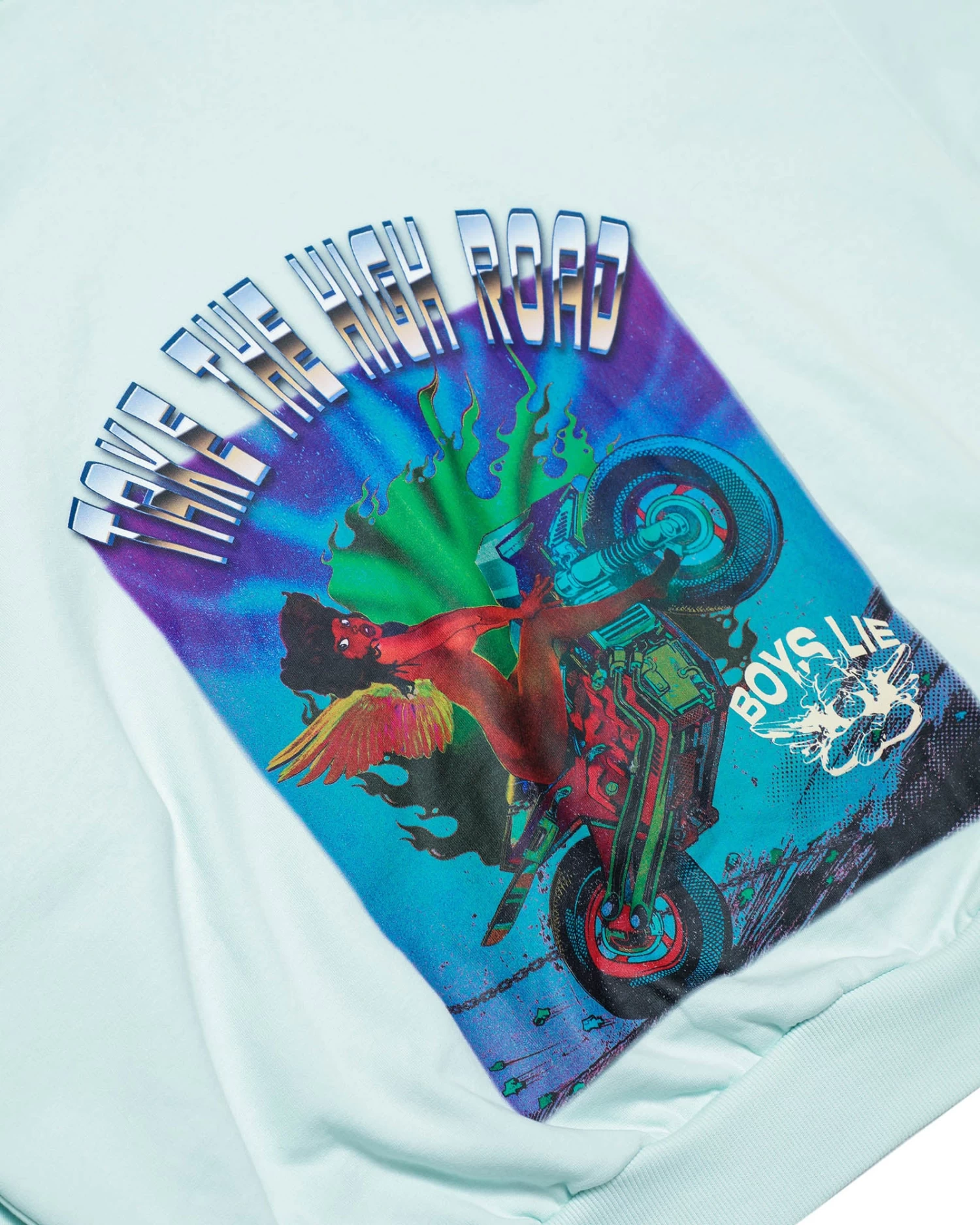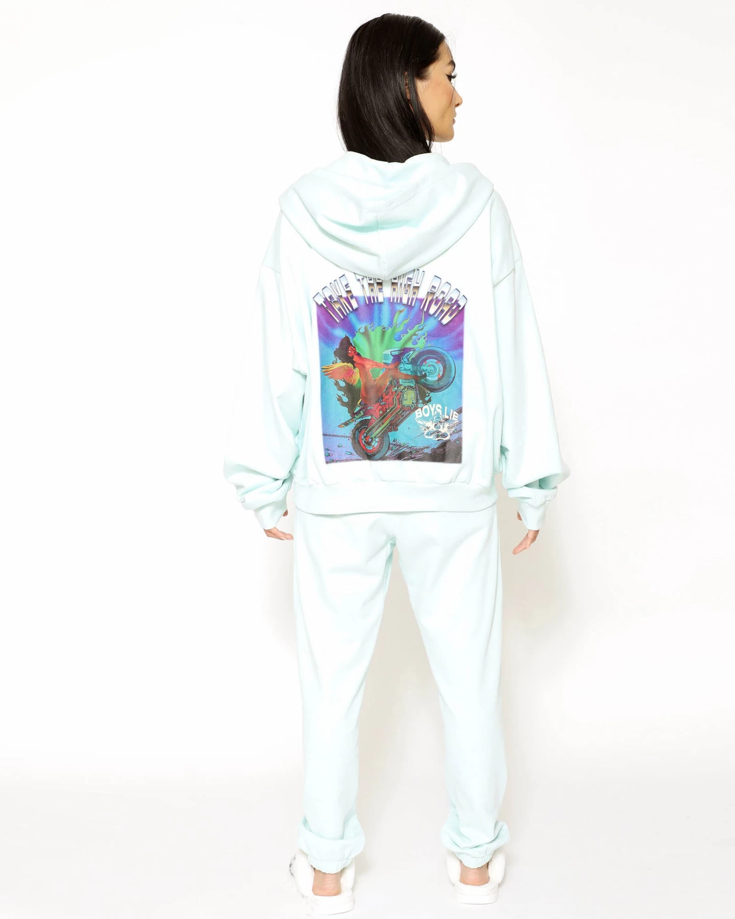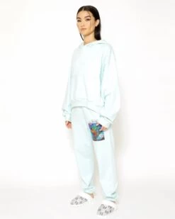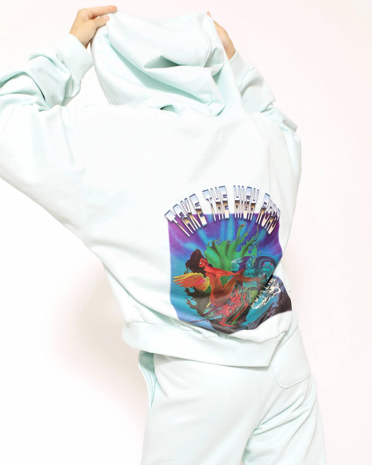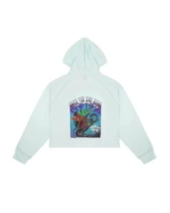 Mid-weight fleece fabric in mint green. Oversized cropped hoodie featuring a dramatic hood, front pocket, and slightly curved front hem.Â