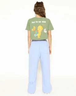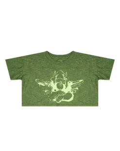 Cotton slub cropped baby tee in green. Lightweight and slightly sheer with distressed graphics.Â