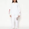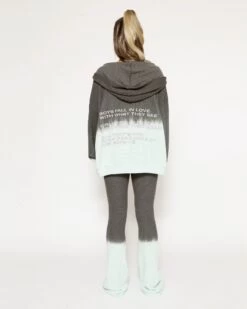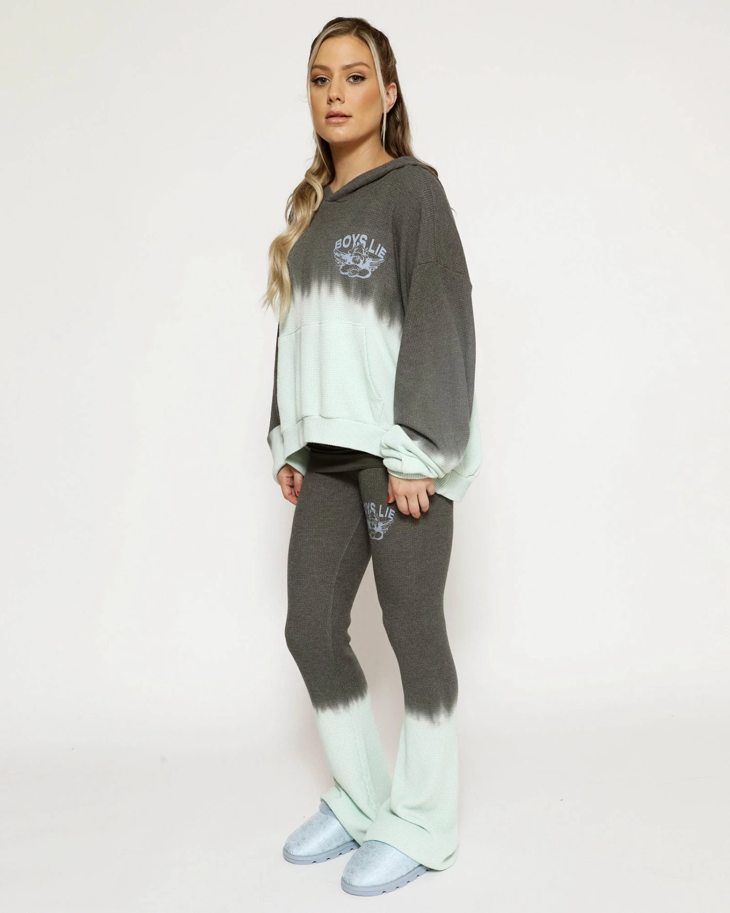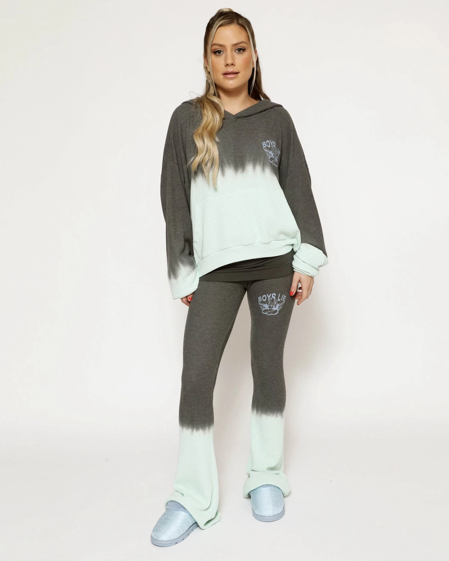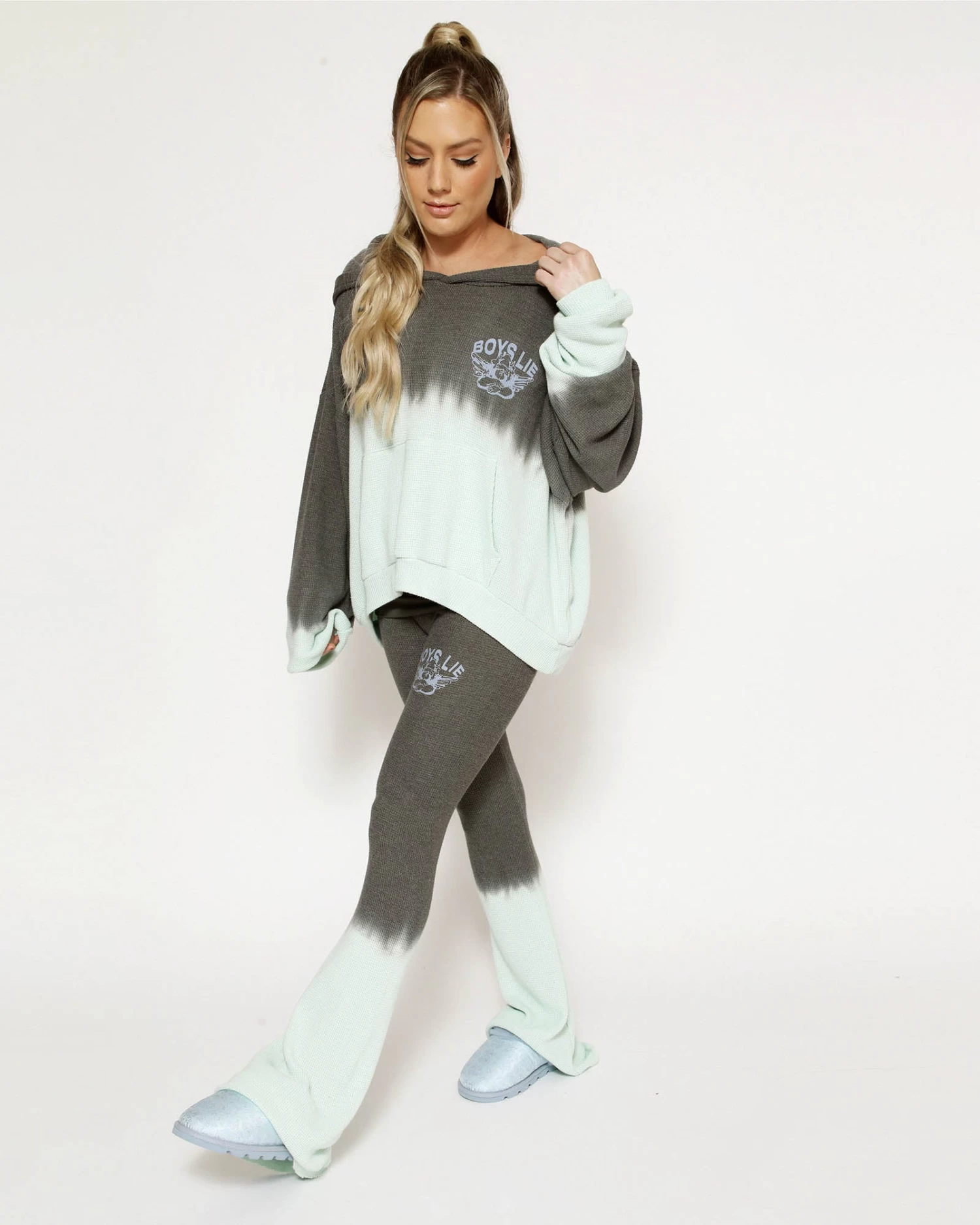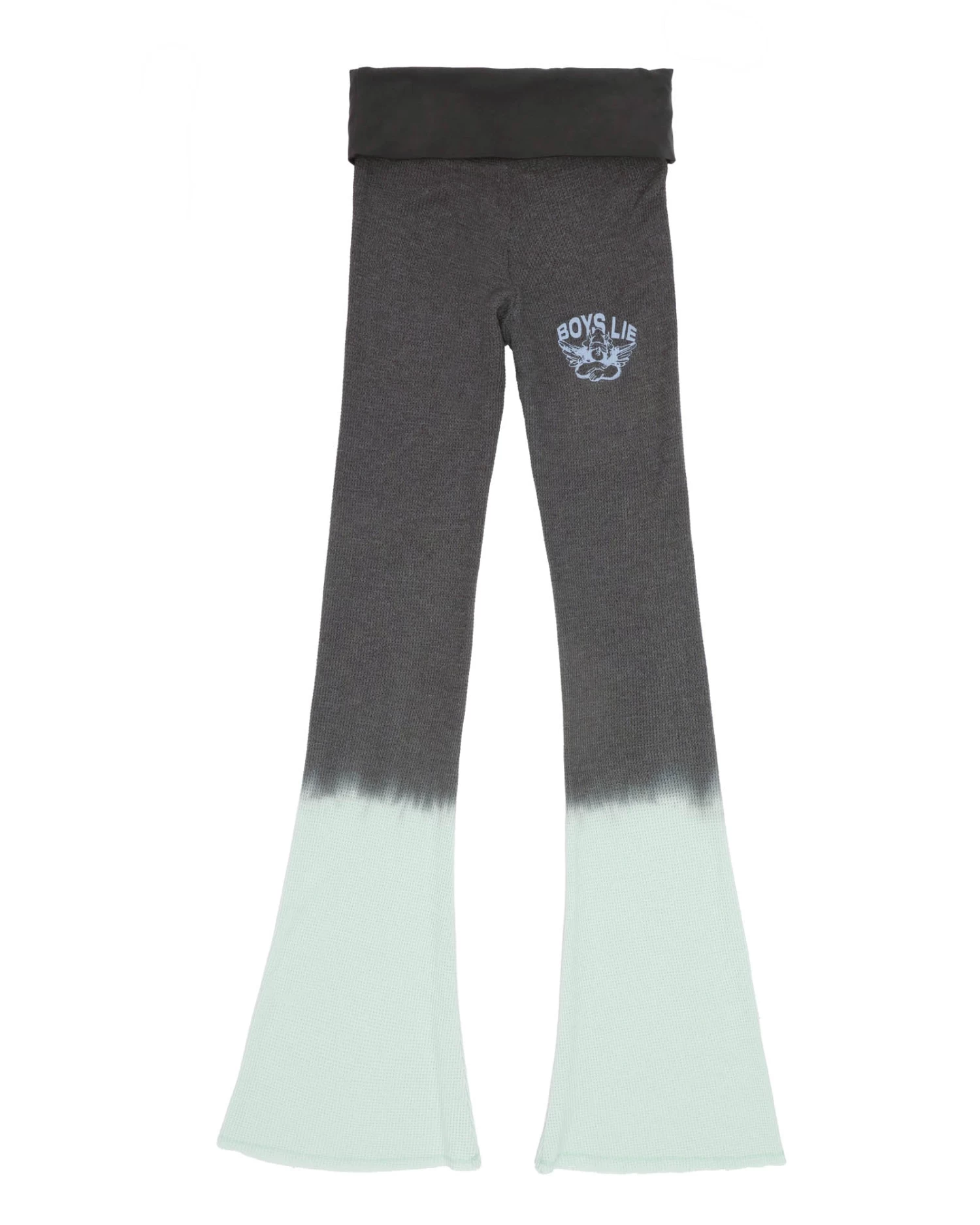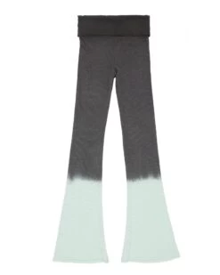 Mid rise soft thermal pants in mint green and grey dip dye. Adjustable jersey fold-over waistband and flared hem. These items are individually dyed and may have slight color variations.Â